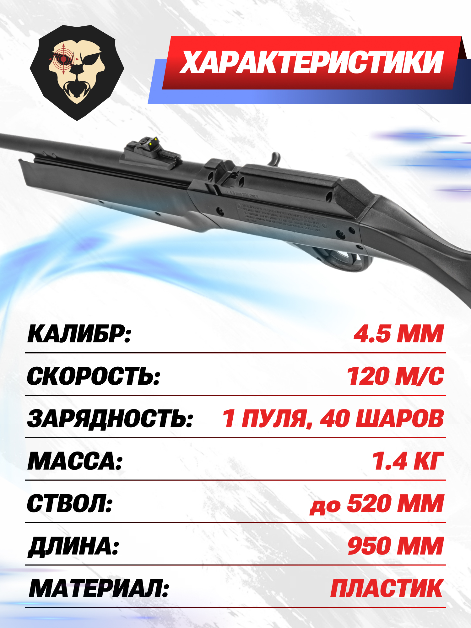 Винтовка Borner 4 5 мм выдает достаточную для нужд развлекательной стрельбы, скорость - 120 метров в секунду. При этом изделие отвечает требованиям российского законодательства - дульная энергия не превышает 3 Дж, благодаря чему винтовка относится к категории КСОИ и доступна совершеннолетним пользователям без лицензии.
