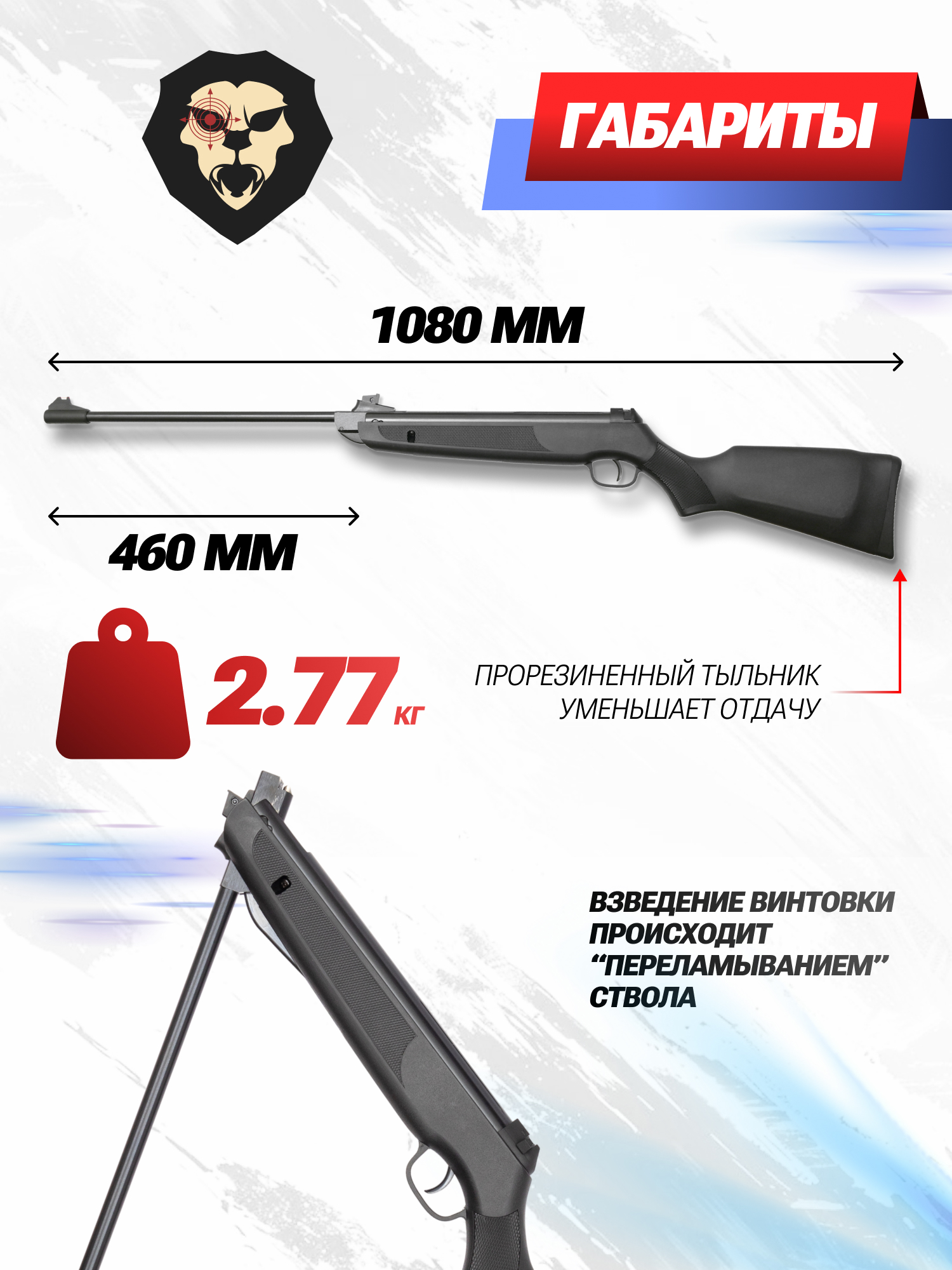 Ложе винтовки выполнено из технологичного пластика, облегчающего общий вес модели. Прорезиненные элементы в местах удержания создают цепкость хвата, повышая тем самым удобство удержания вкладки и переламывания ствола. Винтовка также оснащена предохранителем, чтобы уберечь пользователя от незапланированного спуска скобы, а на конце бланка установлен саундмодератор, делающий звук выстрела тише.