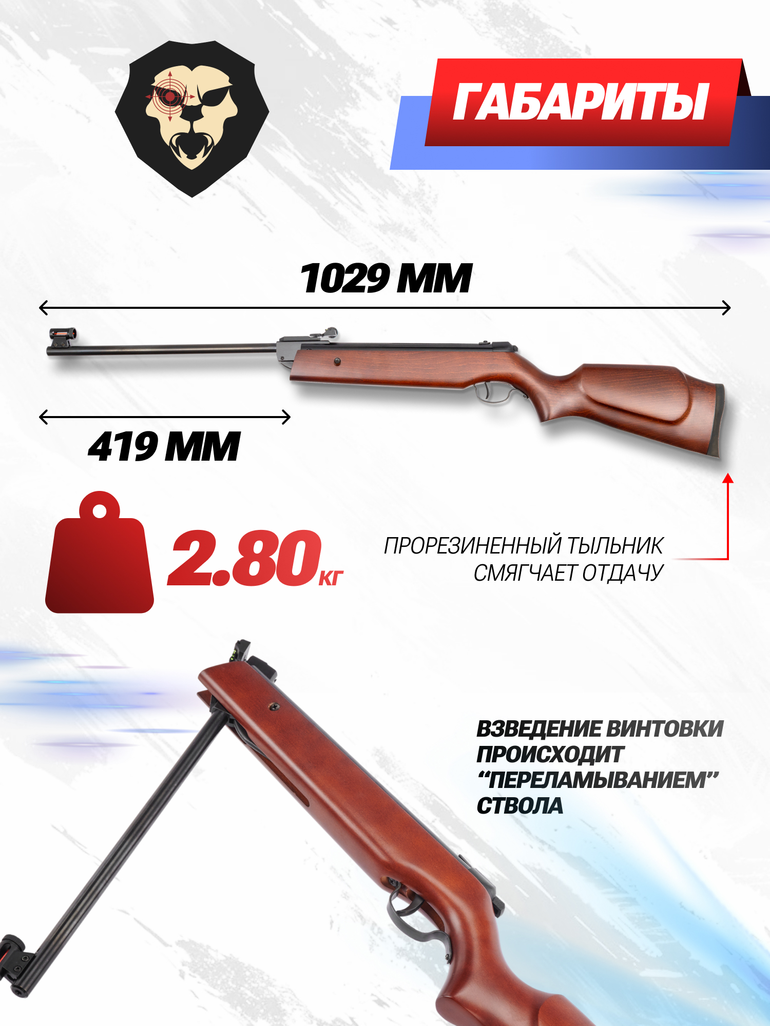 При длине ствола 419 миллиметров винтовка является компактной и ее общий габарит составляет 1029 миллиметров. Комфортное удержание оружия обеспечивается за счет эргономичного ложа с формой приклада «Монте Карло», а наличие прорезиненного затыльника компенсирует импульс отдачи, уменьшая подброс ствола и ударную нагрузку на плечо стрелка.