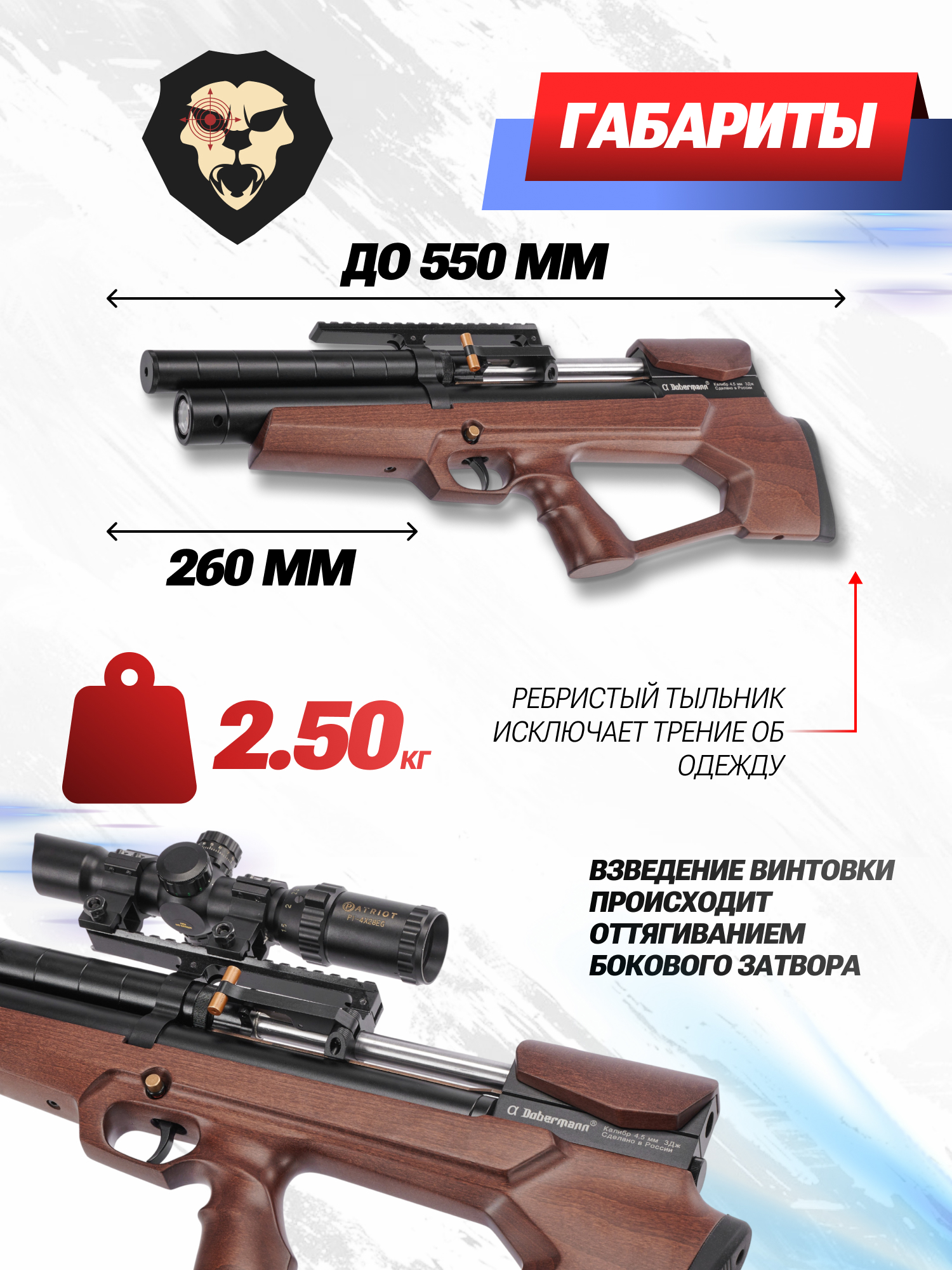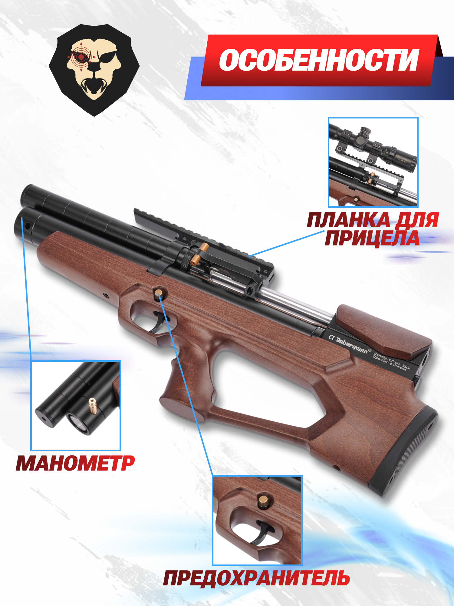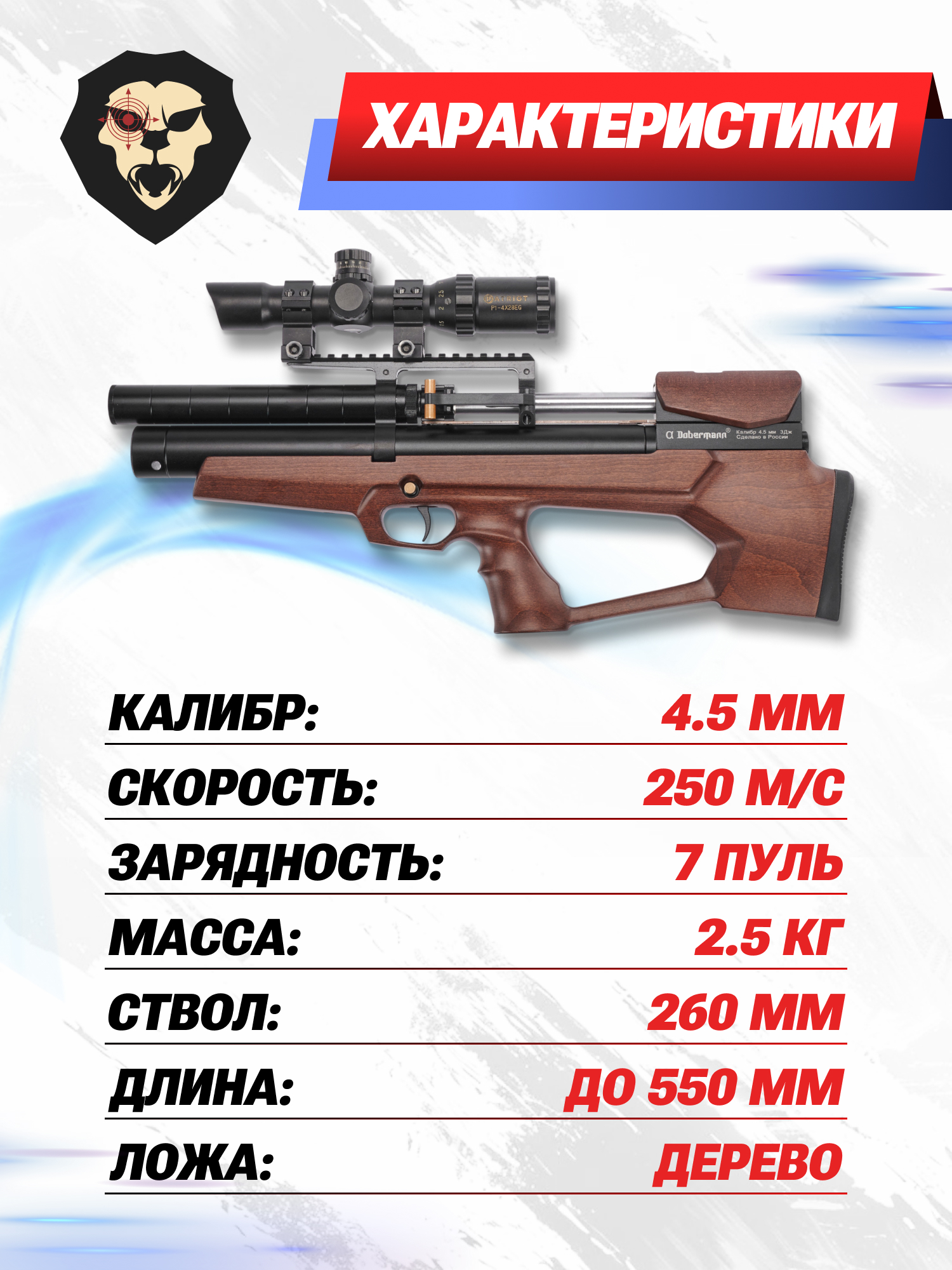 Информация о товаре "Пневматическая винтовка Dobermann Alfa БуллПап 4.5 мм (260 мм, полигональные нарезы, дерево, передний взвод)" носит ознакомительный характер, и не является публичной офертой, определяемой положениями Статьи 437 Гражданского кодекса Российской Федерации, характеристики, внешний вид, цвет и комплектация могут быть изменены производителем без уведомления.