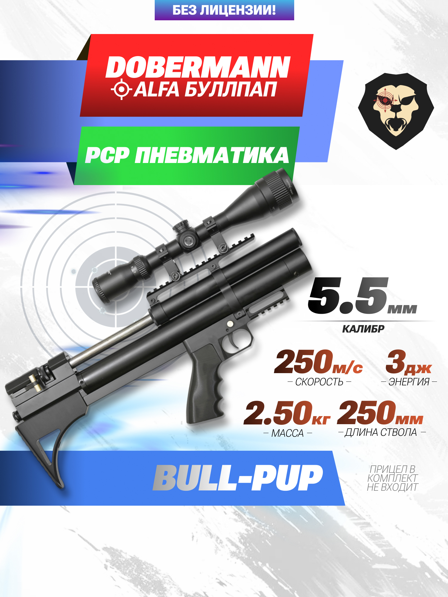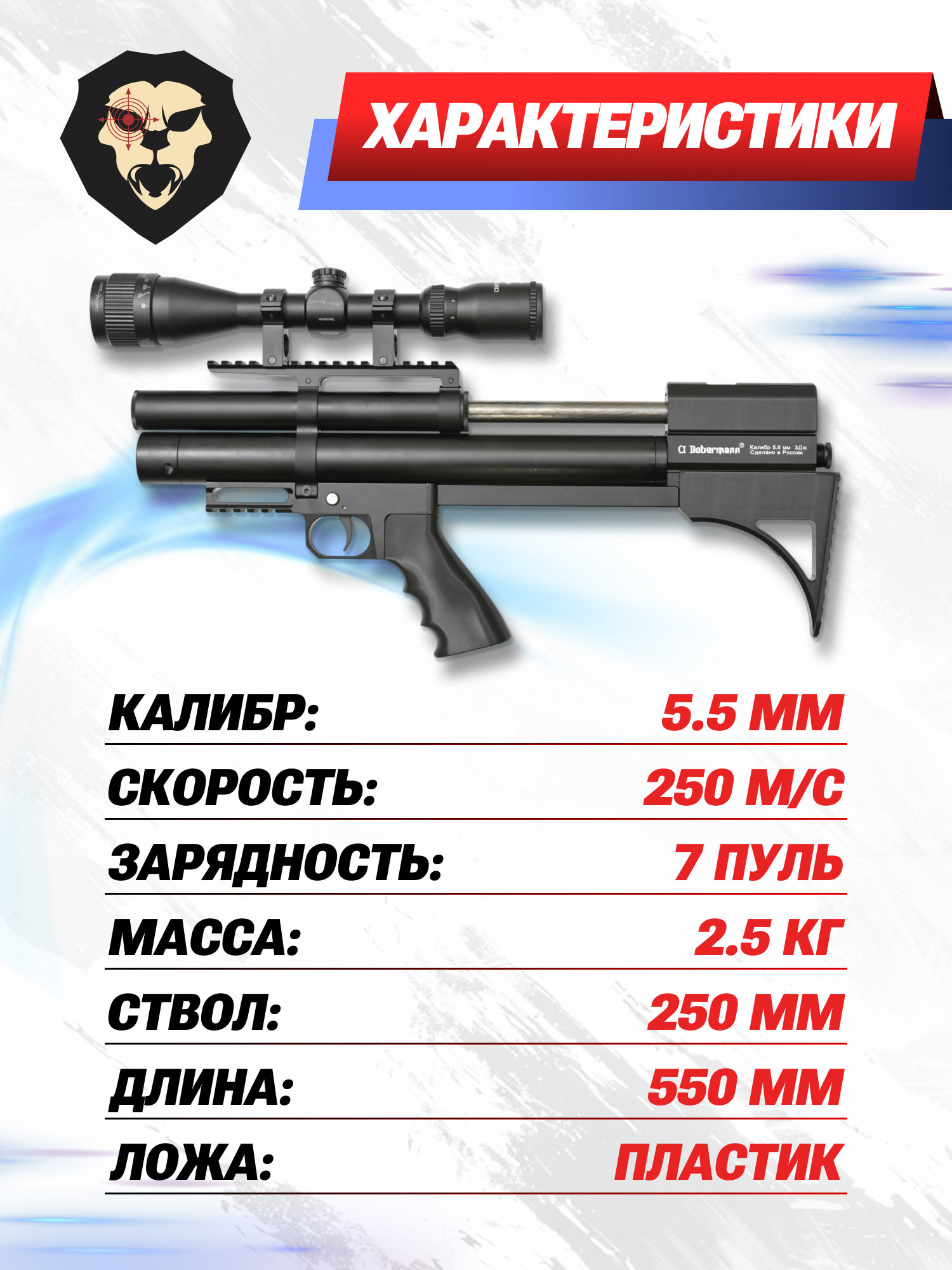 В момент выстрела снаряд, заряженный в воздушку Доберман Альфа РСР разгоняется до скорости больше 250 м/с. При этом, для свободной продажи без оформления лицензии мощность воздушек от Добермана сокращается до трех Джоулей энергии.