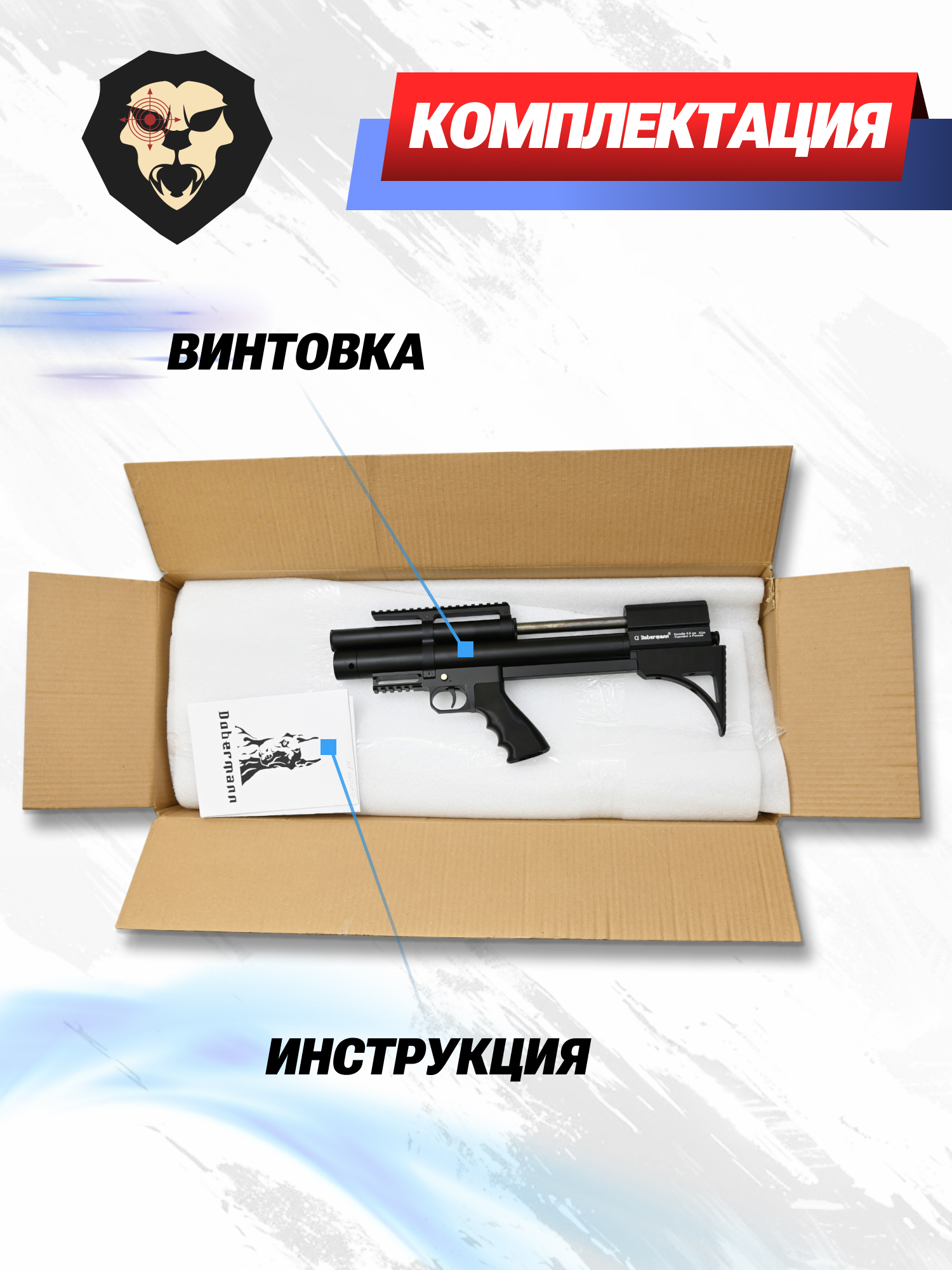 | Комплектация | Винтовка, упаковка, заправочный штуцер быстросъемный 1 шт, заправочный штуцер резьбовой - 1 шт, краткая документация, магазин - 1 шт, набор уплотнителей, копия сертификата (по запросу покупателя) |
