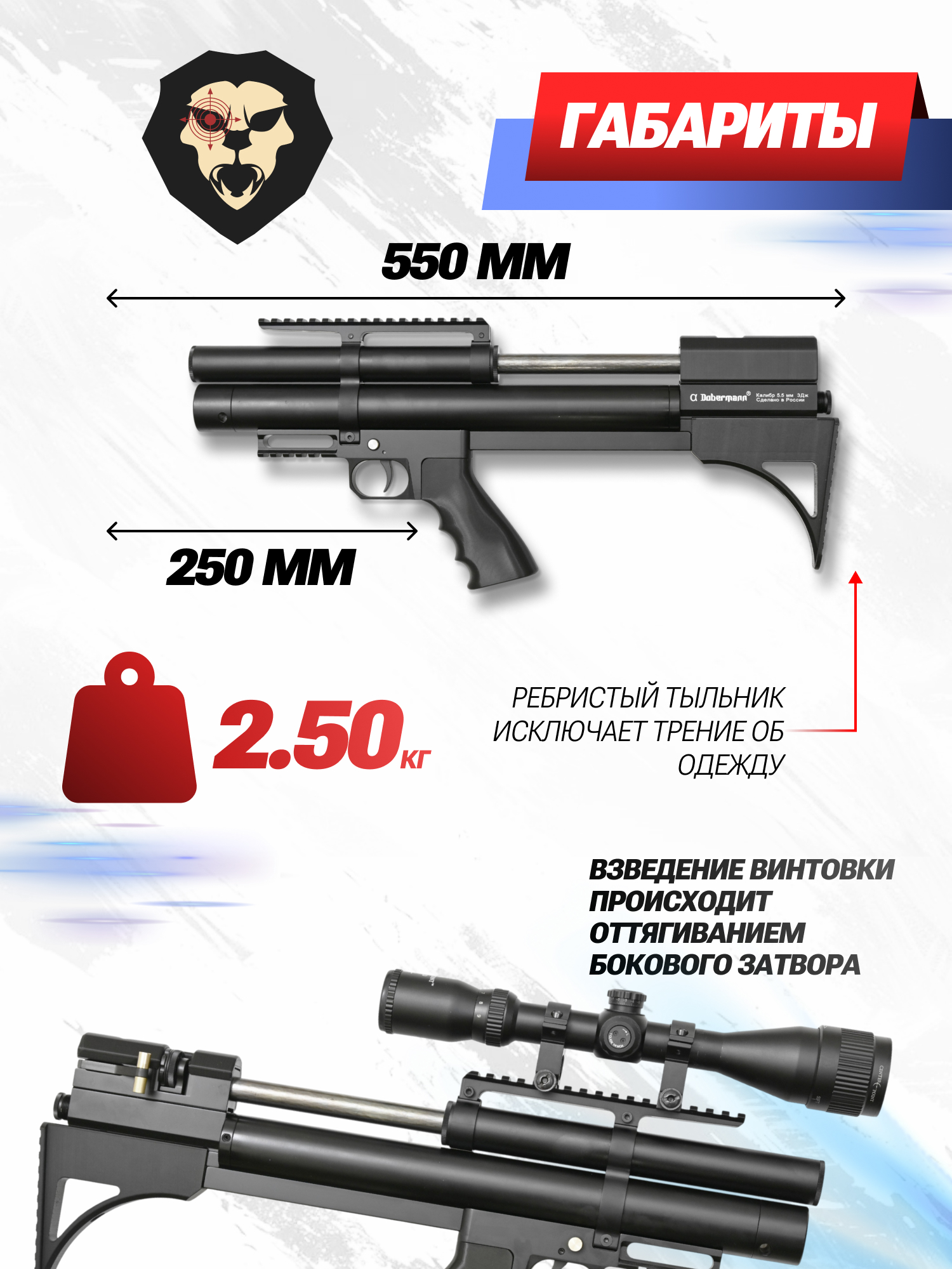 Информация о товаре "Пневматическая винтовка Dobermann Alfa Буллпап 5.5 мм (250 мм, задний взвод, стандартные нарезы)" носит ознакомительный характер, и не является публичной офертой, определяемой положениями Статьи 437 Гражданского кодекса Российской Федерации, характеристики, внешний вид, цвет и комплектация могут быть изменены производителем без уведомления.