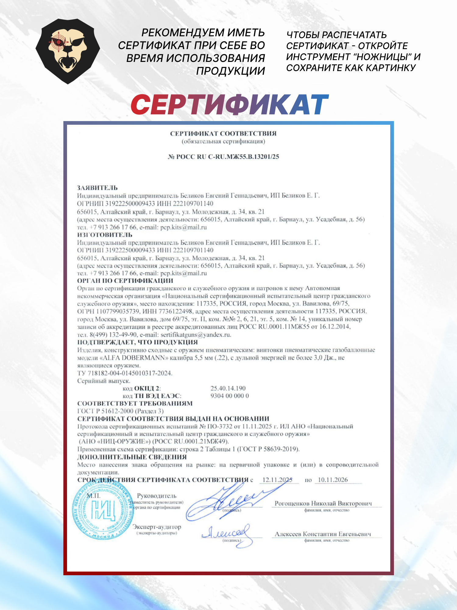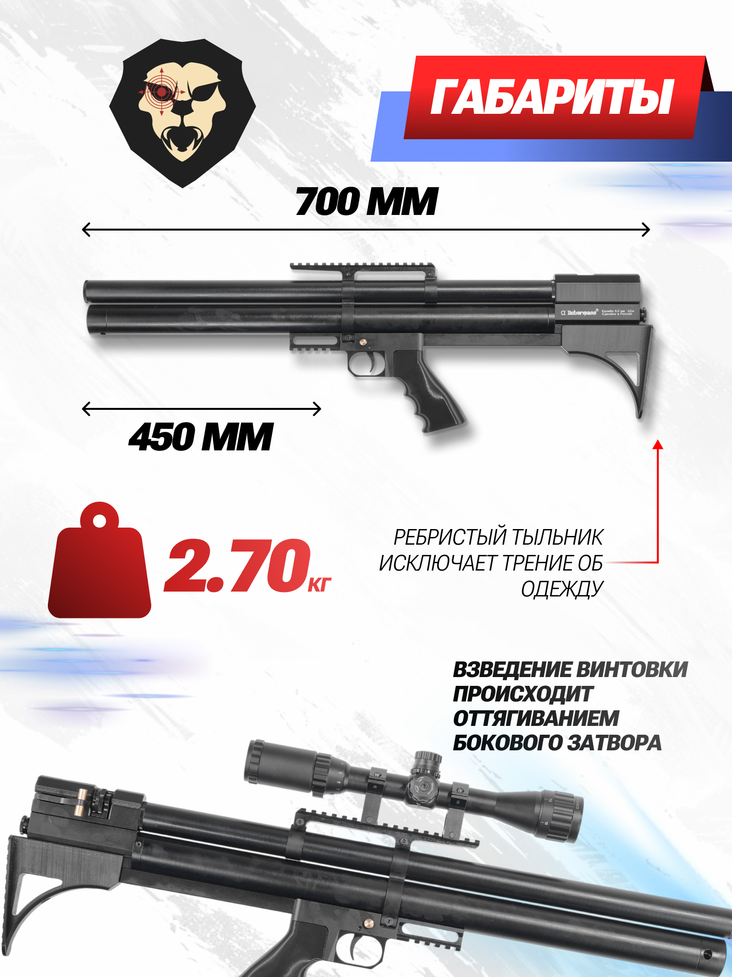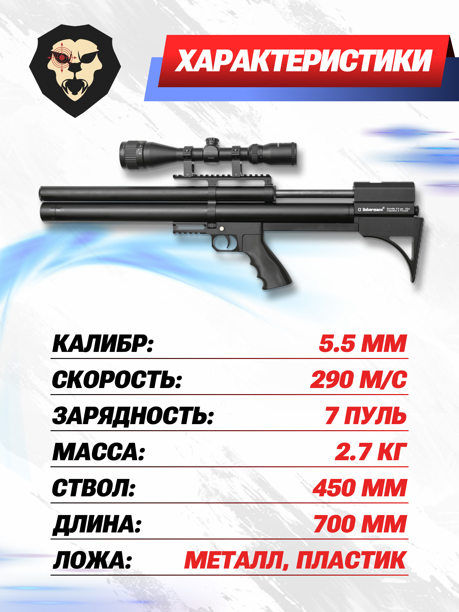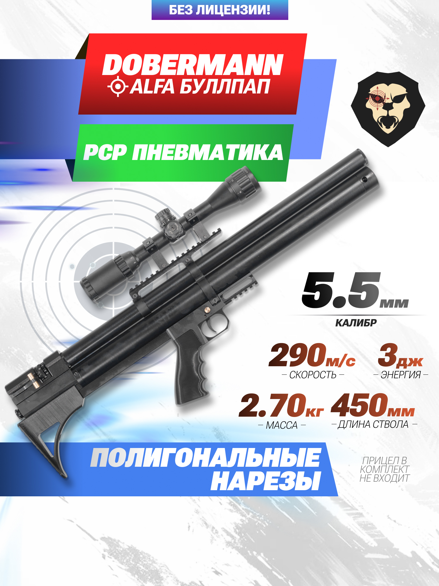 Информация о товаре "Пневматическая винтовка Dobermann Alfa Буллпап 5.5 мм (450 мм, задний взвод, полигональные нарезы)" носит ознакомительный характер, и не является публичной офертой, определяемой положениями Статьи 437 Гражданского кодекса Российской Федерации, характеристики, внешний вид, цвет и комплектация могут быть изменены производителем без уведомления.