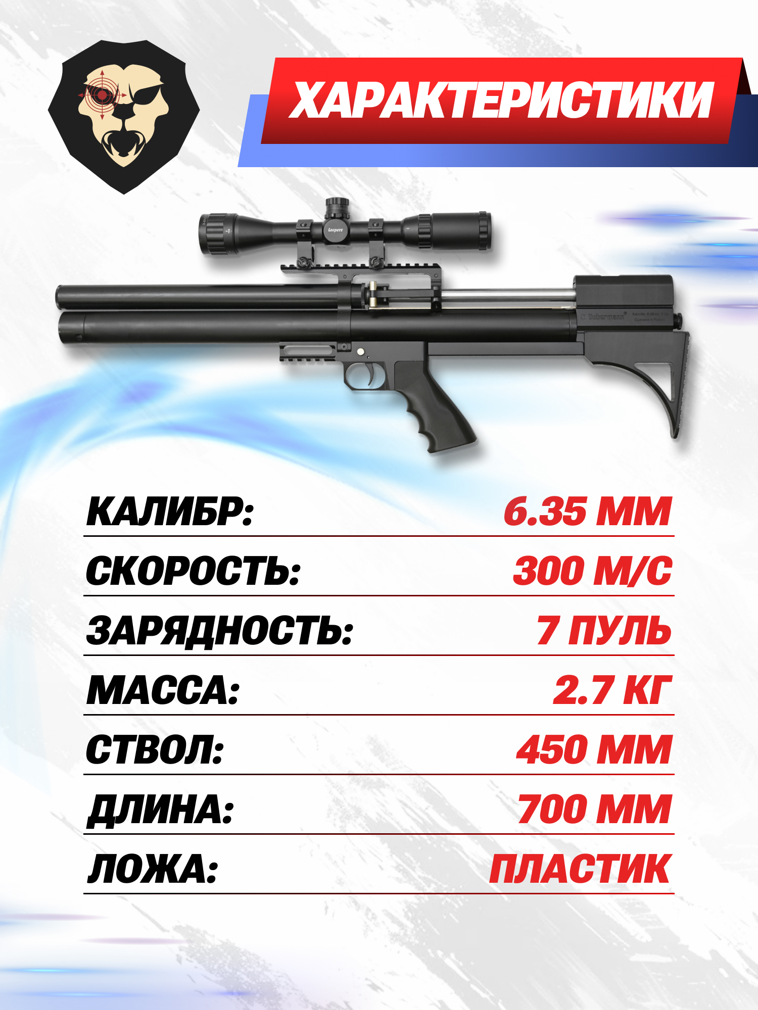 Информация о товаре "Пневматическая винтовка Dobermann Alfa Буллпап 6.35 мм (450 мм, передний взвод, классические нарезы)" носит ознакомительный характер, и не является публичной офертой, определяемой положениями Статьи 437 Гражданского кодекса Российской Федерации, характеристики, внешний вид, цвет и комплектация могут быть изменены производителем без уведомления.