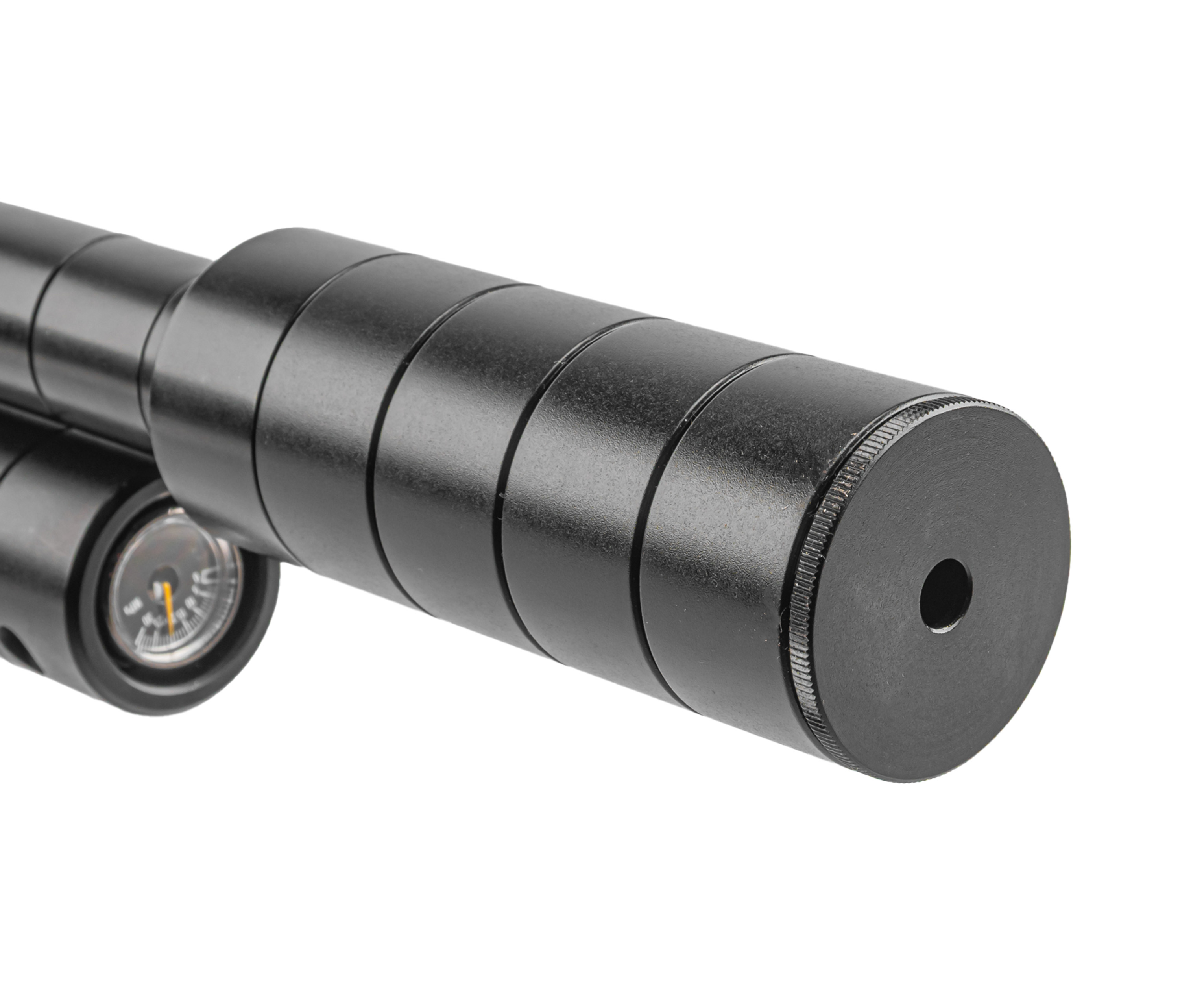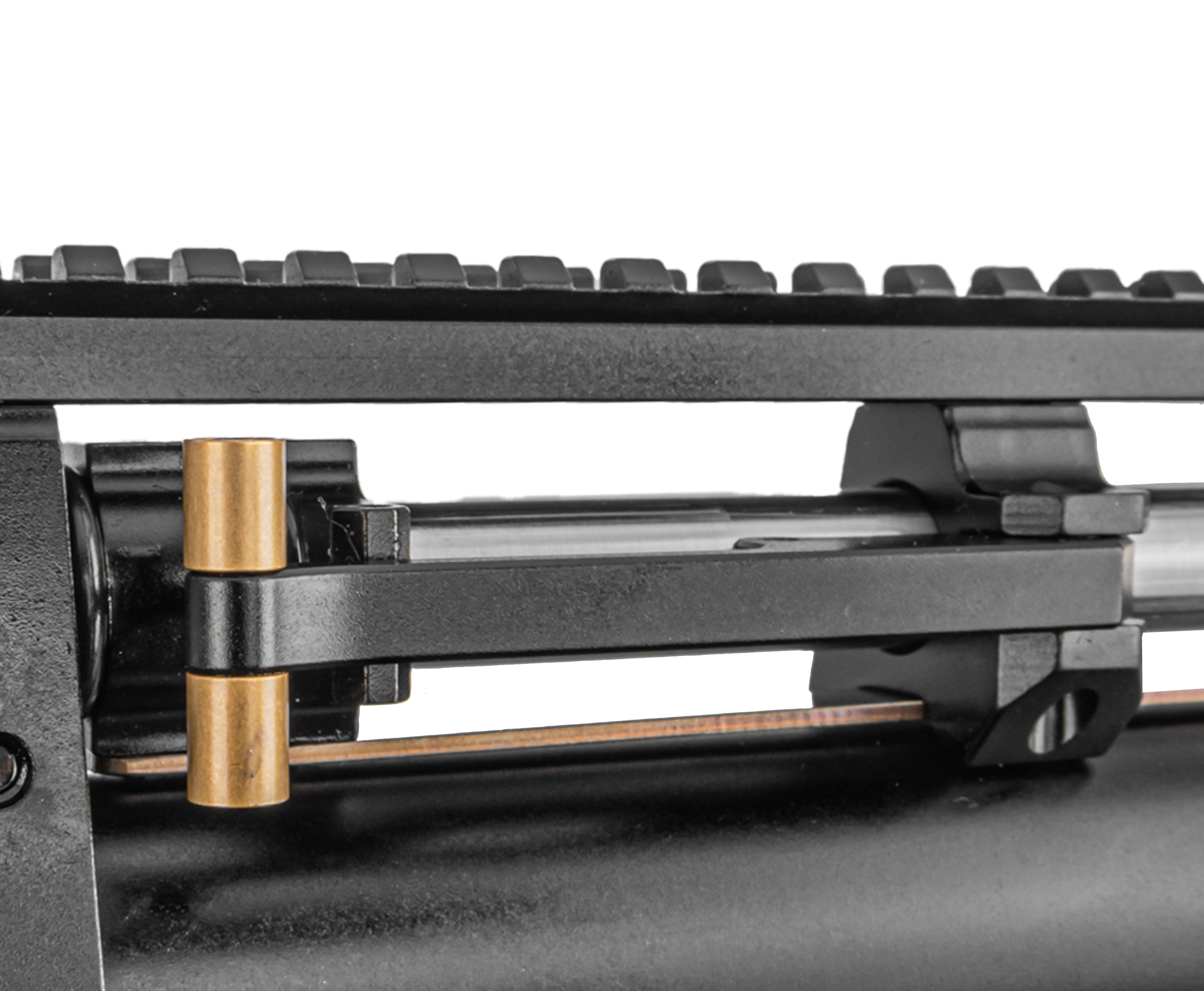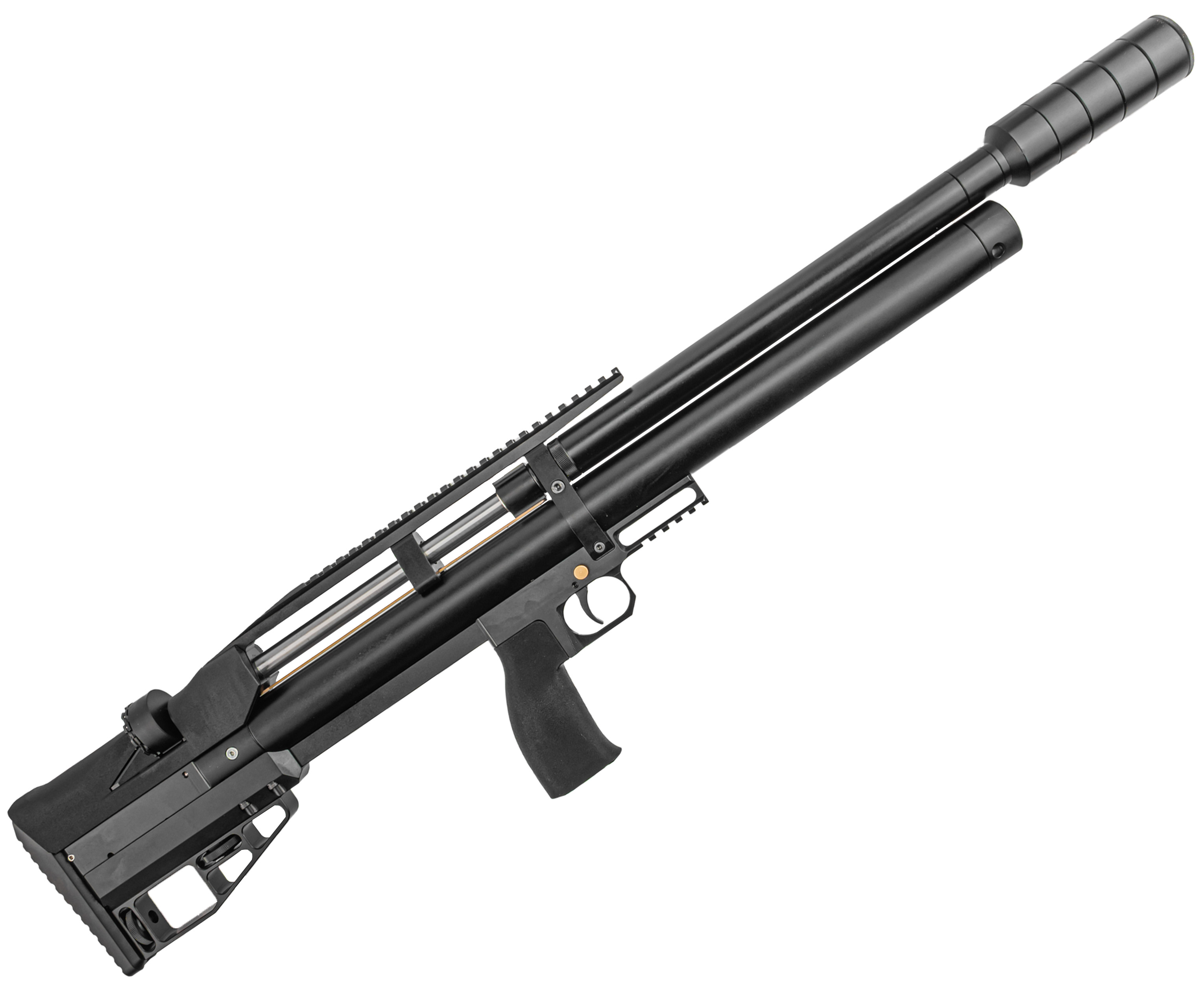 Воздух, необходимый для работы ПСП, предварительно нагнетается насосами ВД в подствольный резервуар. В представленной вариации имеется стандартный линейный баллон на 345 кубических сантиметров. Используется прямоточная схема газораспределения, а предельное рабочее давление в системе составляет 250 Бар - этот показатель можно оперативно контролировать встроенным с торцевой стороны ресивера манометром.