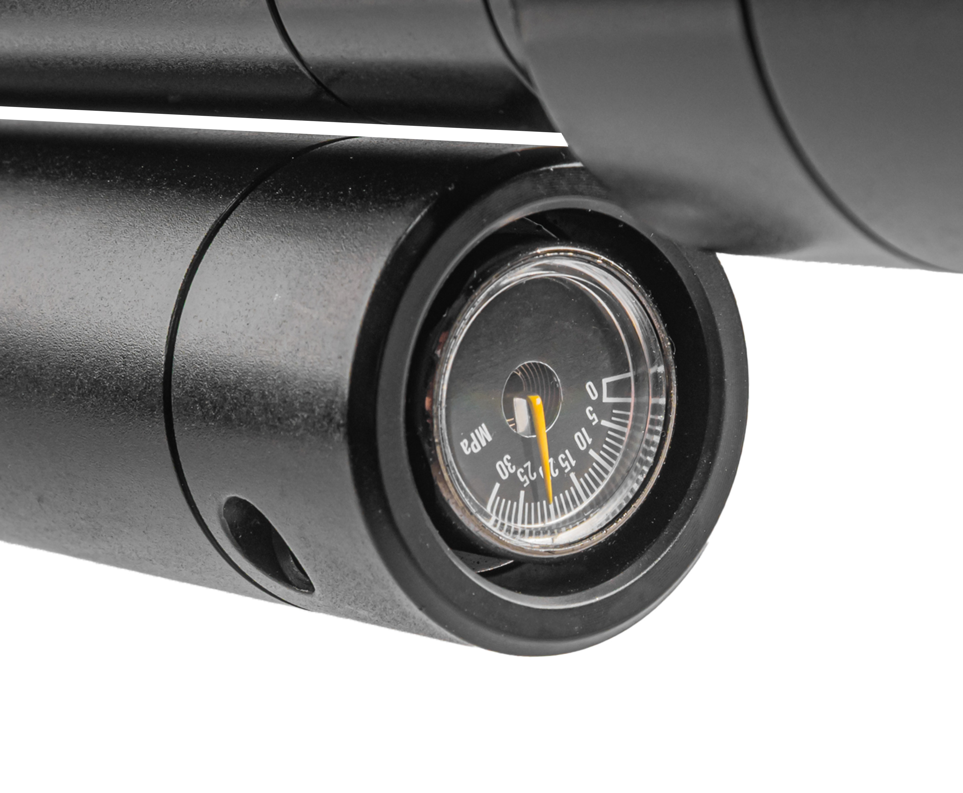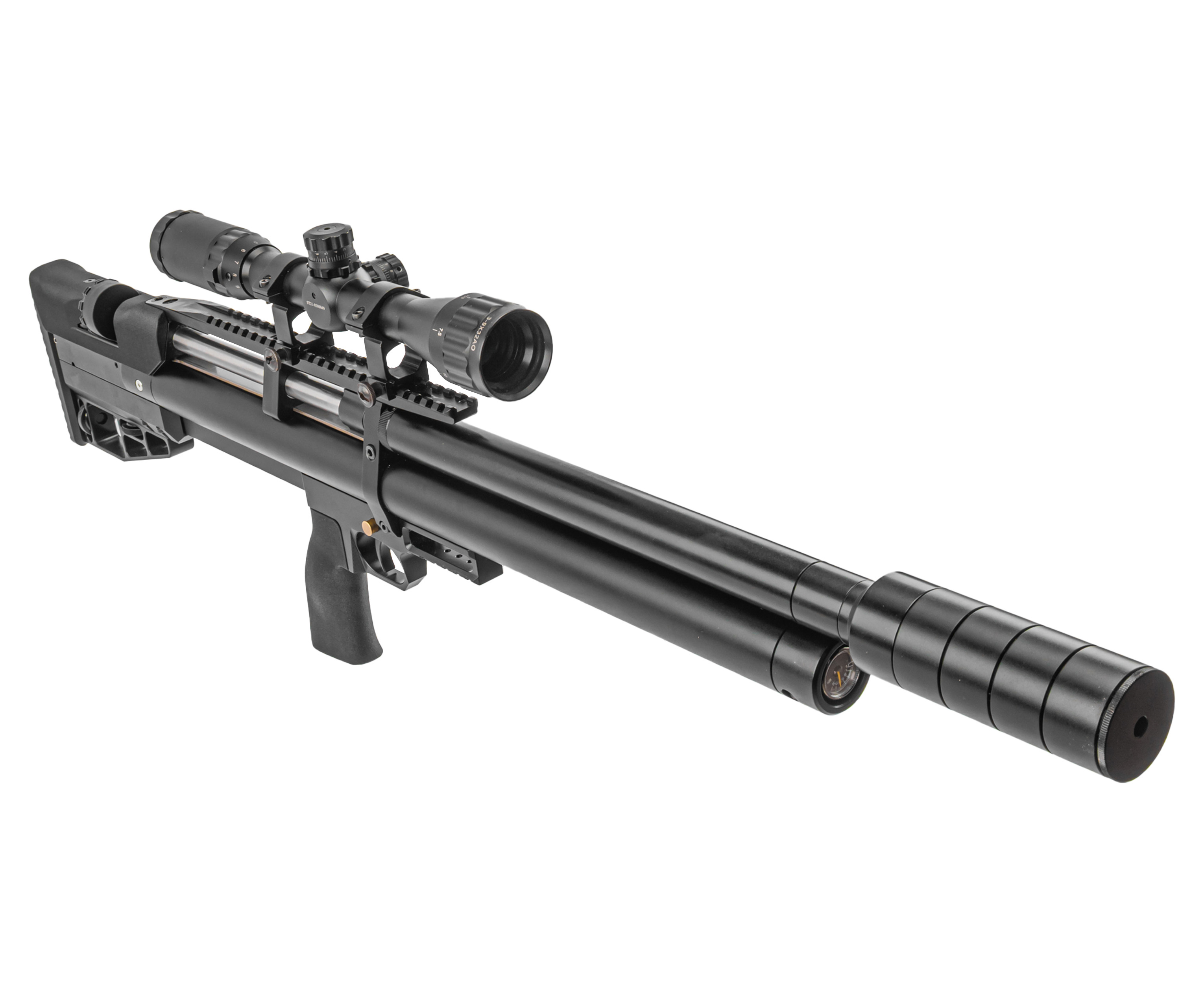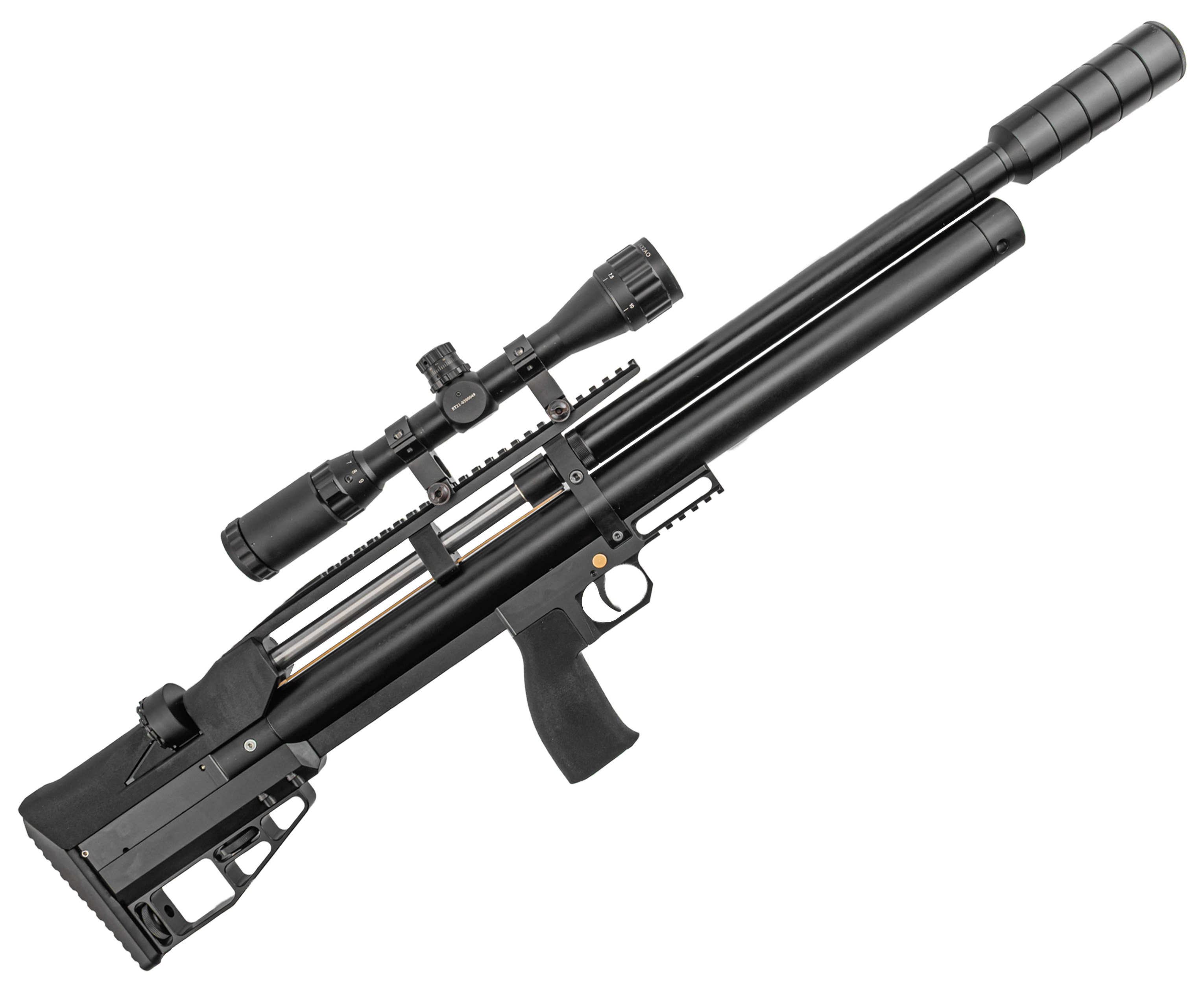 Воздух, необходимый для работы ПСП, предварительно нагнетается насосами ВД в подствольный резервуар. В представленной вариации имеется стандартный линейный баллон на 345 кубических сантиметров. Используется прямоточная схема газораспределения, а предельное рабочее давление в системе составляет 250 Бар - этот показатель можно оперативно контролировать встроенным с торцевой стороны ресивера манометром.