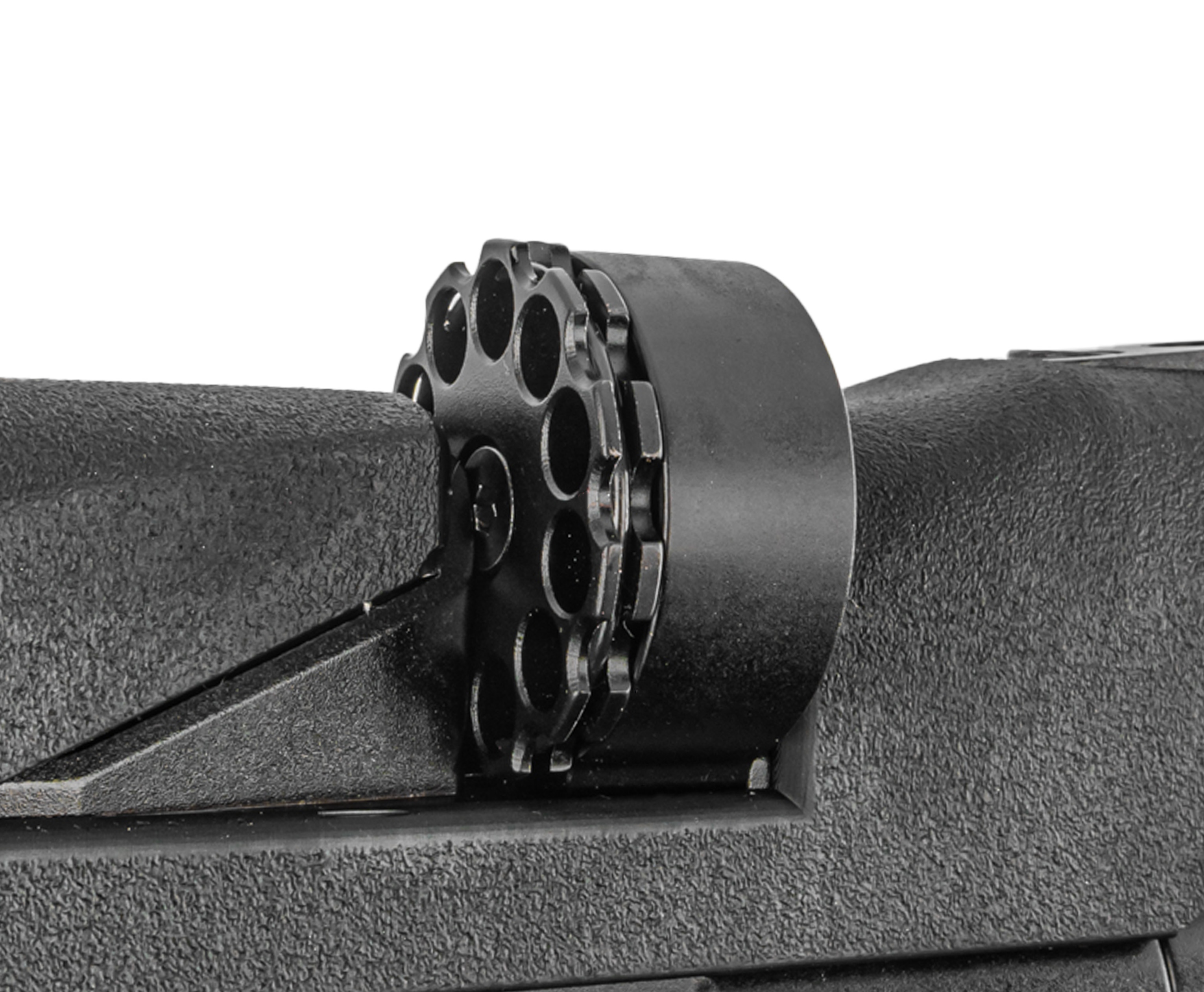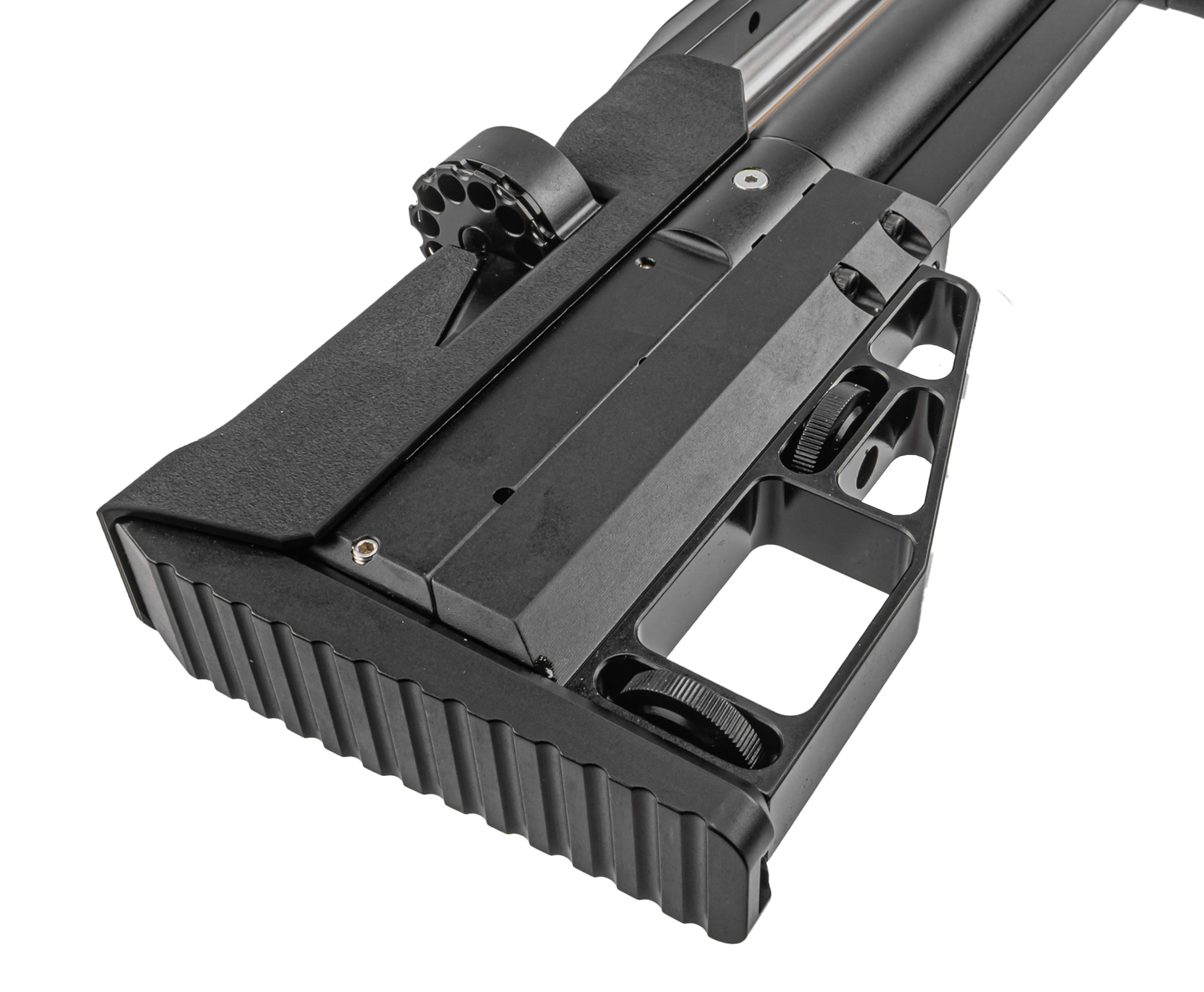 Пневматика Alfa Dobermann БуллПап Hunter также обзавелась вместительным магазином на 10 ячеек. Накопитель с автоматическим кондуктором поворота фиксируется в приемнике с правой стороны приклада. Последний примечателен полимерным подщечником и затыльником на отдельном каркасе с функцией регулировки вылета и высоты, что вкупе с рукоятью прямого форм-фактора дает добиться максимально комфортного удержания и корректной вкладки.