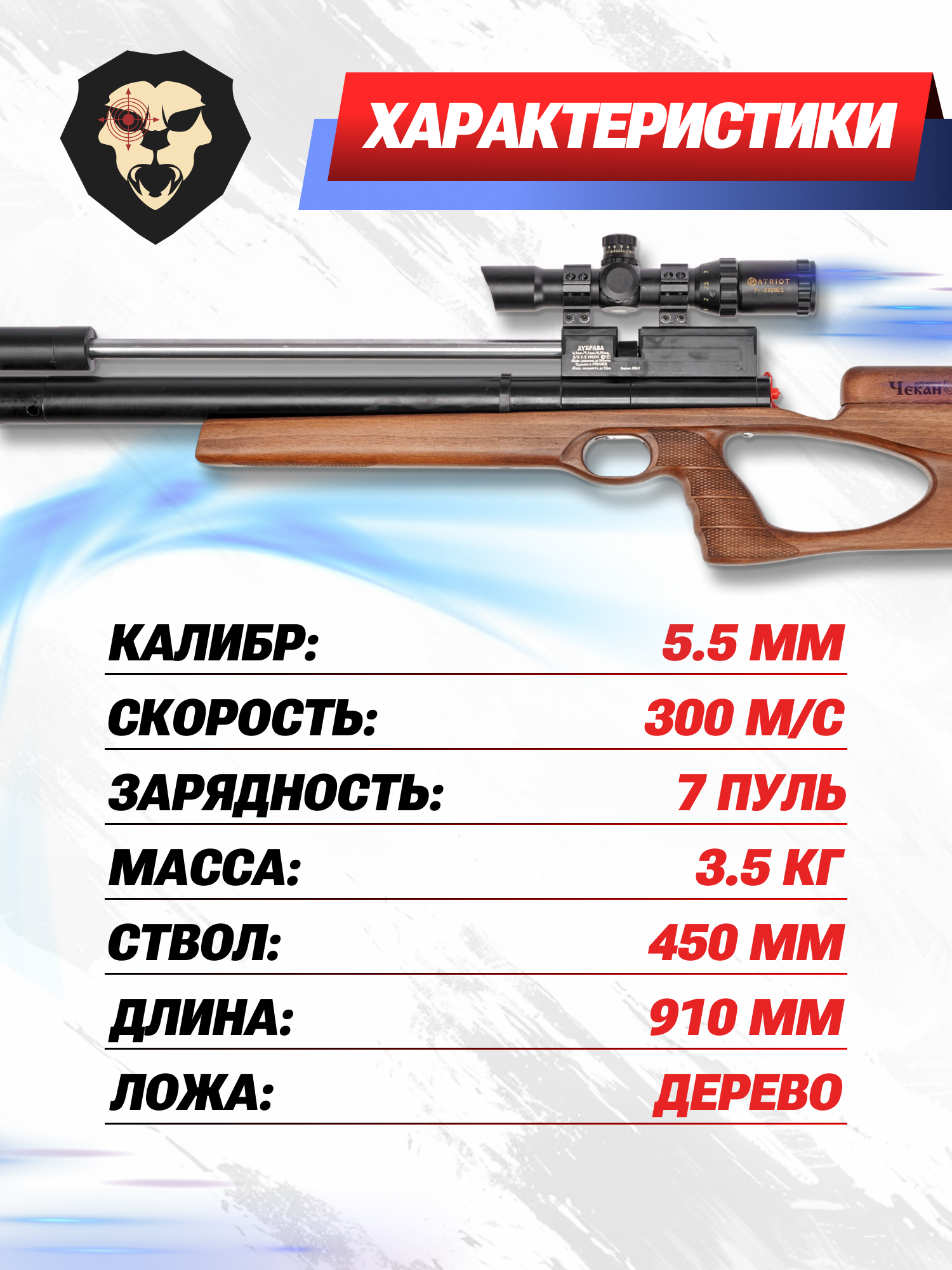 Информация о товаре "Пневматическая винтовка Дубрава Чекан Карабин 5.5 мм VX (450 мм, дерево, магнум)" носит ознакомительный характер, и не является публичной офертой, определяемой положениями Статьи 437 Гражданского кодекса Российской Федерации, характеристики, внешний вид, цвет и комплектация могут быть изменены производителем без уведомления.