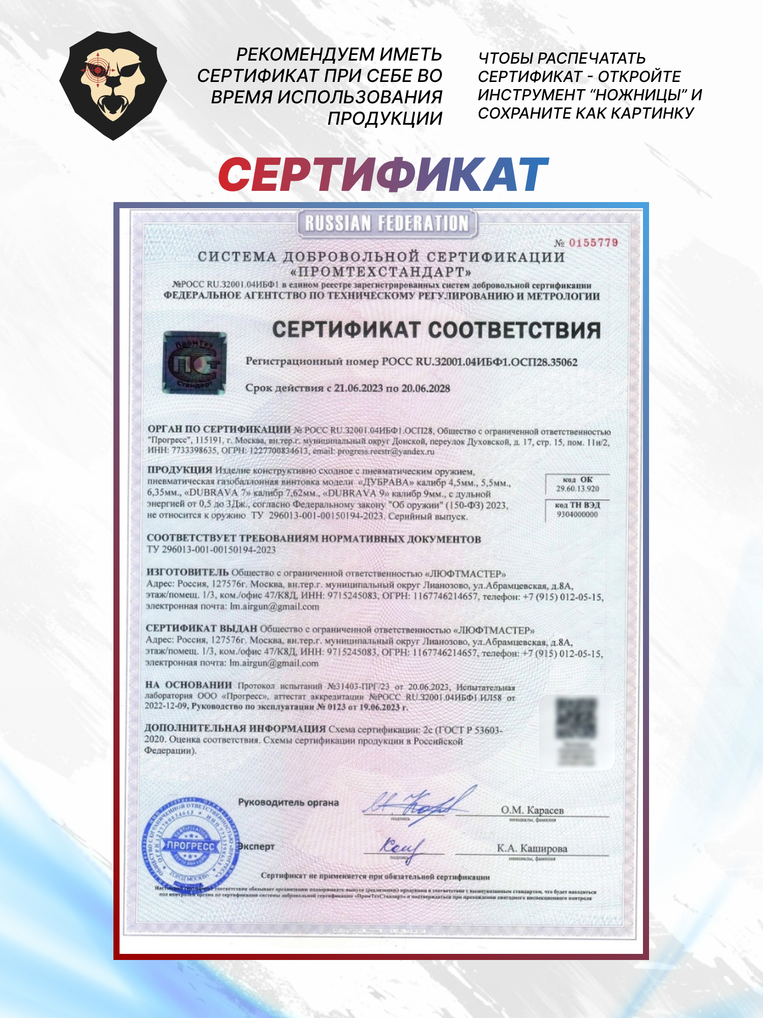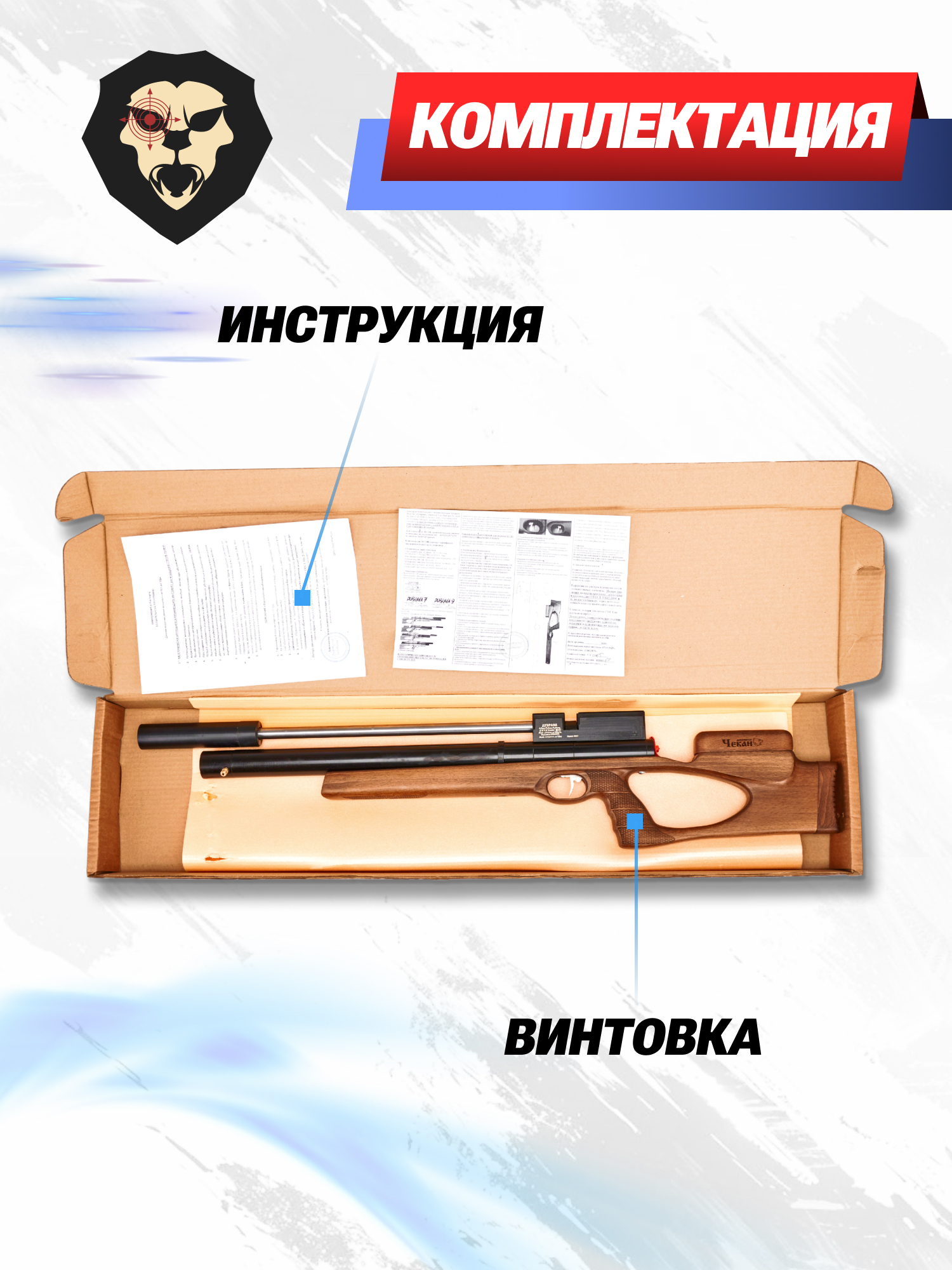 | Комплектация | Винтовка, пульный лоток, заправочный штуцер, упаковка, краткая документация, копия сертификата (по запросу покупателя) |