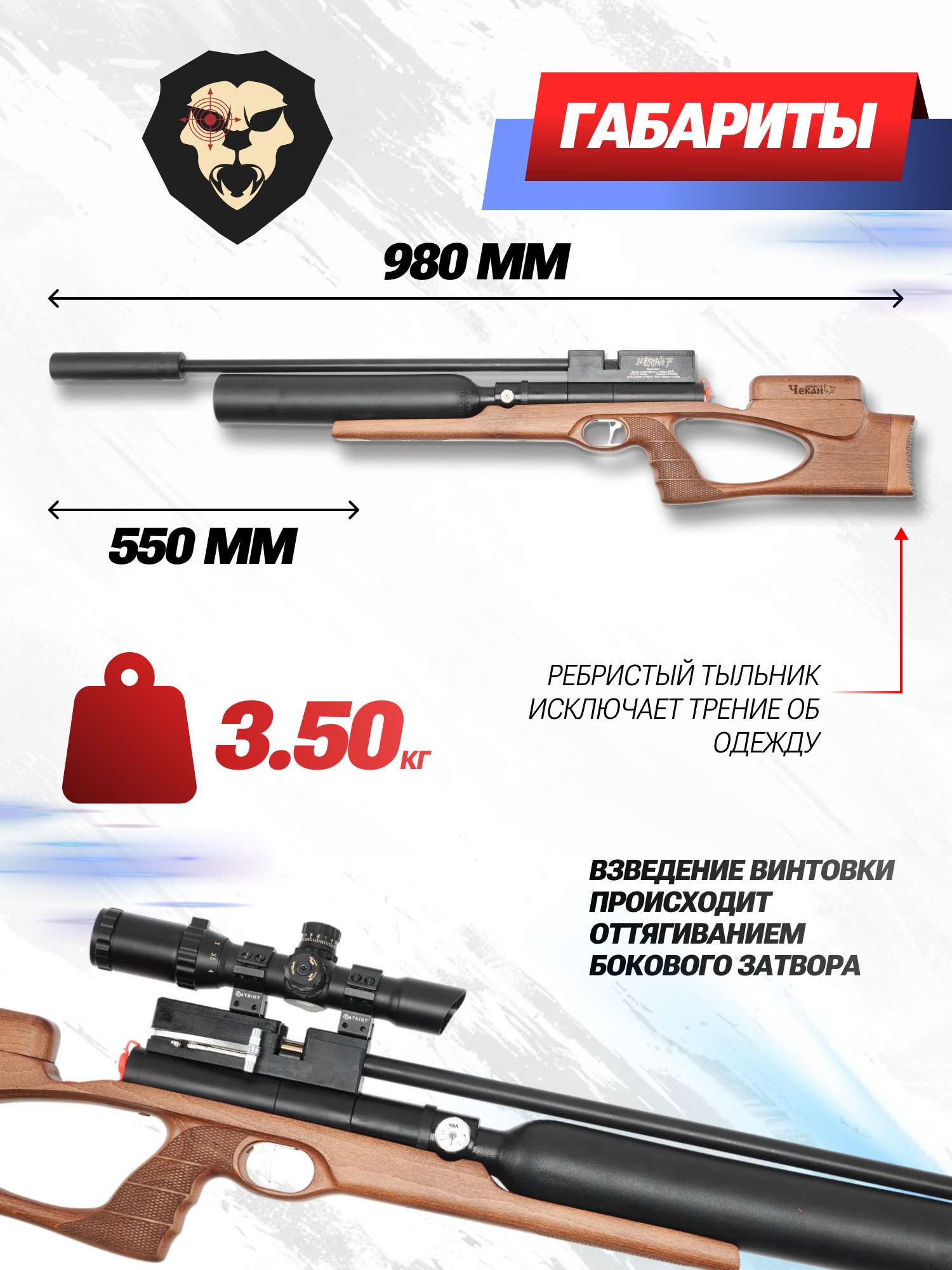 Пополняя ассортимент классических карабинов с предварительным заполнением воздухом встроенного ресивера, фирма выпустила обновленную линейку пневматики Чекан. В рассматриваемом исполнении образец оснащается толстостенной колбой увеличенного объема 480 куб. см, что позволяет совершить большее количество выстрелов до повторной заправки.