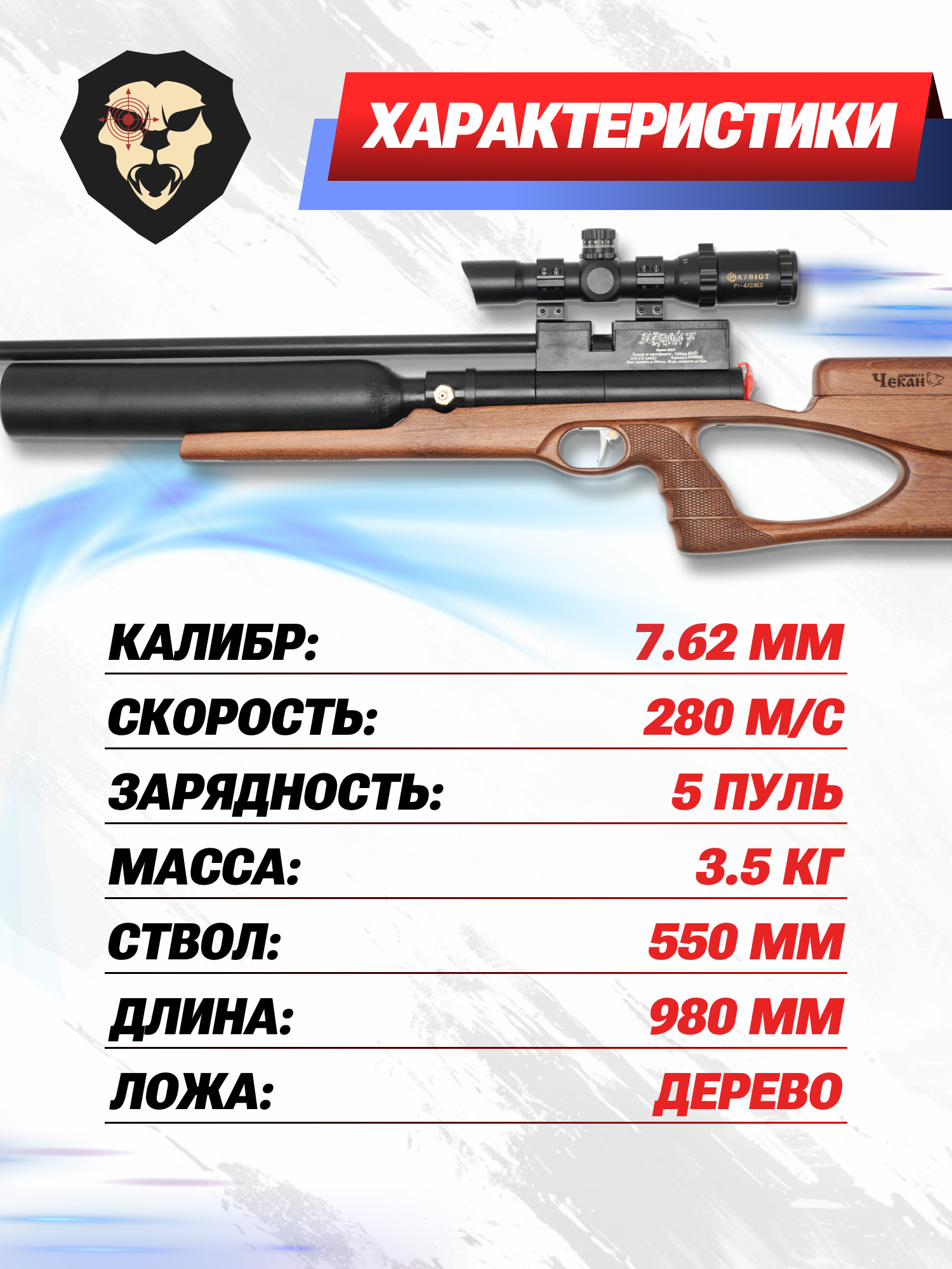 Информация о товаре "Пневматическая винтовка Дубрава Чекан Карабин Магнум Колба 7.62 мм VX (550 мм, дерево)" носит ознакомительный характер, и не является публичной офертой, определяемой положениями Статьи 437 Гражданского кодекса Российской Федерации, характеристики, внешний вид, цвет и комплектация могут быть изменены производителем без уведомления.