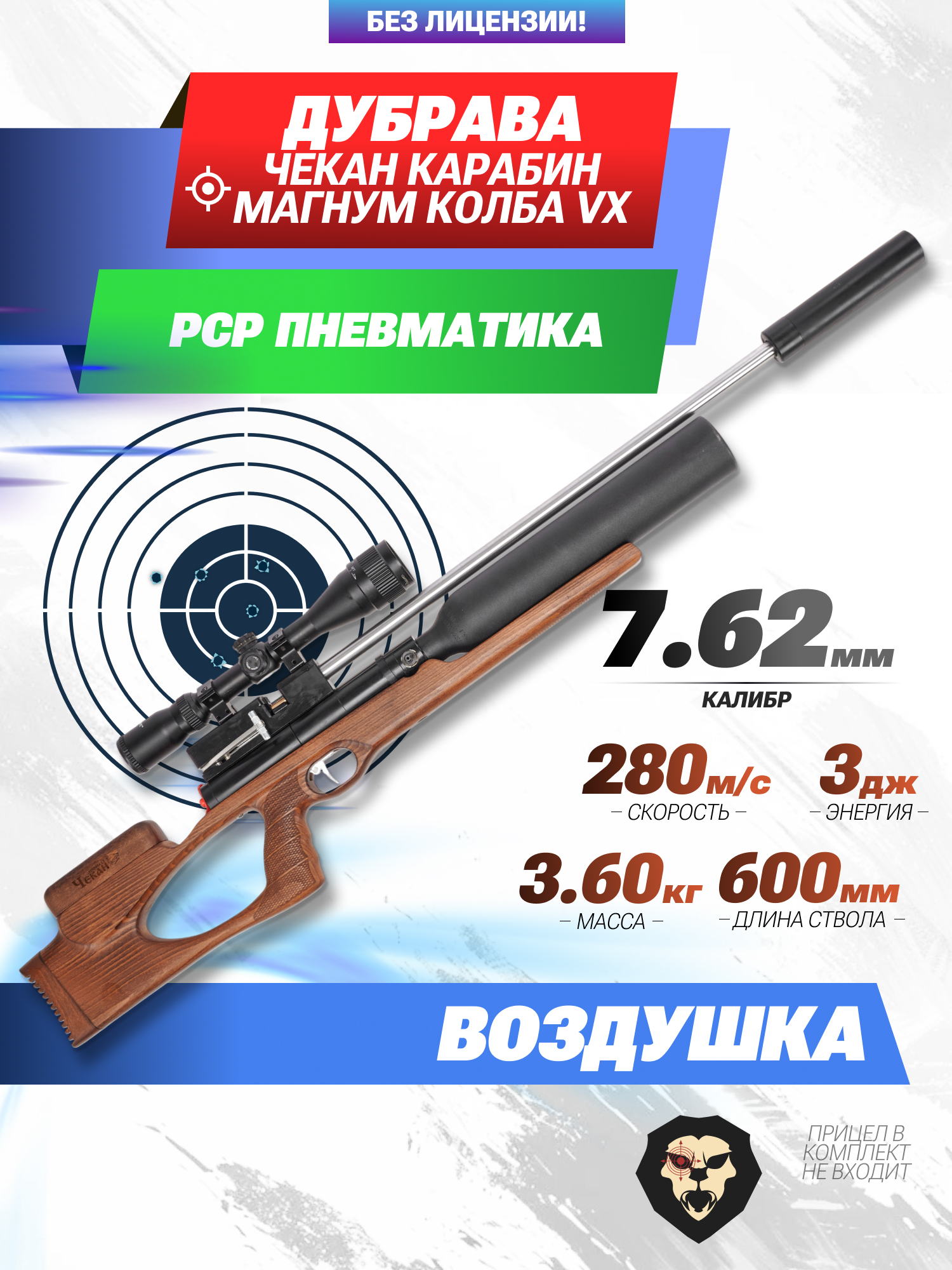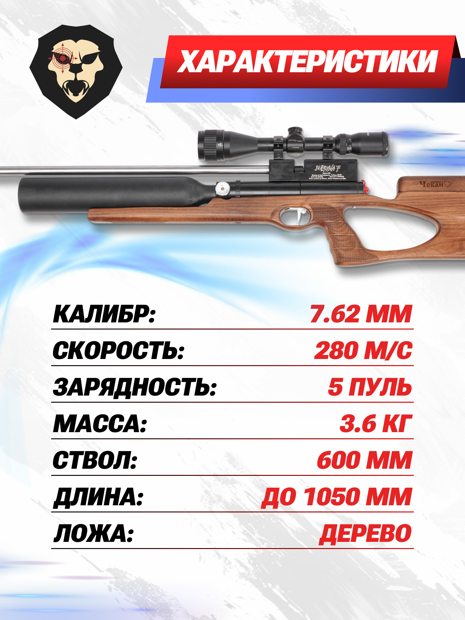 Информация о товаре "Пневматическая винтовка Дубрава Чекан Карабин Магнум Колба 7.62 мм VX (600 мм, дерево)" носит ознакомительный характер, и не является публичной офертой, определяемой положениями Статьи 437 Гражданского кодекса Российской Федерации, характеристики, внешний вид, цвет и комплектация могут быть изменены производителем без уведомления.