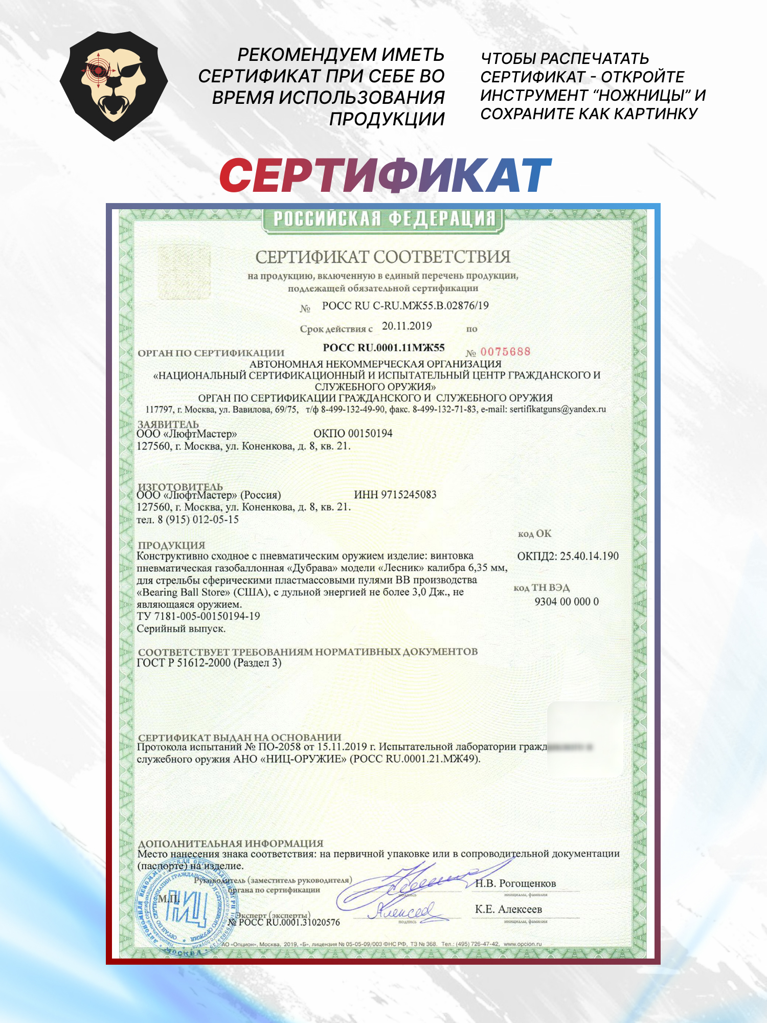| Комплектация | Винтовка, заправочный штуцер, пульный лоток, краткая документация, копия сертификата (по запросу покупателя), упаковка |