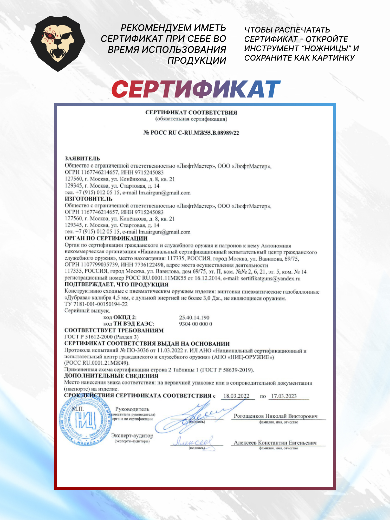 | Комплектация | Винтовка, заправочный штуцер, однозарядный пульный лоток, краткая документация, копия сертификата (по запросу покупателя), упаковка |