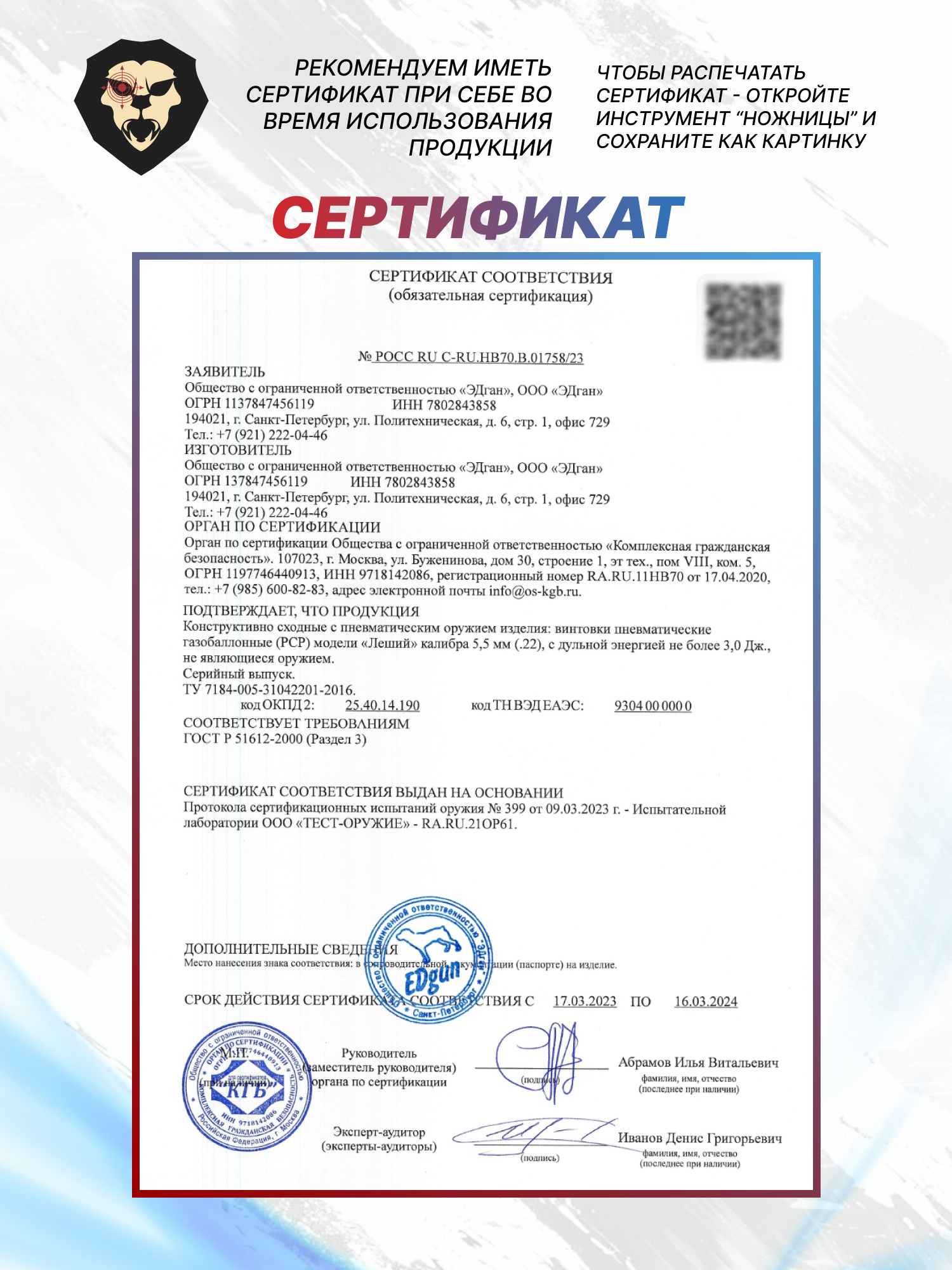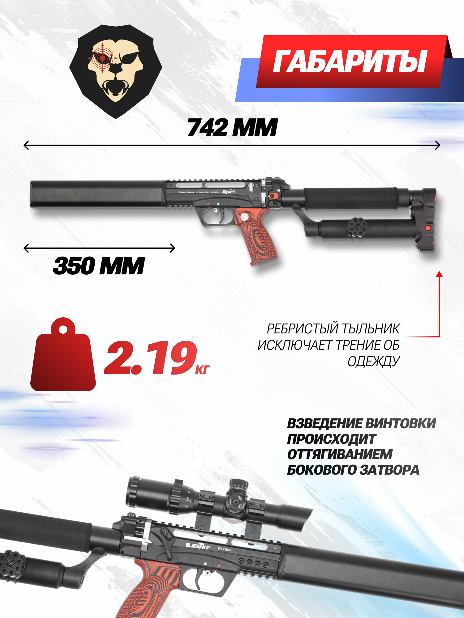 ЕДган Леший 2 сохранил ключевые преимущества предшественника - легкость и компактность. Даже в исполнении Long с увеличенной длиной ствола размер винтовки не превышает 74.2 см. При этом за счет складного приклада габарит «воздушки» дополнительно сокращается до 453 миллиметров, что упрощает ее хранение и транспортировку.