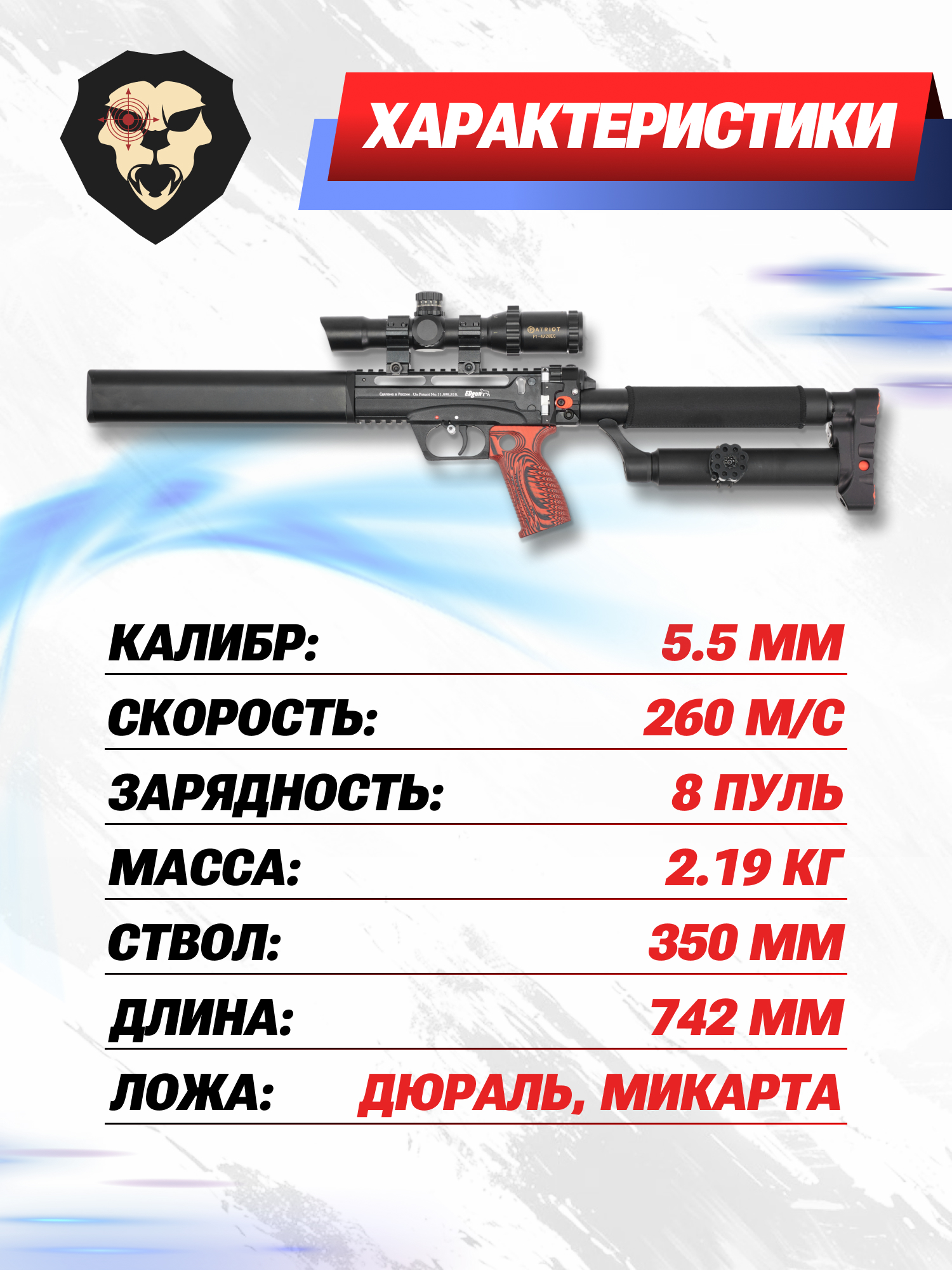 Продукция фирмы изготавливается из качественных материалов, а в процессе производства применяется современное отлаженное оборудование. Модель относится к классу PCP - ресивер для воздуха объемом 152 кубических сантиметра вынесен в заднюю часть под плечевой упор. Последний, в свою очередь, также является частью системы - в сложенном состоянии возможность стрельбы отсутствует.