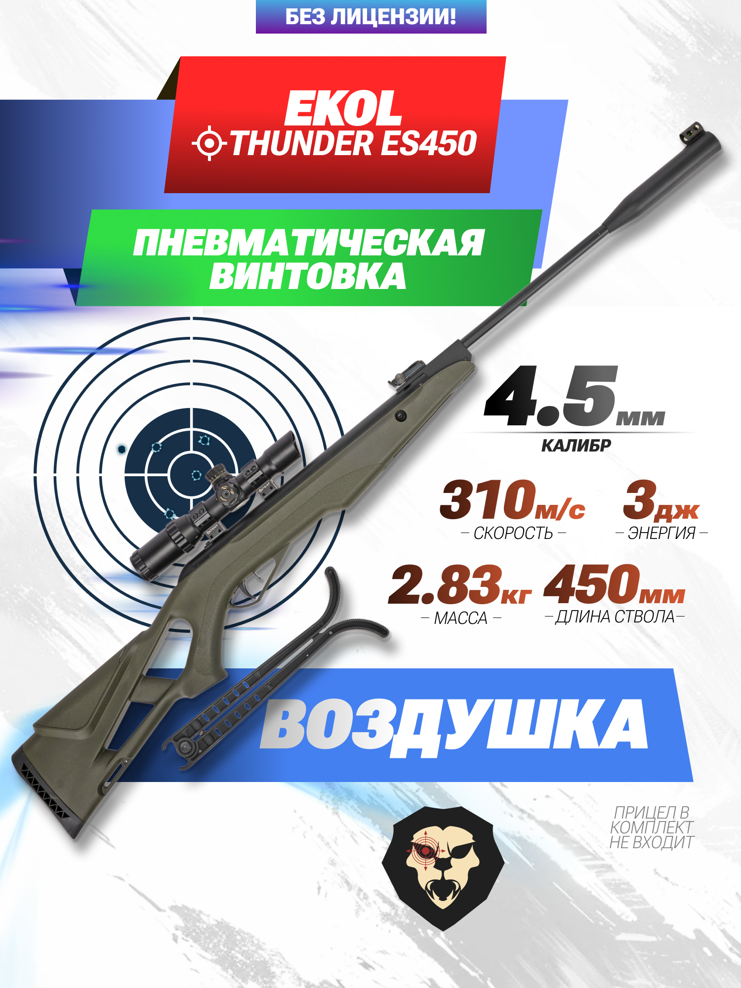 Представленная пружинно-поршневая винтовка Ekol Thunder ES450 удобна в использовании благодаря анатомическому и эргономичному полимерному ложу, двустороннему подщечнику на прикладе, а также поглощающему отдачу прорезиненному тыльнику. Относится это оружие к категории «переломок», так как взвод производится посредством складывания ствола. В этот же момент происходит перезарядка 4.5-миллиметровой свинцовой пулей, используемой в рассматриваемом образце в качестве боеприпаса.
