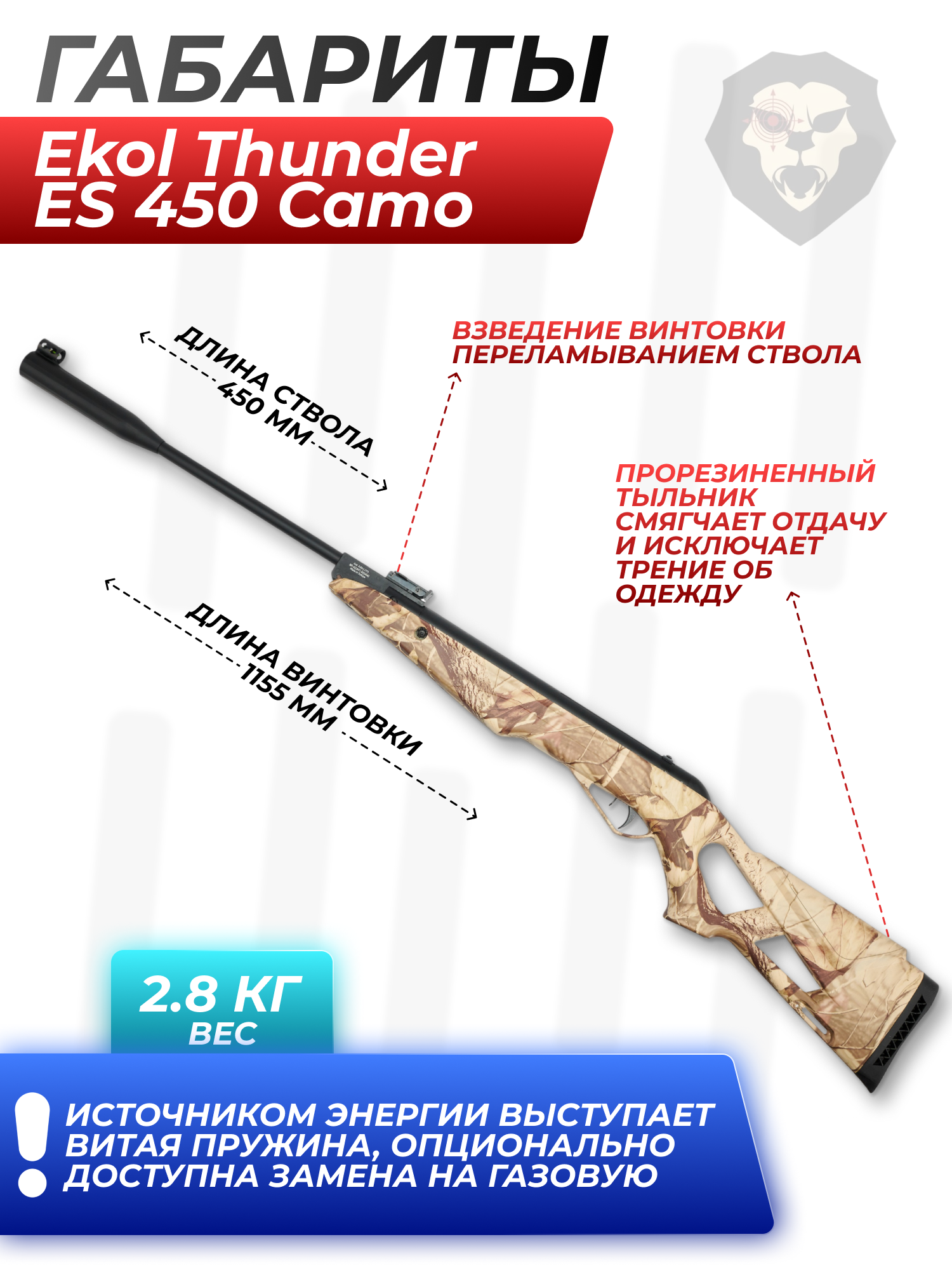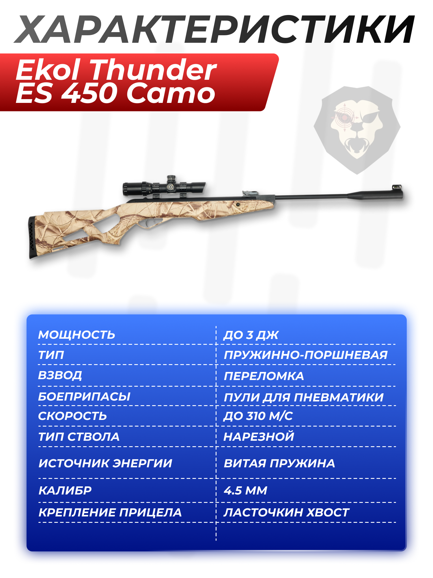 Информация о товаре "Пневматическая винтовка Ekol Thunder ES 450 Camo 4.5 мм (3 Дж)" носит ознакомительный характер, и не является публичной офертой, определяемой положениями Статьи 437 Гражданского кодекса Российской Федерации, характеристики, внешний вид, цвет и комплектация могут быть изменены производителем без уведомления.