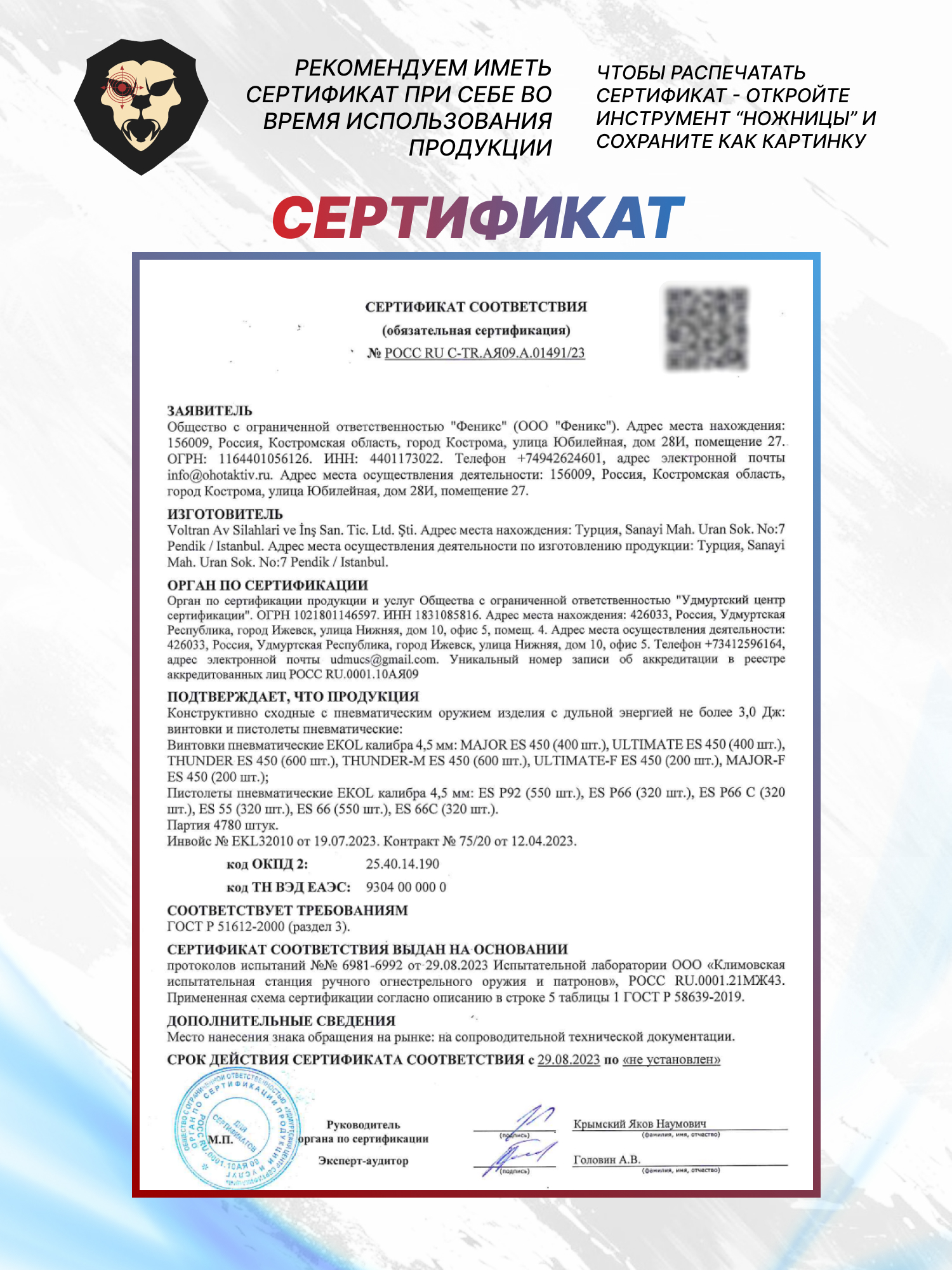 Еkol пневматика поступающая в российские магазины не превышает по мощности 3 Джоуля, поэтому для приобретения изделий серии Thunder не требуется лицензия. Однако при желании стрелка установить усиленный или газовый вариант боевой пружины, увеличивающий начальную скорость выстрела из винтовки, потребуются разрешительные документы, оформляемые в Росгвардии.