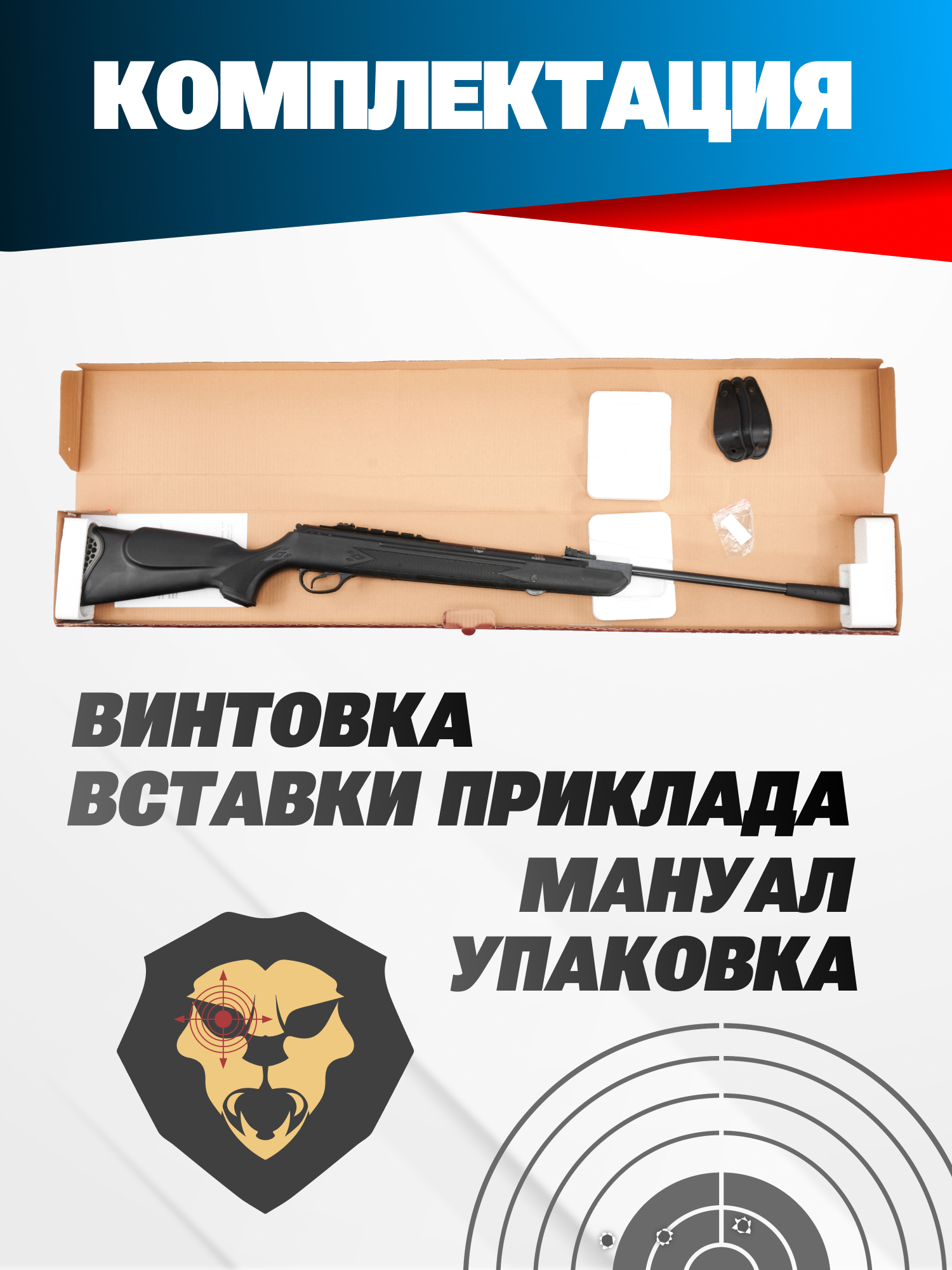 | Комплектация | Винтовка, упаковка, краткая документация, копия сертификата (по запросу покупателя), вставки для приклада |