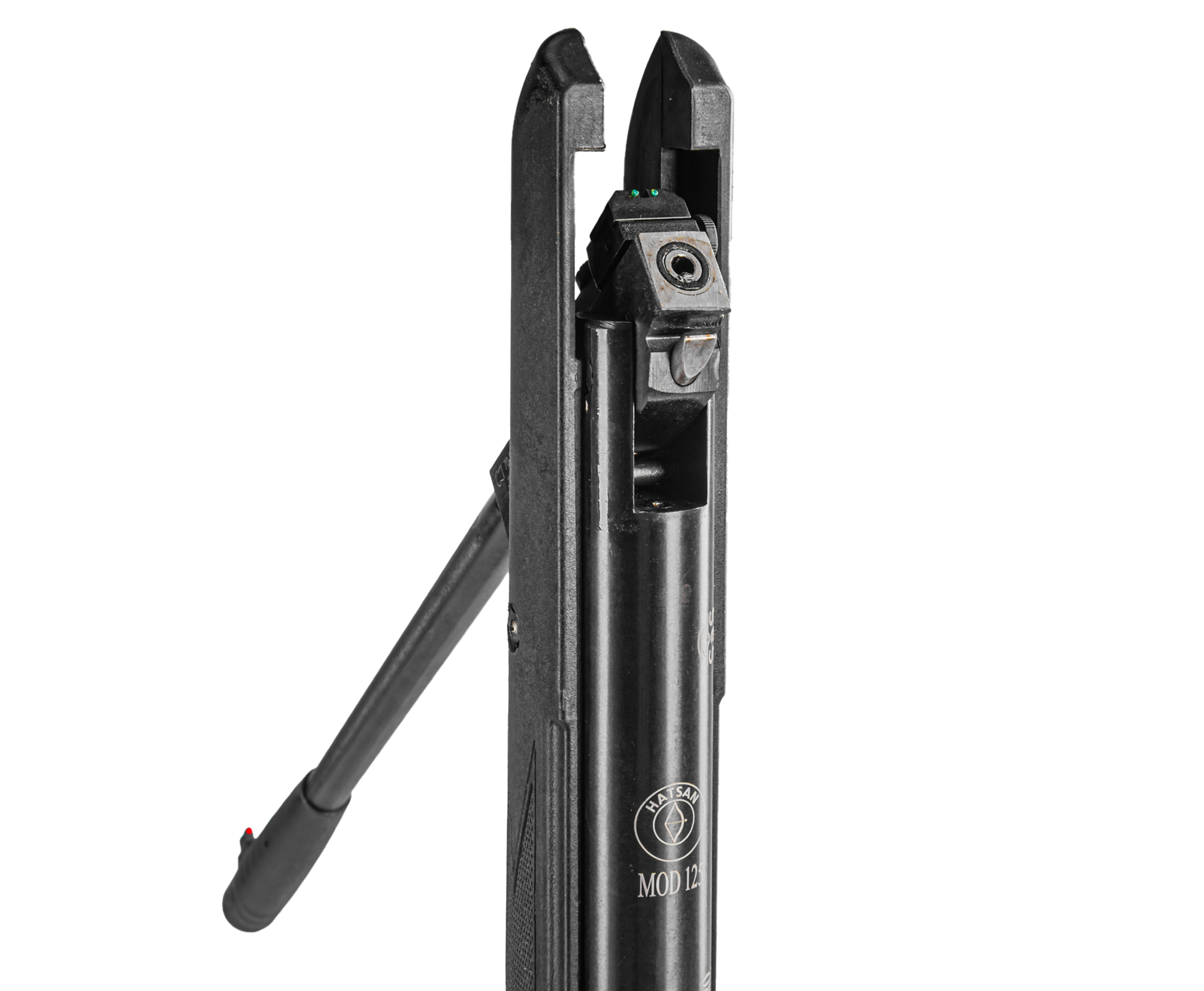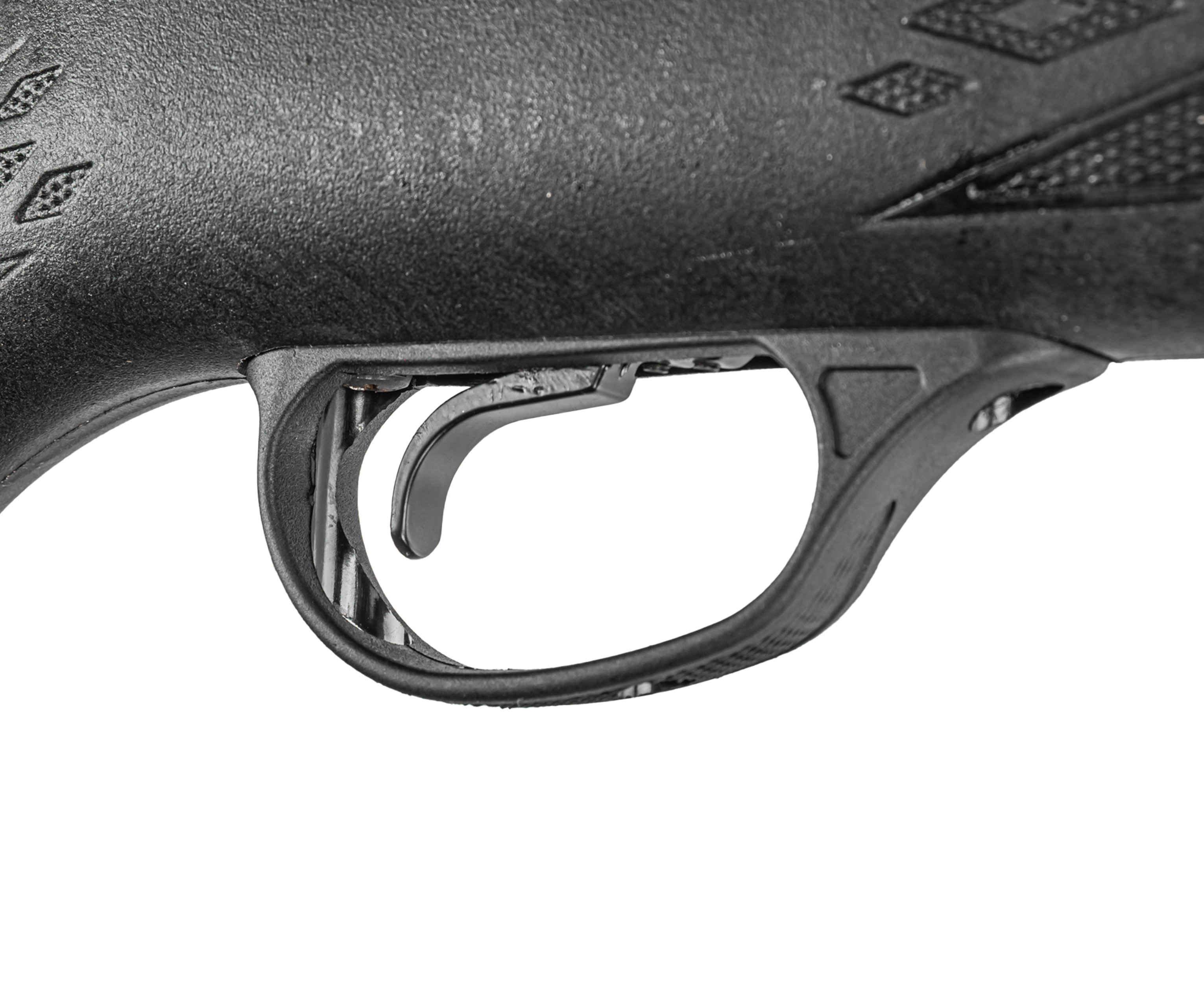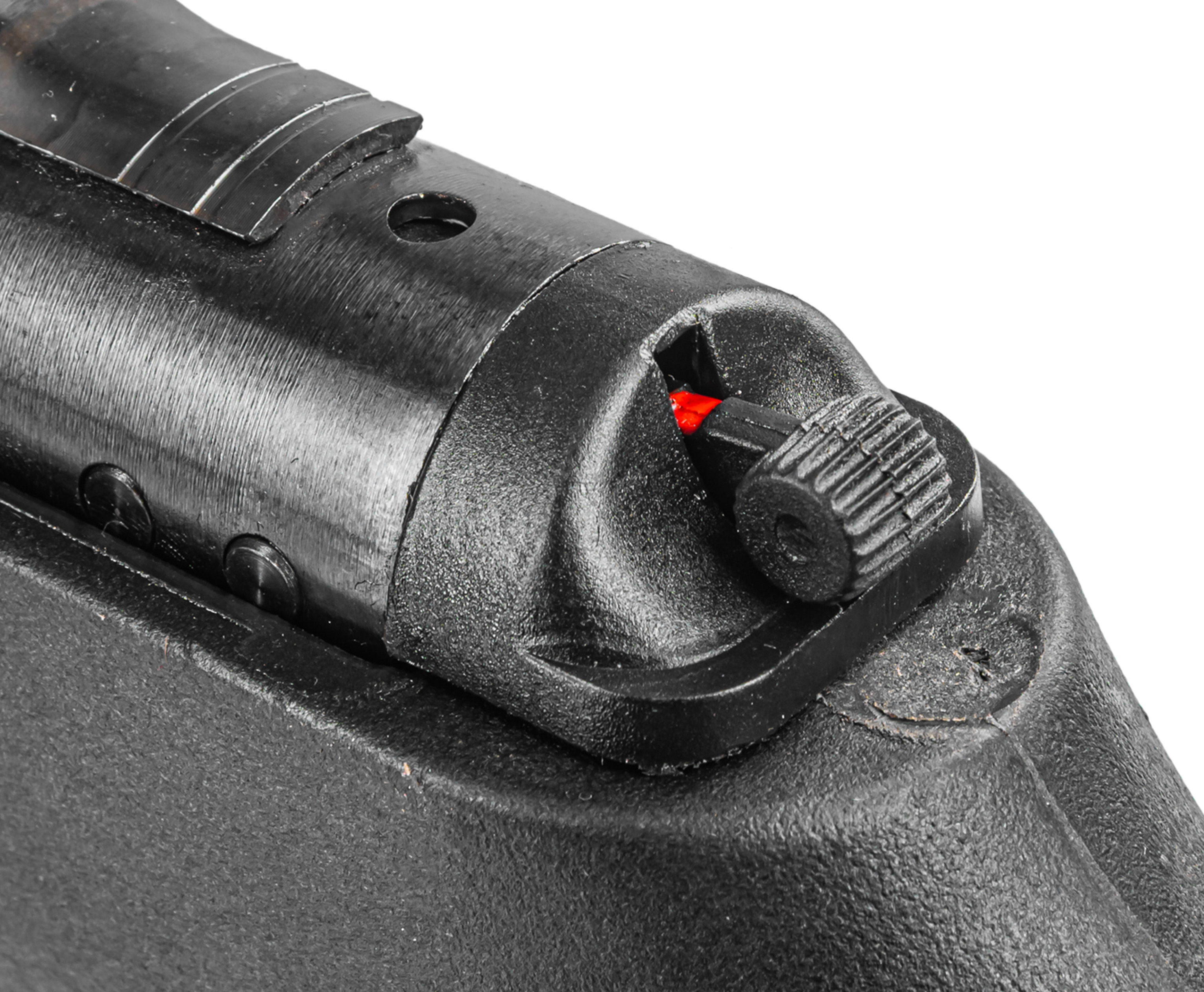 По возвращении ствола в исходное положение пневматическая винтовка Hatsan 125 выставляется на предохранитель. Снятие с последнего происходит клавишей, вынесенной на торцевую часть коробки. Такое расположение позволяет не нарушать вкладку, оперируя большим пальцем руки.