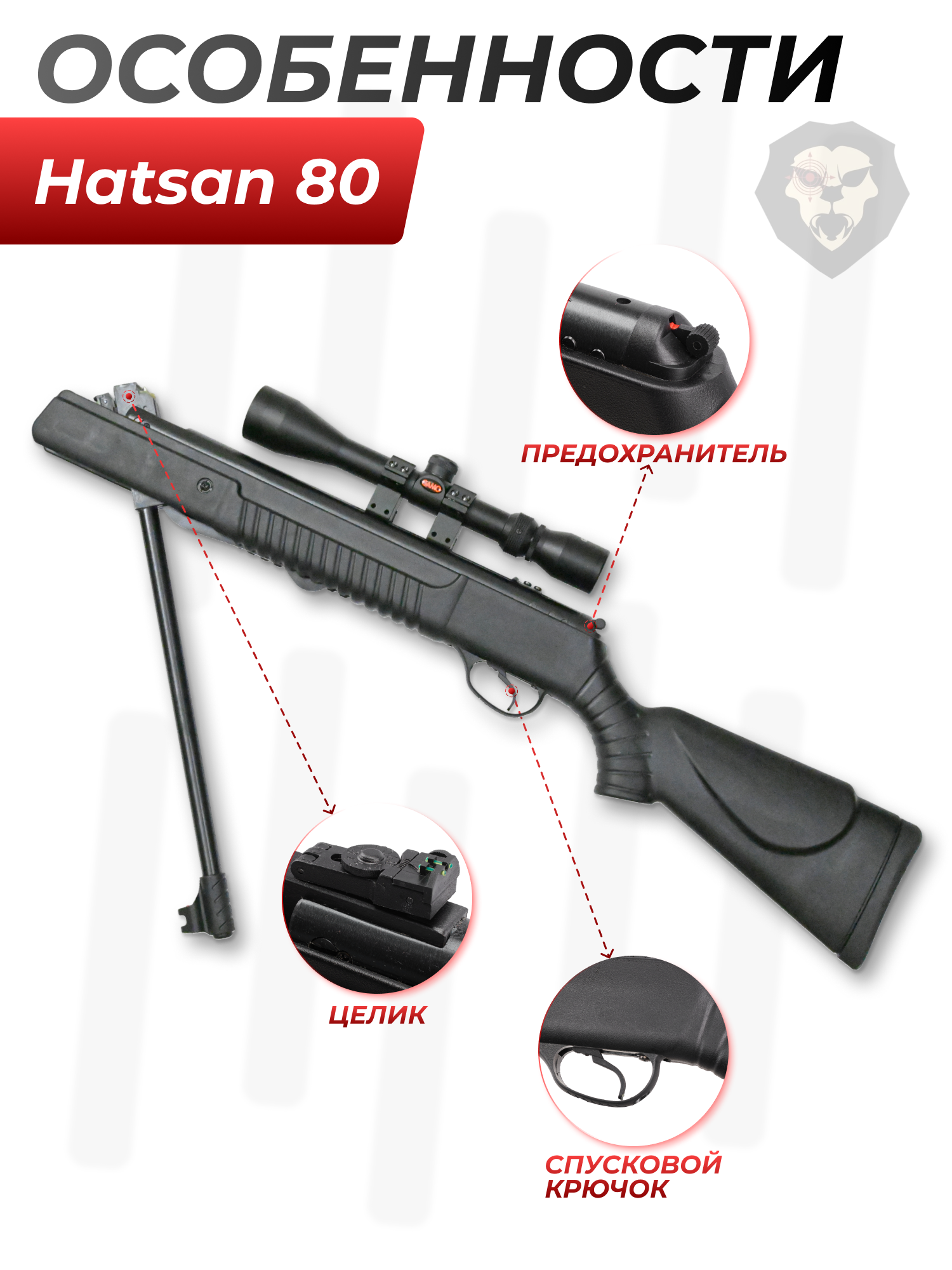 Ствол и ствольная коробка изготовлены из стального сплава, что повысило надежность Хатсана 80. Кроме того, на винтовке присутствует интегрированная планка «Ласточкин хвост» 11 миллиметров для размещения оптических или коллиматорных прицельных устройств. Также в конструкции предусмотрен спасающий от случайного выстрела предохранитель, наличие которого является требованием российского законодательства при сертификации пневматики.