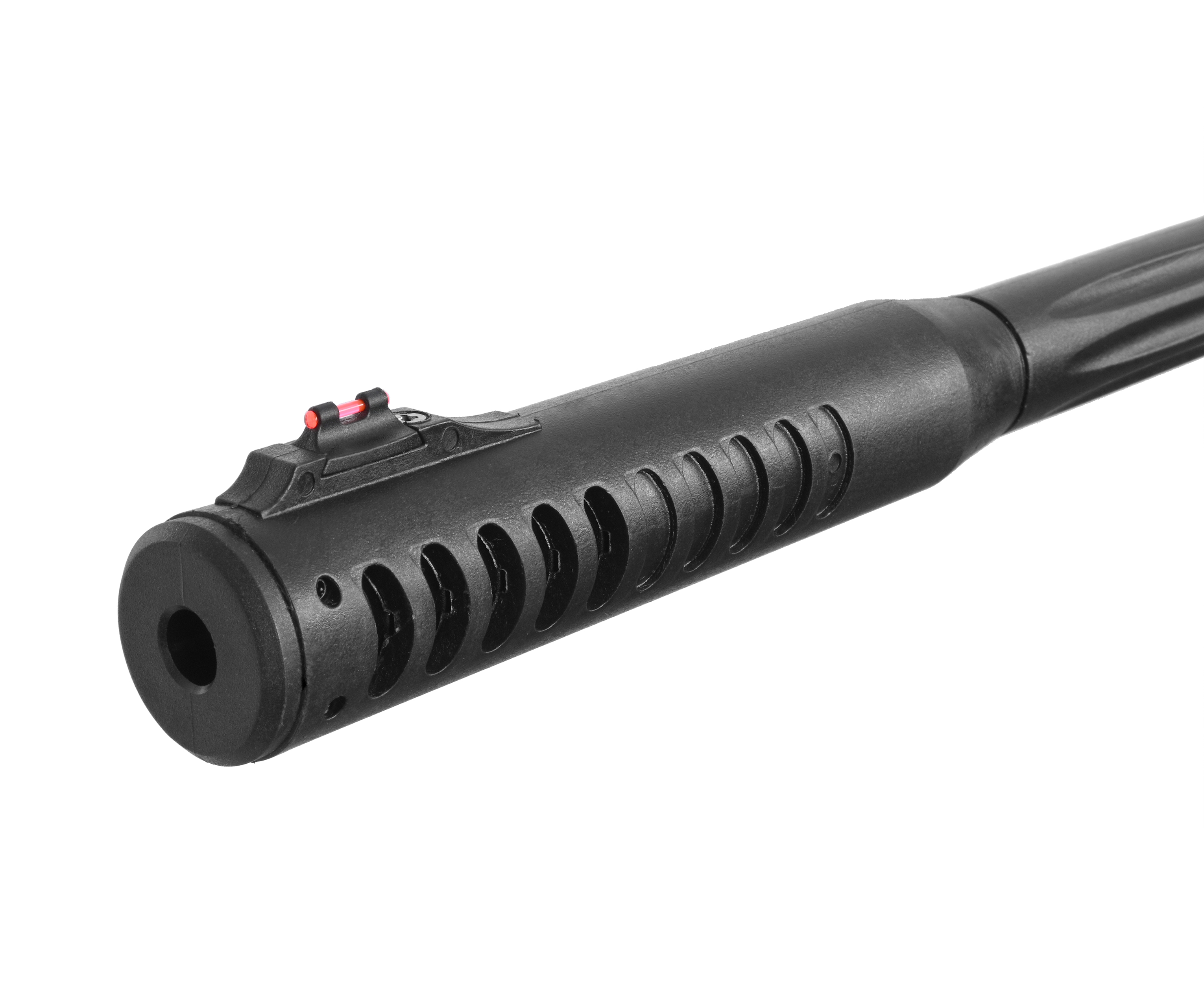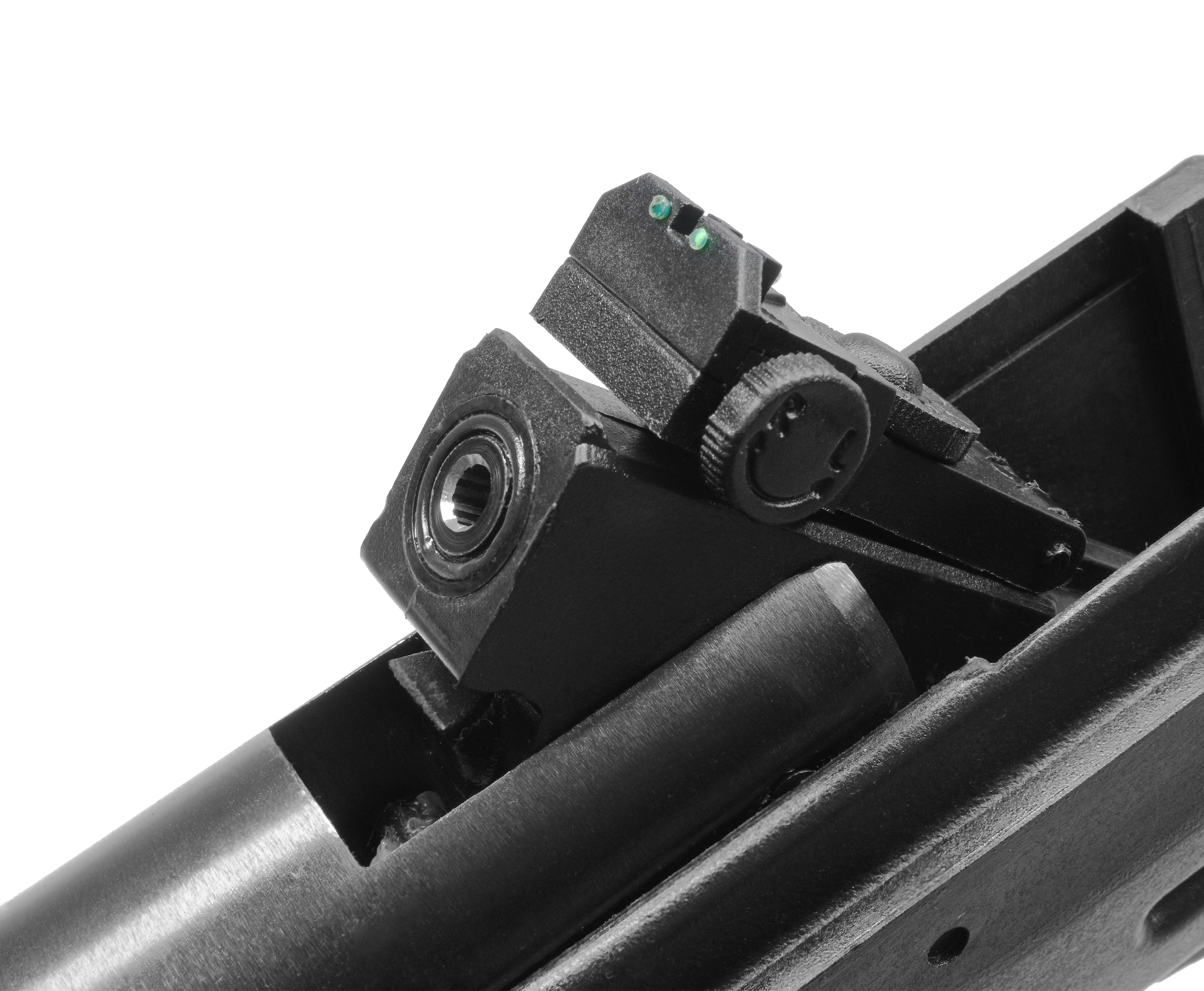 Еще одним фактором комфортного взвода стал полимерный кожух, уберегающий от контакта с обнаженным металлом ствола, что делает эксплуатацию проще в холодное время. На нем присутствует стойка со светонакопительной мушкой. Ответной частью ей послужил настраиваемый целик с цветными вставками.