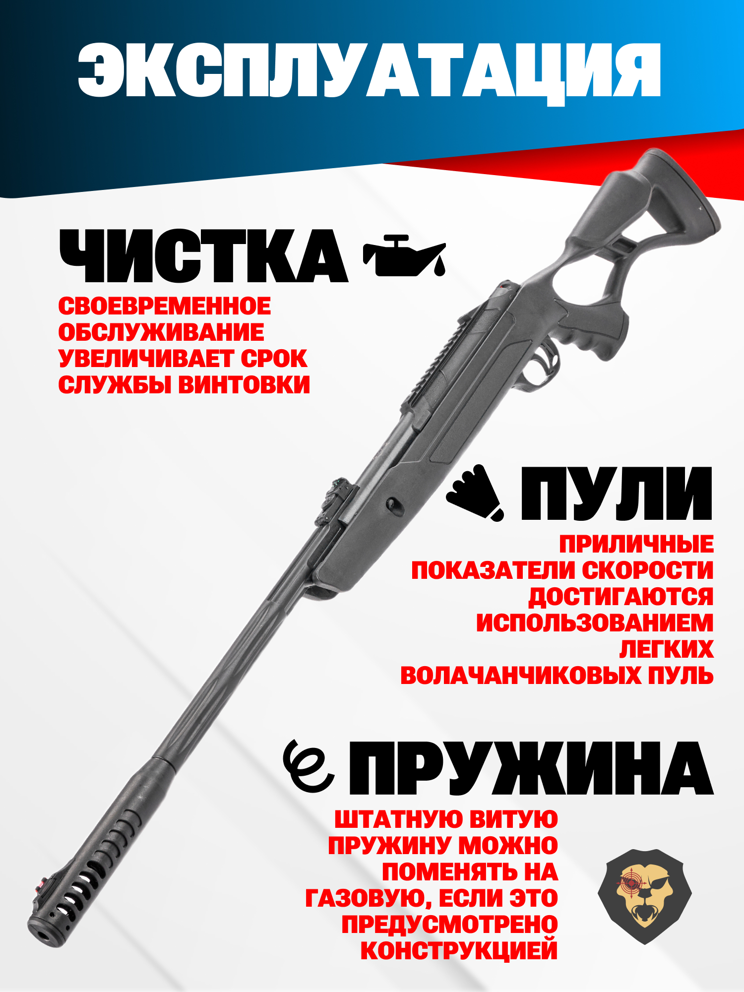 Внимание! Данная модель поставляется в разрешенной мощности для свободного приобретения на территории Российской Федерации. При этом в модели имеется возможность увеличения мощности путем замены части деталей или настройки конструкции, однако не стоит забывать о Федеральном законе «Об оружии» № 150 - ФЗ. В случае необходимости, опираясь на данный закон и руководствуясь им, возможно, потребуется получить разрешение от ЛЛР ГУ МВД России после вмешательства в конструкцию.