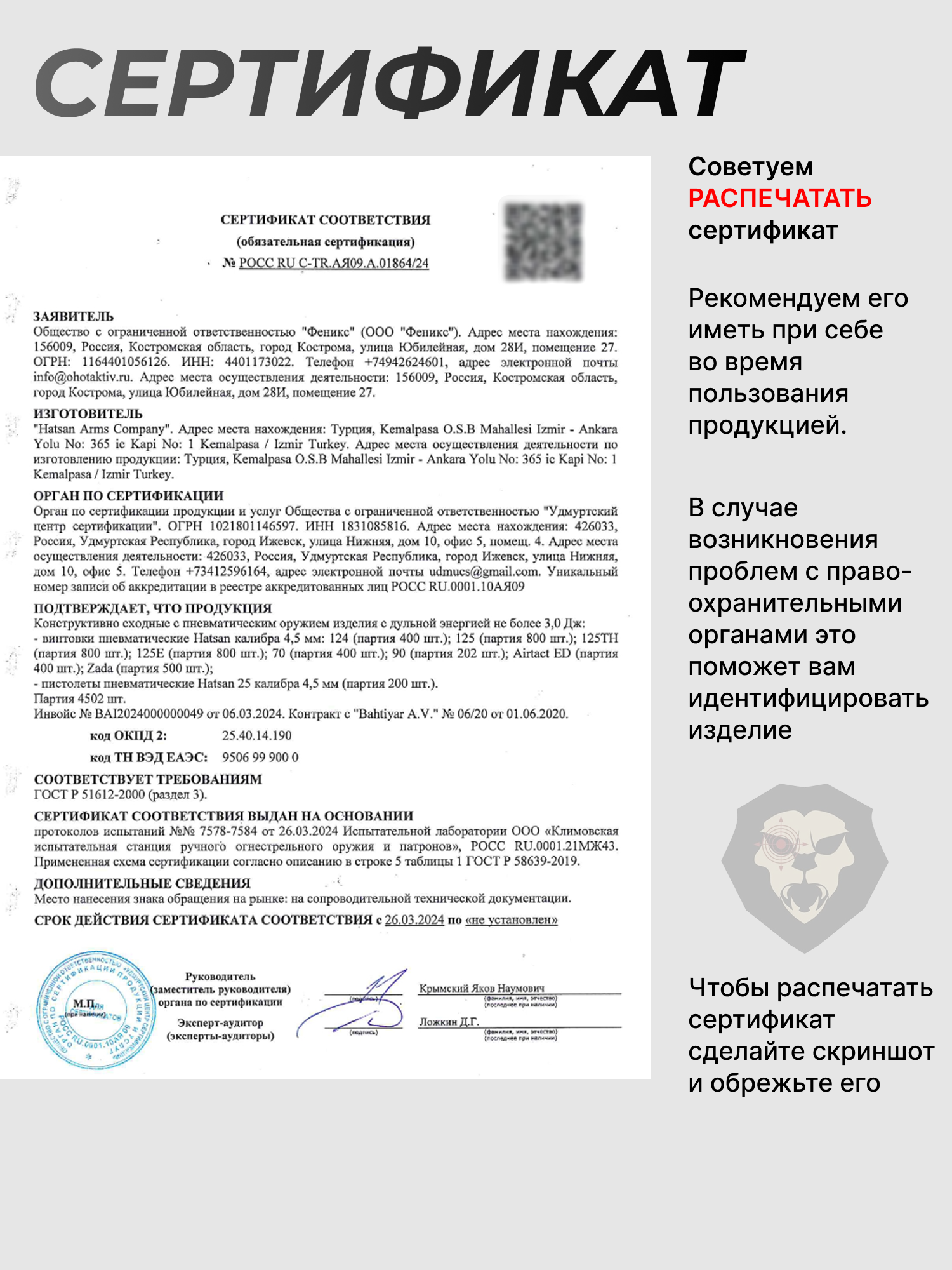 Комплектация | Винтовка, прицел, кольца, газовая пружина, мишени, пули, набор для чистки, упаковка, краткая документация, копия сертификата (по запросу покупателя) |