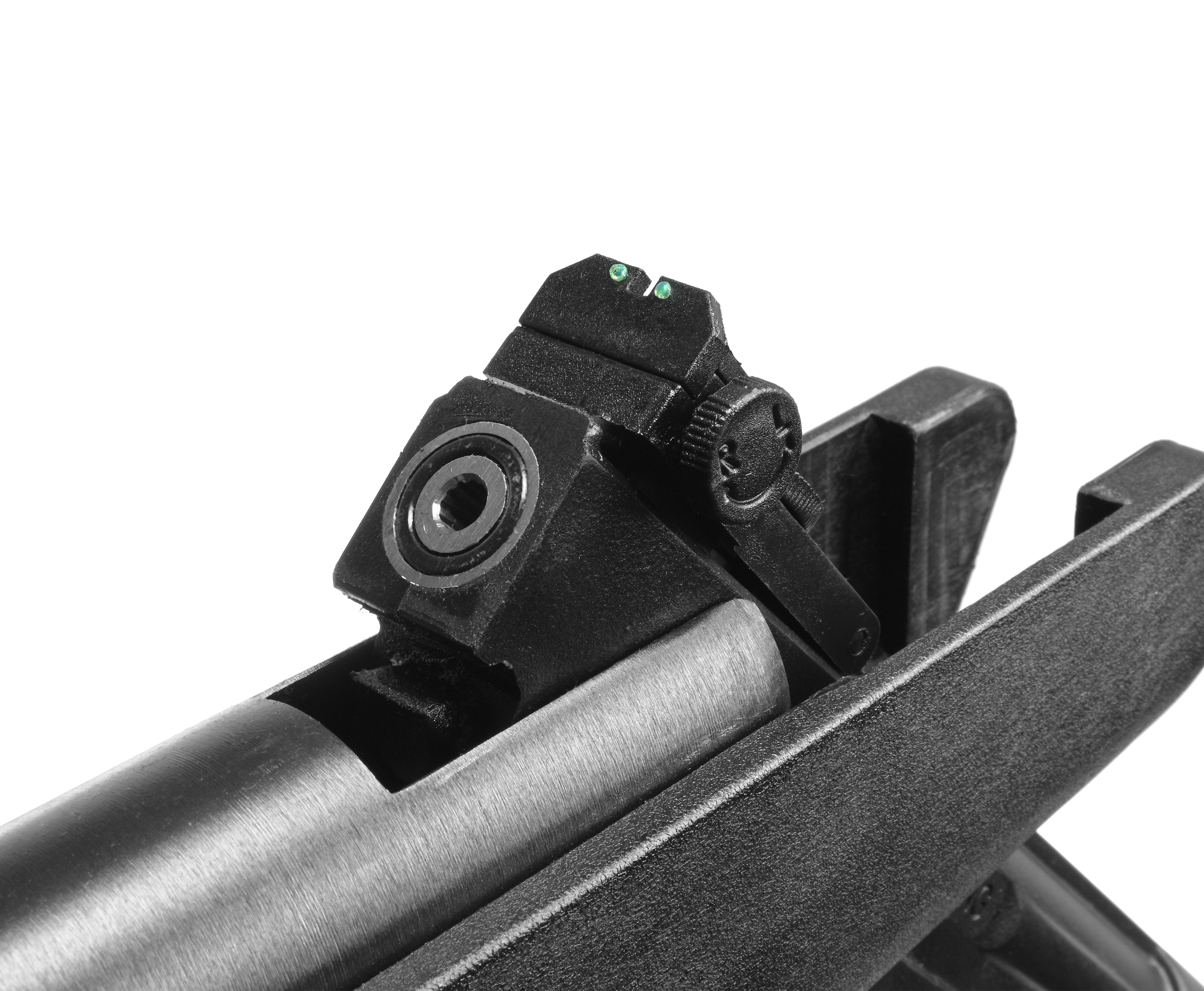 За полимерной фурнитурой скрывается стальная конструкция - из этого металла сделали не только тело компрессора и ствол, но и муфту, соединившую эти две части. Соответственно это повысило жесткость запирания и вместе с тем увеличило износоустойчивость винтовки Хатсан - оружие не будет деформироваться даже при интенсивных нагрузках. В тот же момент обилие железных деталей не повредило удобству - вес изделия не выходит за черту 2.75 кг.