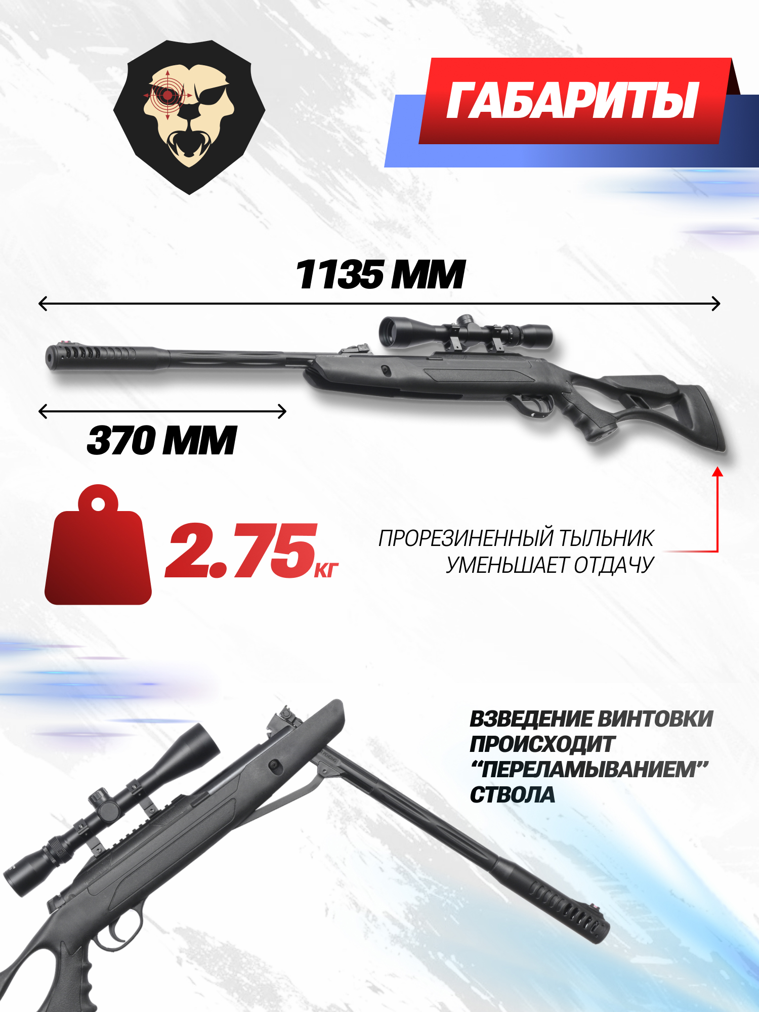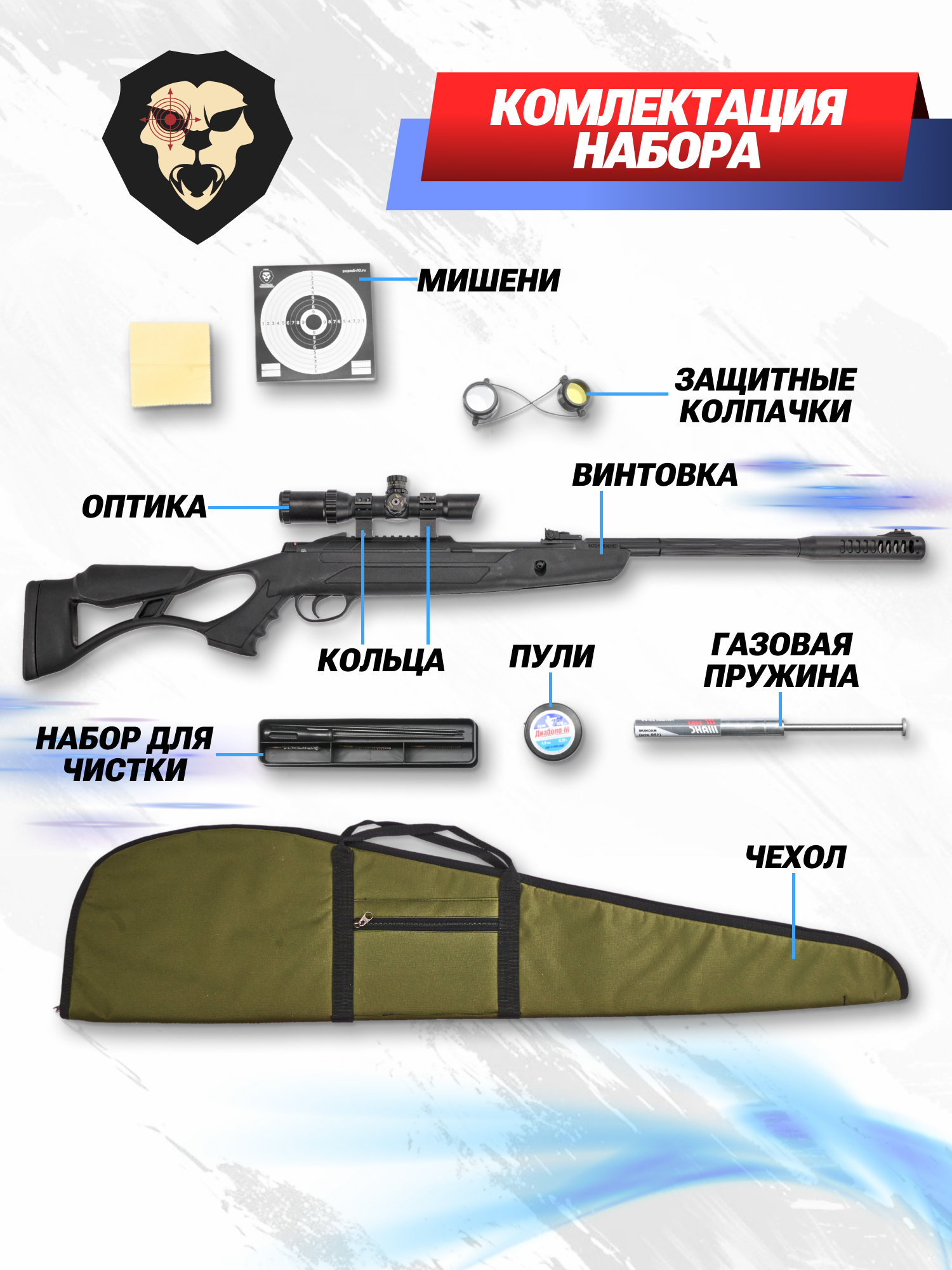| Комплектация | Винтовка, прицел, кольца, газовая пружина, чехол, мишени, пули, набор для чистки, упаковка, краткая документация, копия сертификата (по запросу покупателя) |