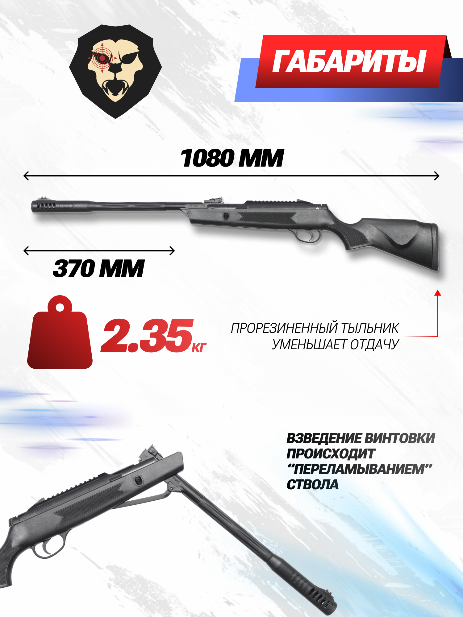 Модель снабдили ложей из пластика, ввиду чего при габаритах 1080 мм она весит всего 2.35 кг. Облегчение массы не затронуло функционал - изделие можно по желанию дооснастить оптикой, которая ставится на комби-планку Вивер с «Ласточкиным хвостом». По умолчанию при этом присутствуют механические приспособления со светоотражающими вставками.