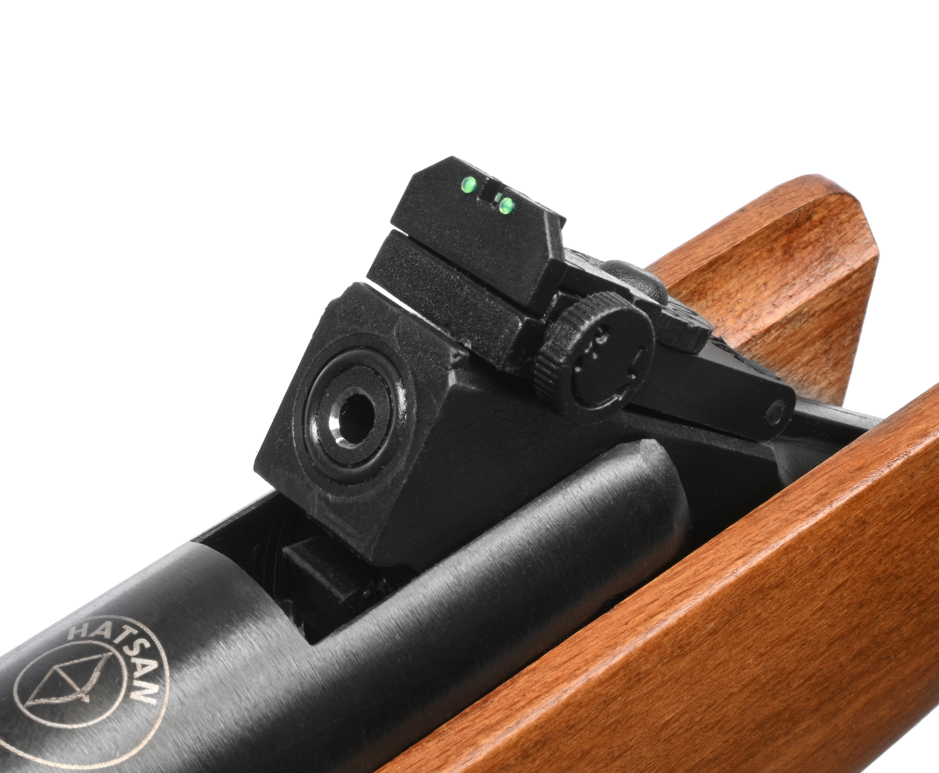 Винтовка Hatsan Alpha при этом хорошо покажет себя и без снайперского прицела, так как по умолчанию для наведения на мишень присутствуют открытые приспособления с возможностью регулировки. Они дополняются светоотражающими вставками из фибергласса, повышающими заметность элементов при недостаточной окружающей видимости.