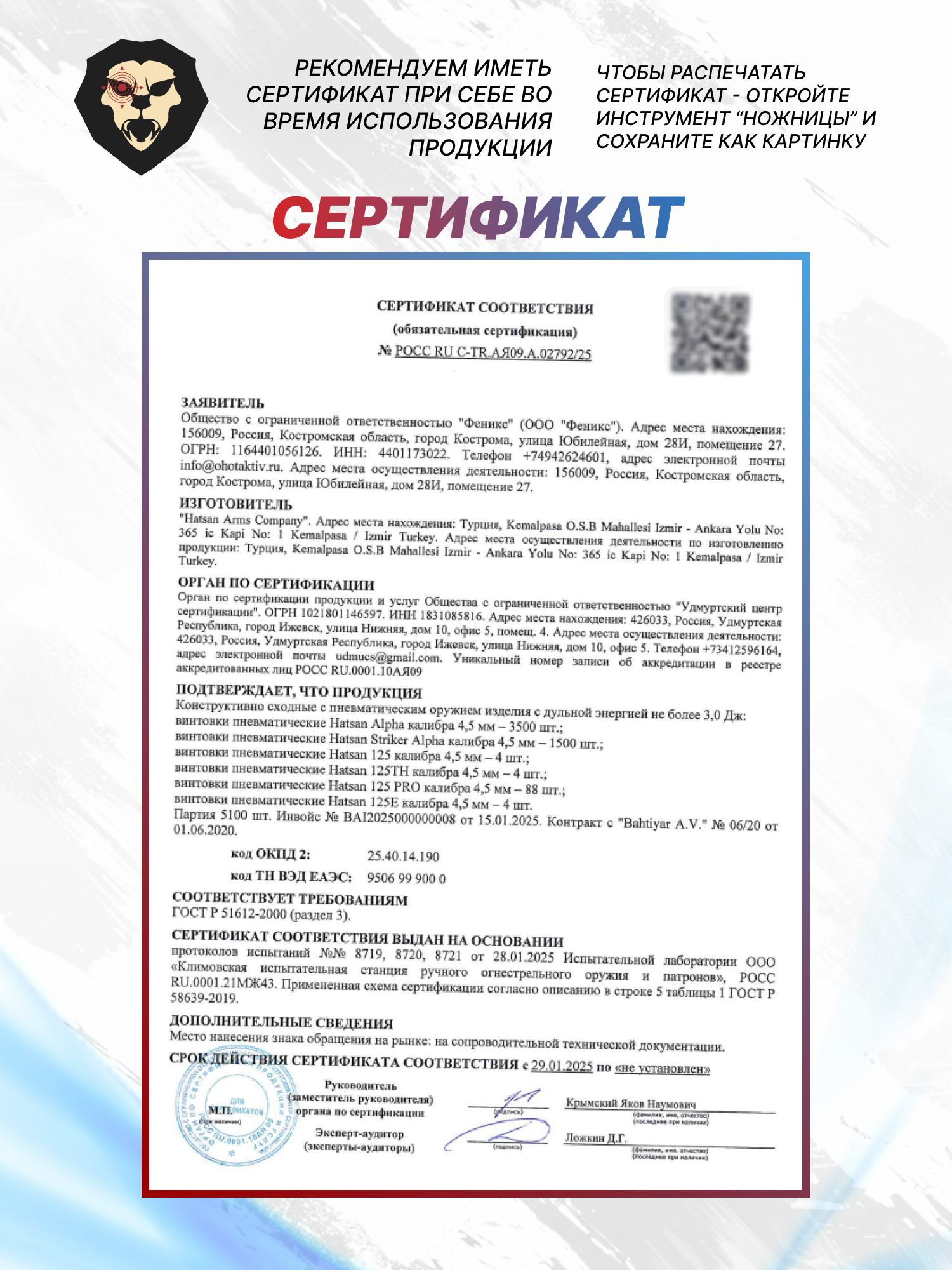 | Комплектация | Винтовка, упаковка, краткая документация, копия сертификата (по запросу покупателя) |