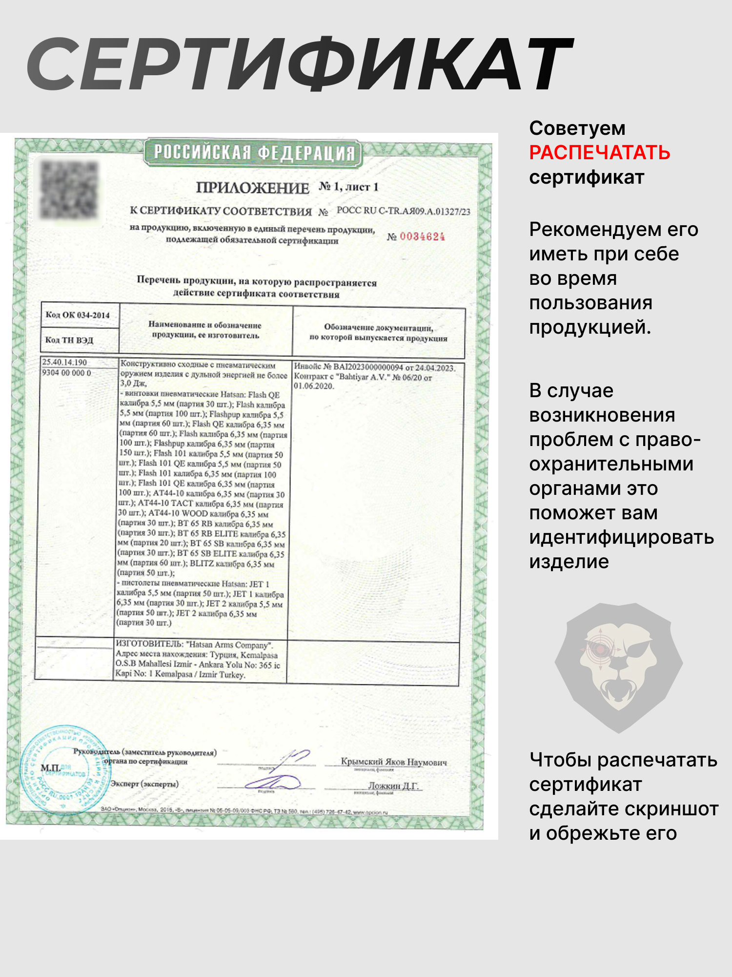 Комплектация | Винтовка, магазин - 2 шт, заправочный штуцер, упаковка, краткая документация, копия сертификата (по запросу покупателя) |