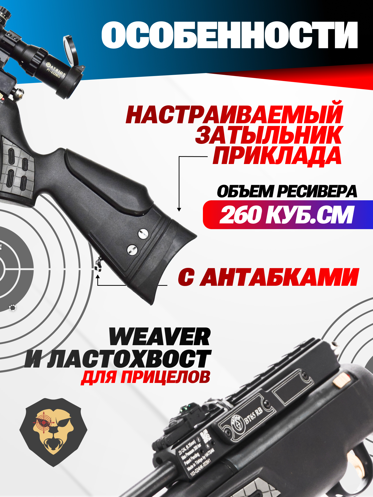 К таким экземплярам относится представляемая пневматика БТ65, которую оснастили нарезным стволом с длиной в 58.5 сантиметров - для стрельбы используются как воланчиковые, так и полнотелые пули с калибром 6.35 миллиметров. Также производителем предусмотрено наличие в комплекте заправочного штуцера и двух барабанных магазинов, способных вместить в себя до 9 снарядов. Для перезарядки используется классический болтовой взвод, где требуется оттянуть рычаг между выстрелами, а после вернуть его в исходное положение.