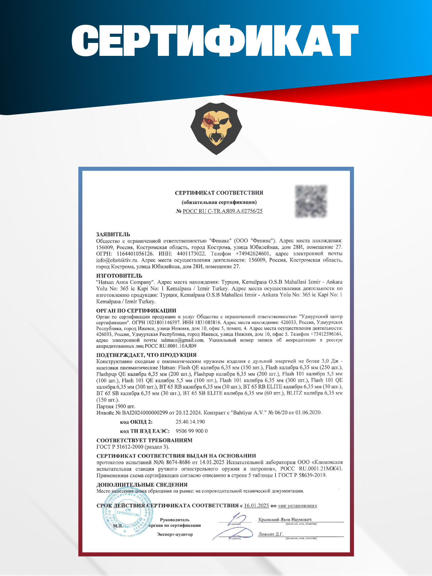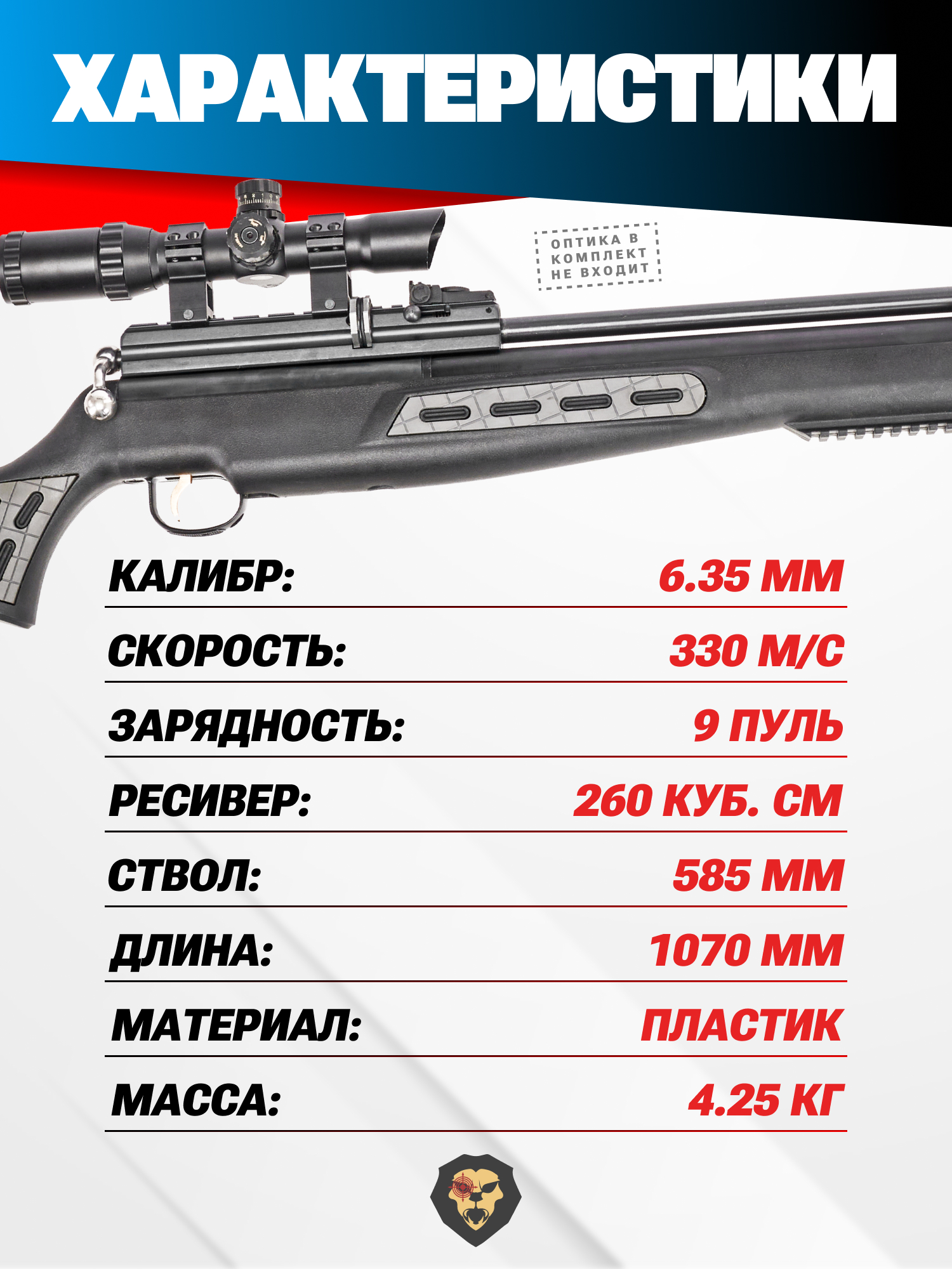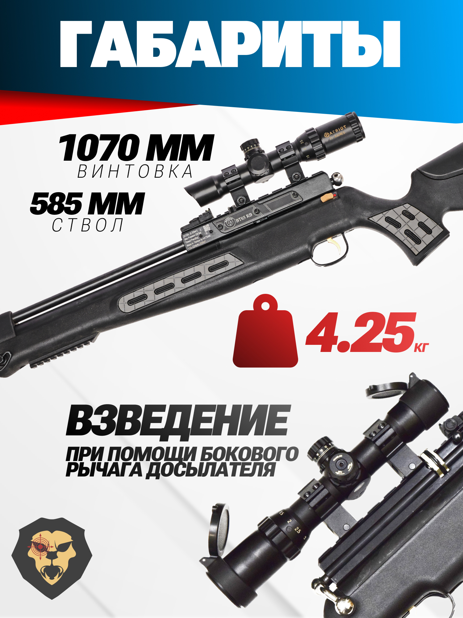 | Комплектация | Винтовка, магазин - 2 шт, упаковка, заправочный штуцер, краткая документация, копия сертификата (по запросу покупателя) |