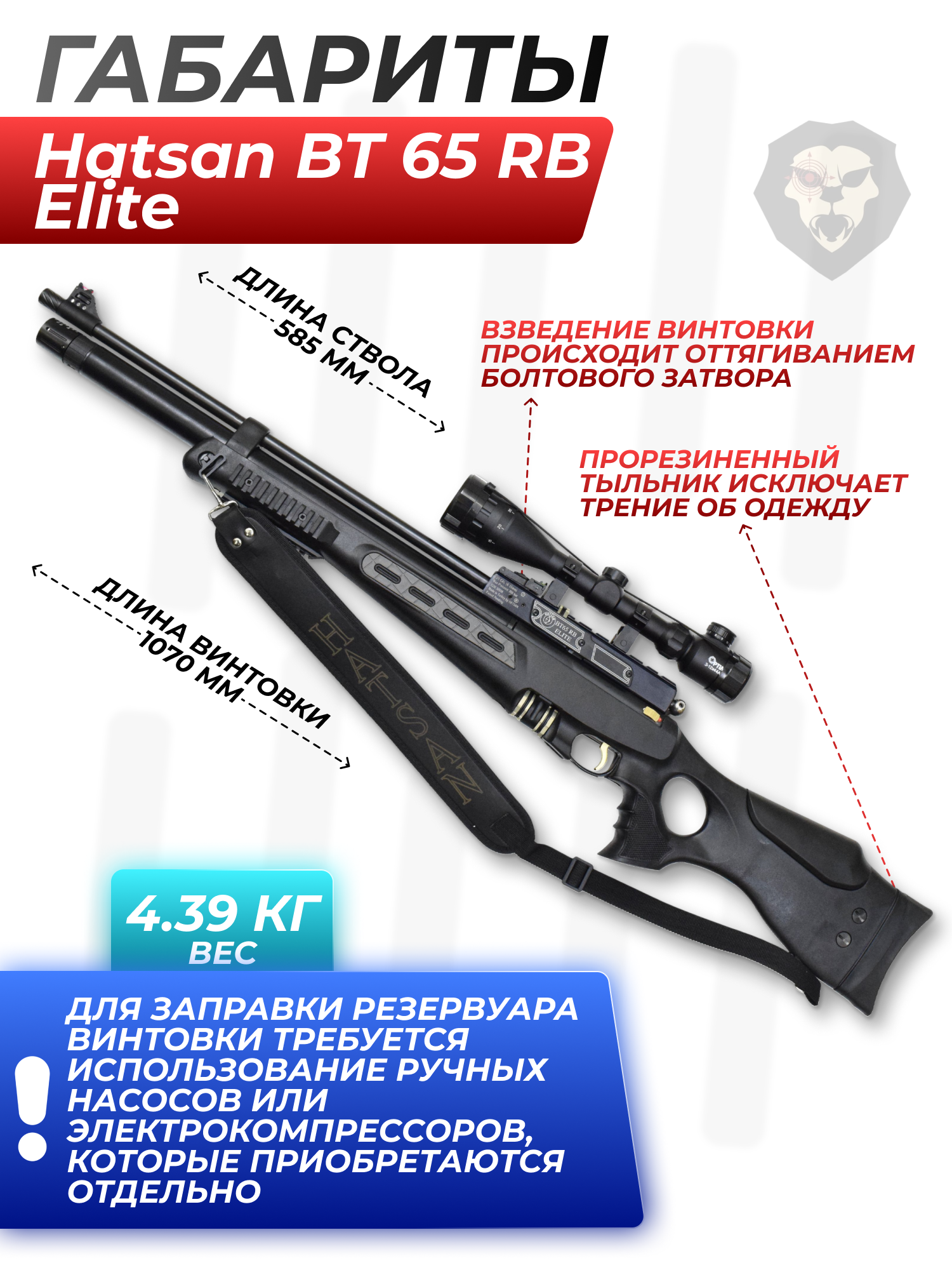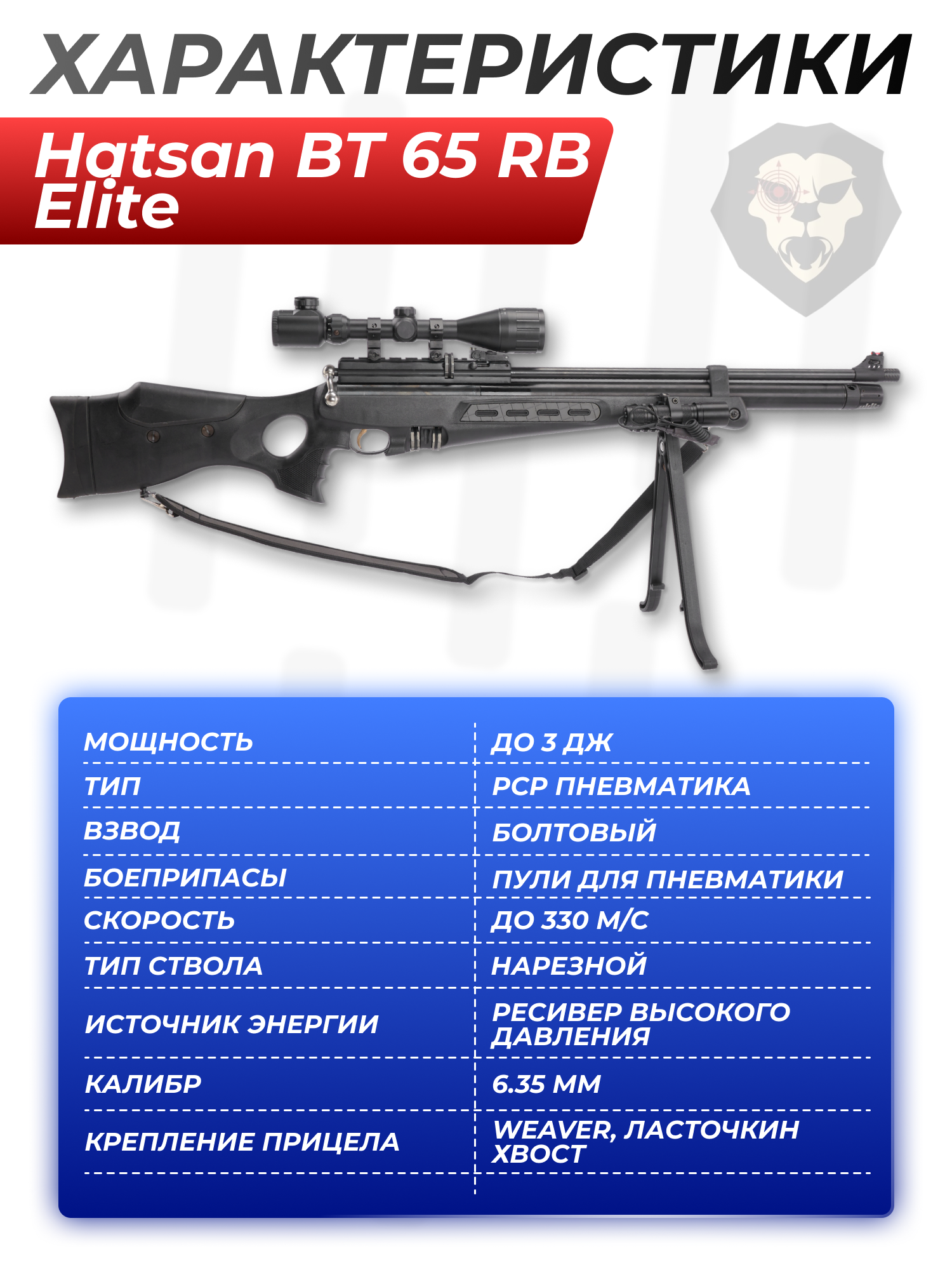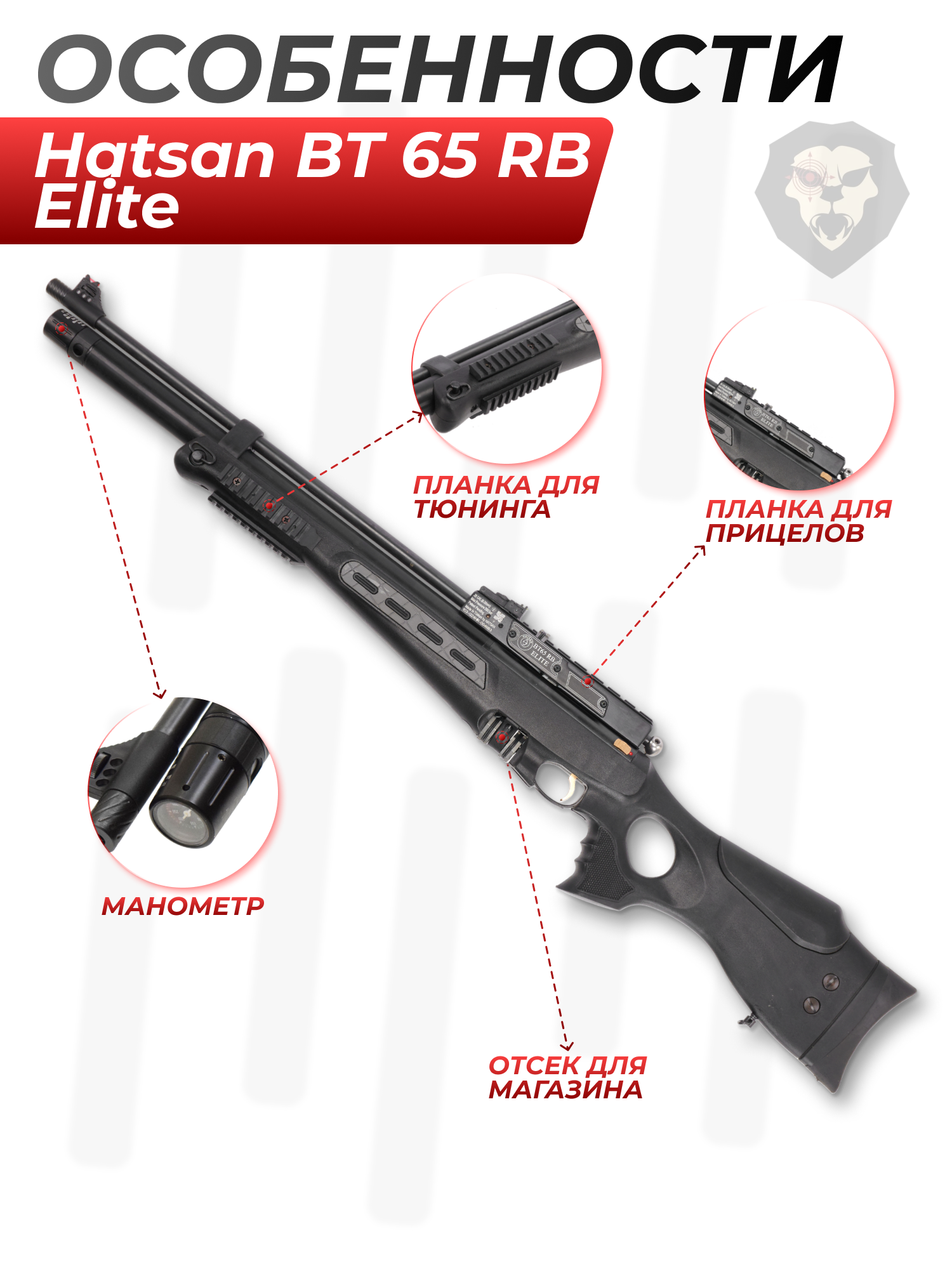 Пневматическая винтовка Hatsan BT 65 Elite в исполнении RB имеет задний болтовой взвод поворотного типа, вынесенный в торцевую часть коробки, что не мешает использованию габаритной оптики. Карабин характеризуется прямоточным устройством - заявленный показатель скорости составляет свыше 330 метров в секунду. Указанное значение актуально для изделий под зарубежный рынок - в свою очередь, рассматриваемый экземпляр обладает мощностью в пределах 3 Дж, что дает возможность приобрести его без лицензии.