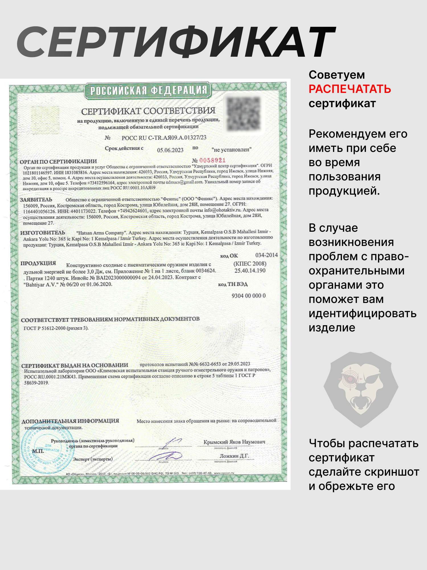 Внимание! Данная модель поставляется в разрешенной мощности для свободного приобретения на территории Российской Федерации. При этом в модели имеется возможность увеличения мощности путем замены части деталей или настройки конструкции, однако не стоит забывать о Федеральном законе «Об оружии» № 150 - ФЗ. В случае необходимости, опираясь на данный закон и руководствуясь им, возможно, потребуется получить разрешение от ЛЛР ГУ МВД России после вмешательства в конструкцию.