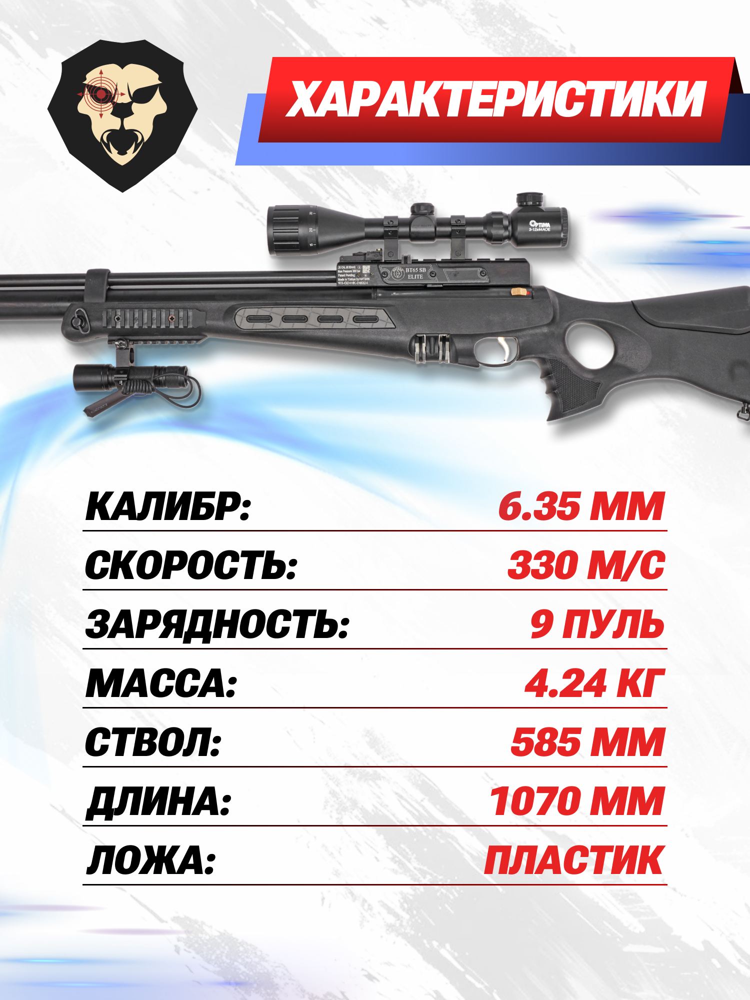 В исполнении Elite пневматика оборудована ложей из противоударного пластика с тремя планками Weaver на цевье для фиксации сошек и фонаря - указанный обвес поставляется в наборе. Кроме этого, в передней части винтовки и в области приклада с завода предустановлены антабки под комплектный ремень. В свою очередь плечевой упор выделяется наличием резинового нескользящего тыльника и настраиваемой по высоте щеки.