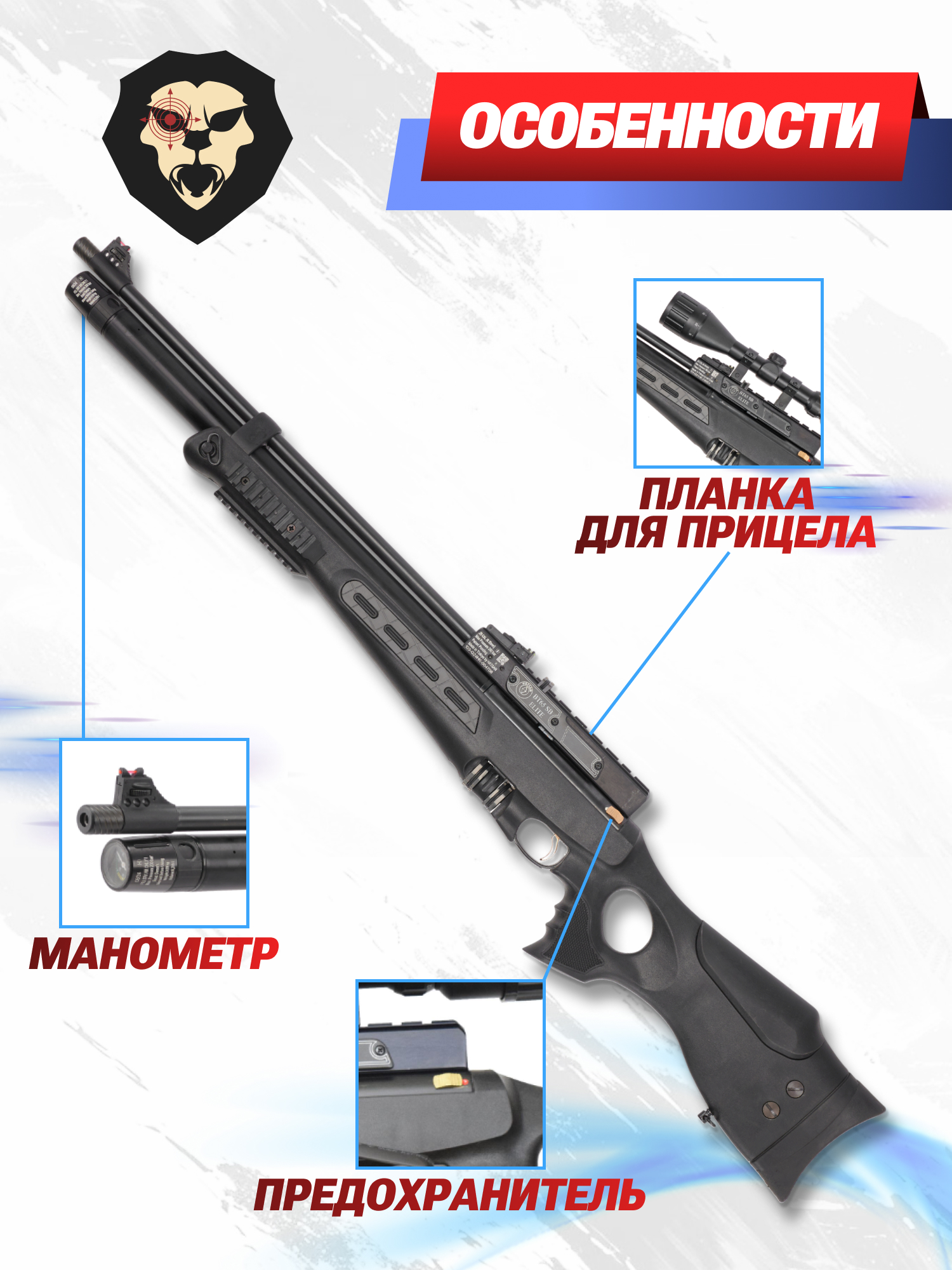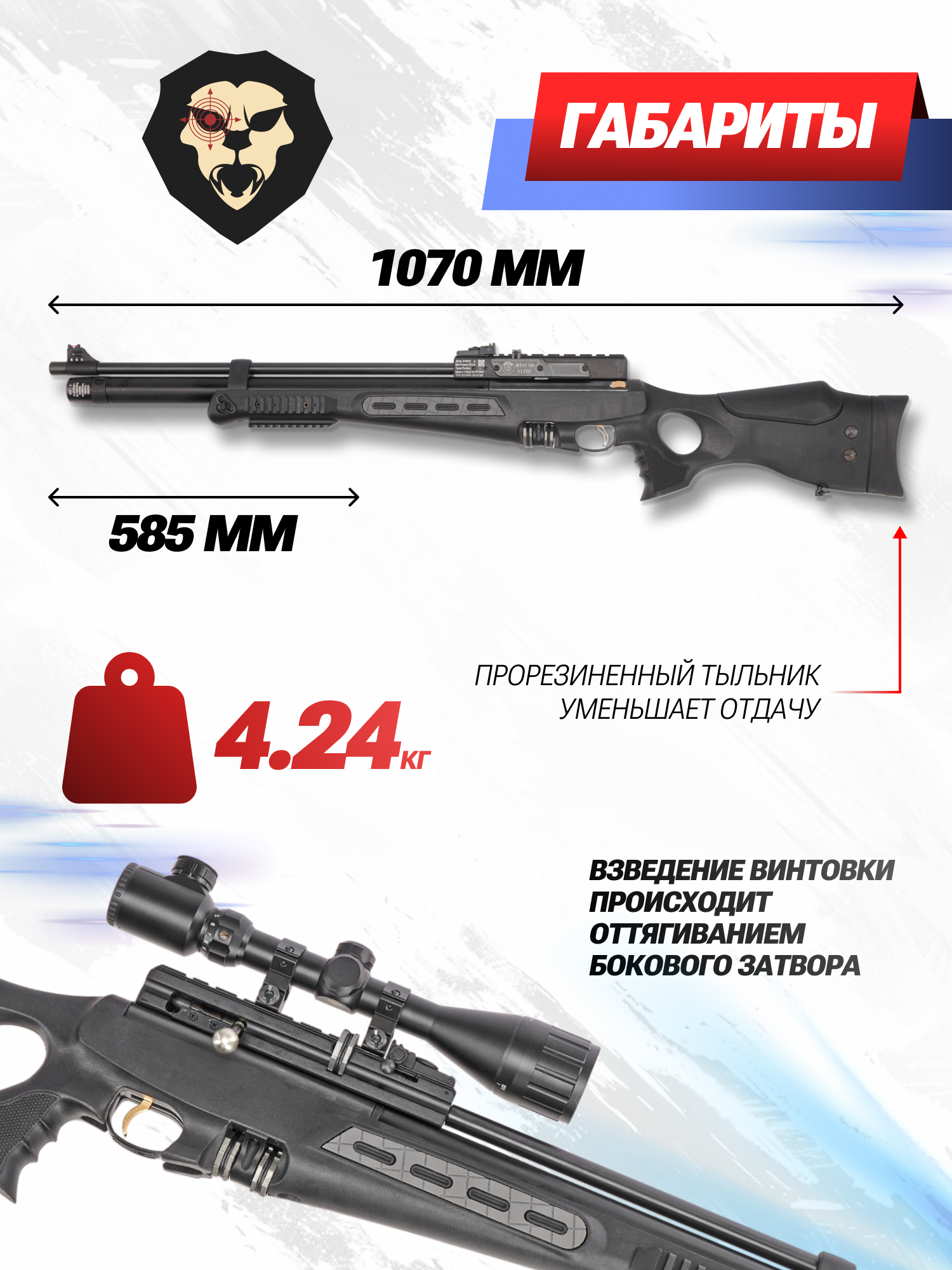| Комплектация | Винтовка, магазин - 3 шт, заправочный штуцер, ремень, оптический прицел 3-12x44, сошки, кейс, упаковка, краткая документация, копия сертификата (по запросу покупателя) |