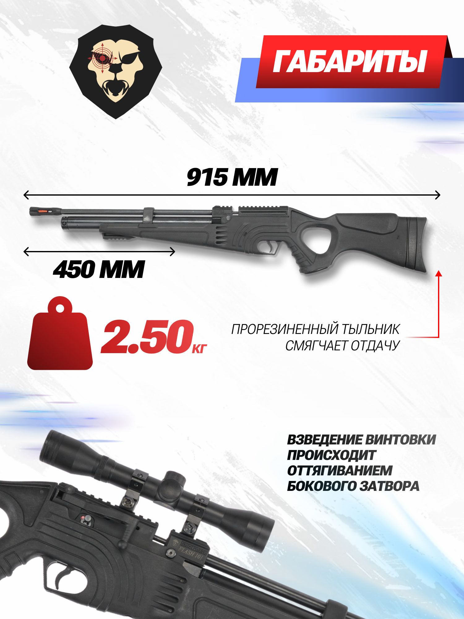 Винтовка весит 2.5 килограмма, а длина ровняется 915 миллиметрам. Габарит ствола у рассматриваемой модели составляет 450 мм и имеет нарезы по внутренней части. Для снижения шума выстрела возможно установить саундмодератор на дульный срез, который будет амортизировать звуковые колебания. Такое решение нужно при стрельбе, когда требуется минимизировать шум и избежать лишнего внимания.