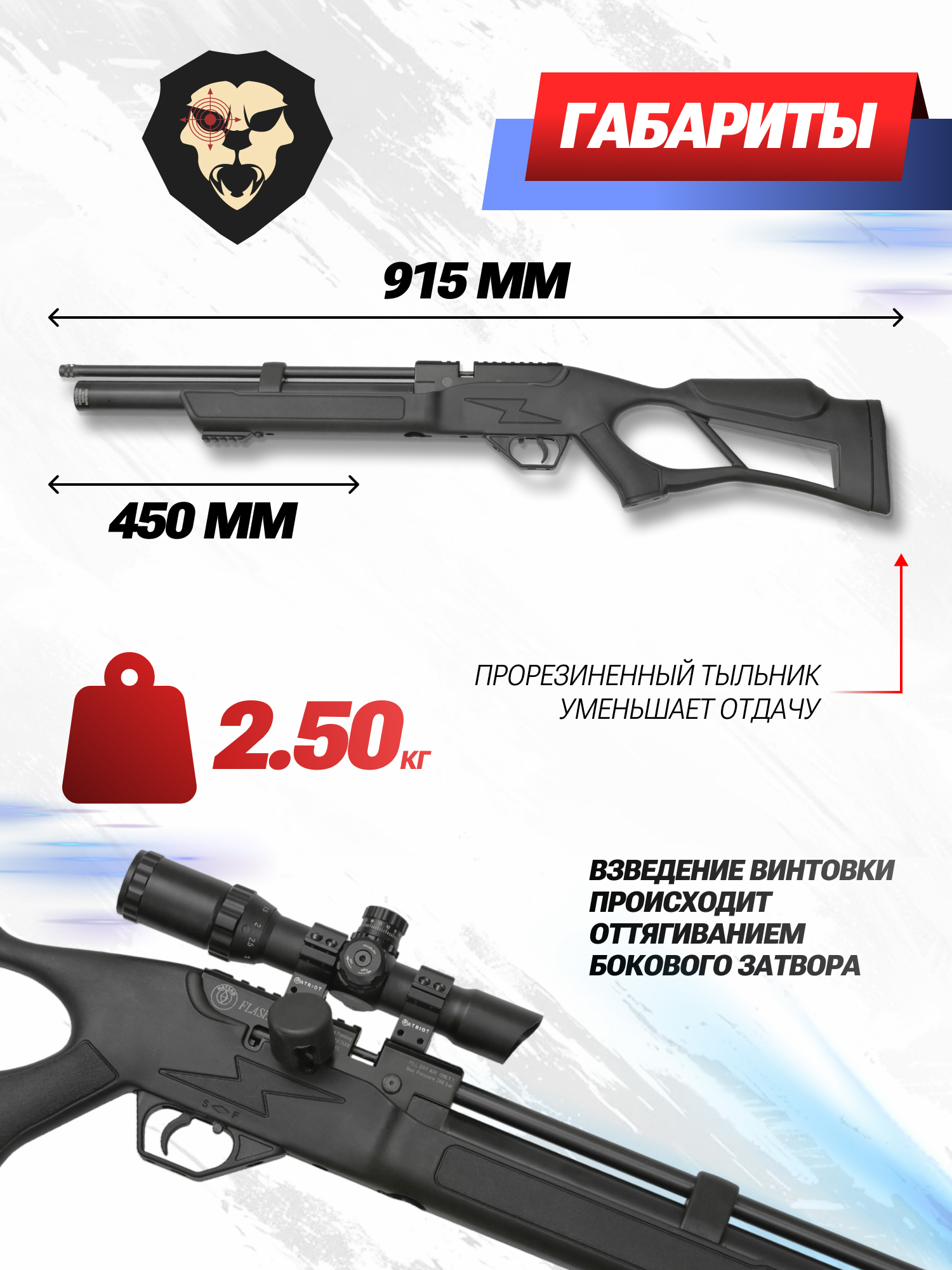 | Комплектация | Винтовка, 2 барабанных магазина, упаковка, заправочный штуцер, краткая документация, копия сертификата (по запросу покупателя) |