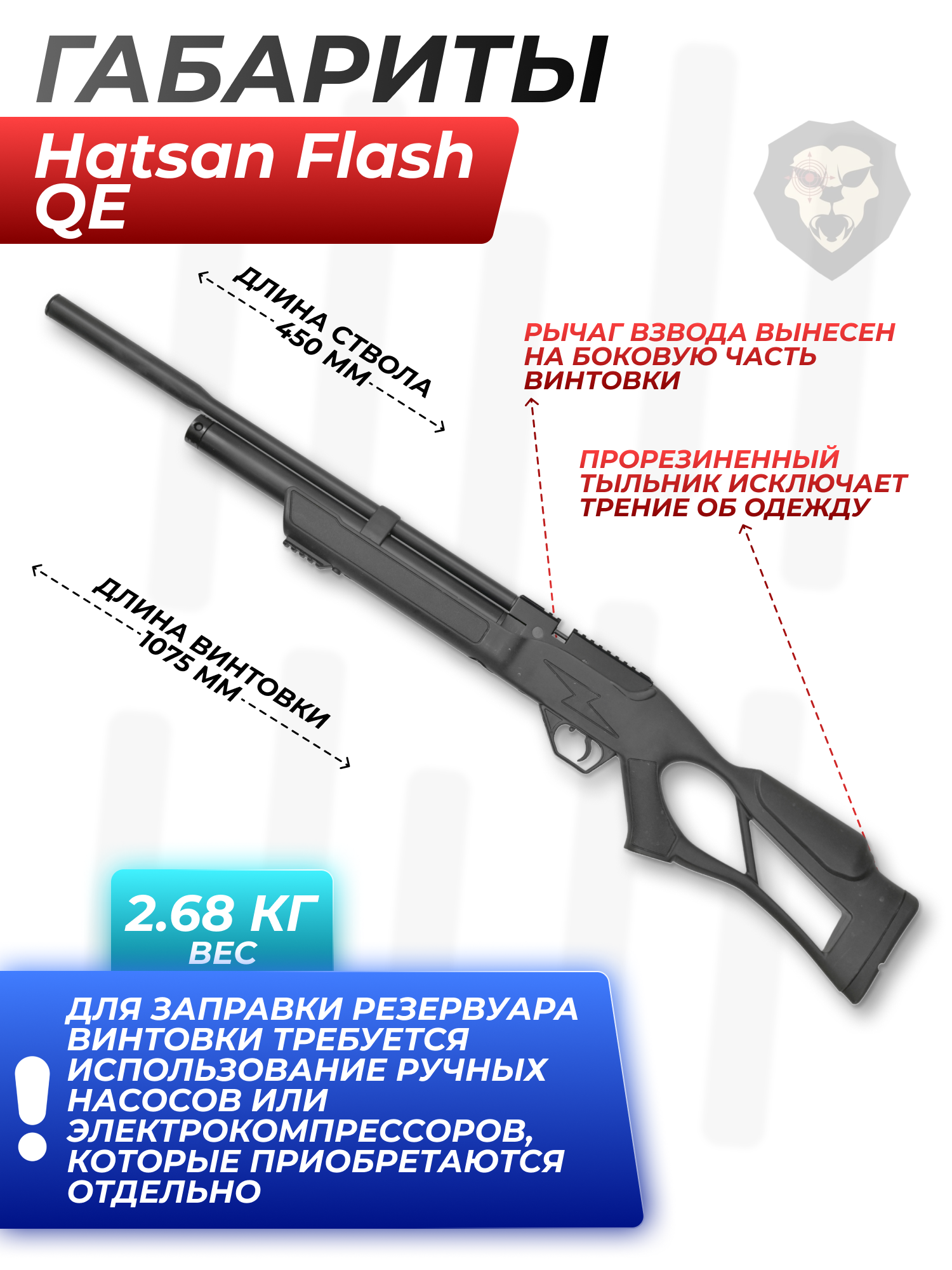Информация о товаре "Пневматическая винтовка Hatsan Flash QE 5.5 мм (PCP, пластик)" носит ознакомительный характер, и не является публичной офертой, определяемой положениями Статьи 437 Гражданского кодекса Российской Федерации, характеристики, внешний вид, цвет и комплектация могут быть изменены производителем без уведомления.