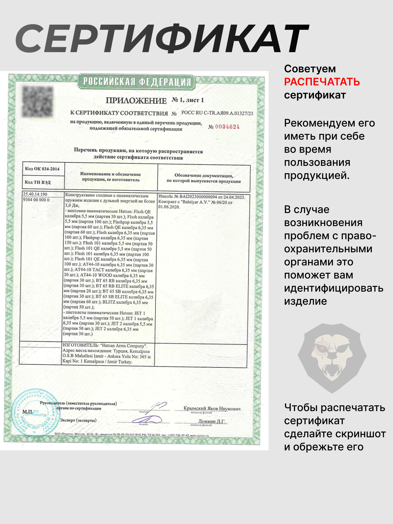 Комплектация | Винтовка, 2 барабанных магазина, упаковка, заправочный штуцер, краткая документация, копия сертификата (по запросу покупателя) |
