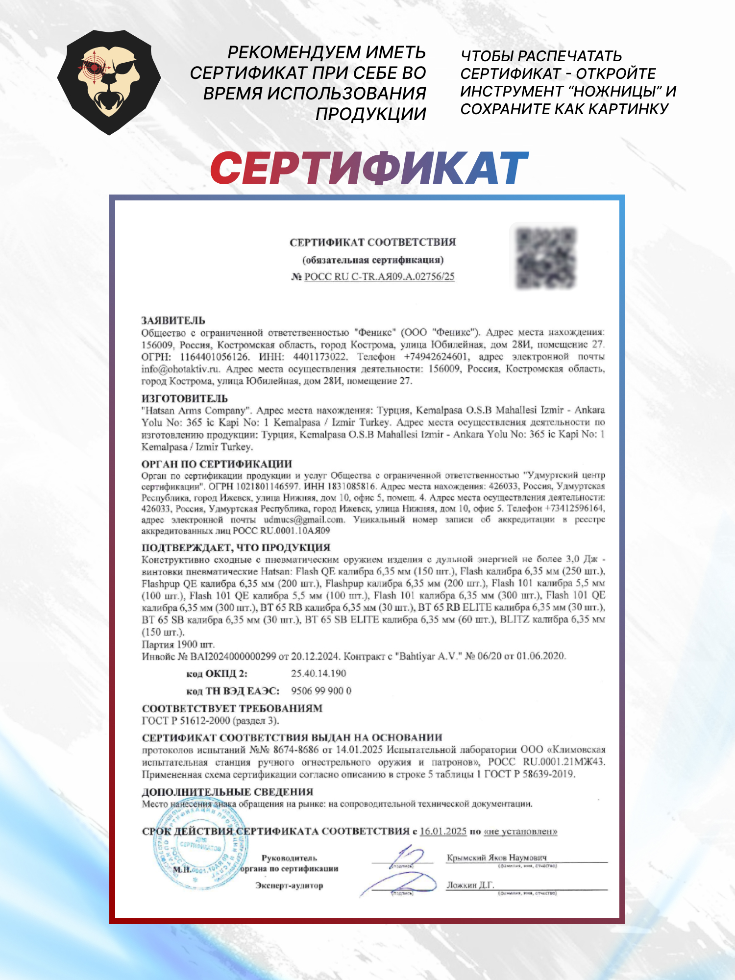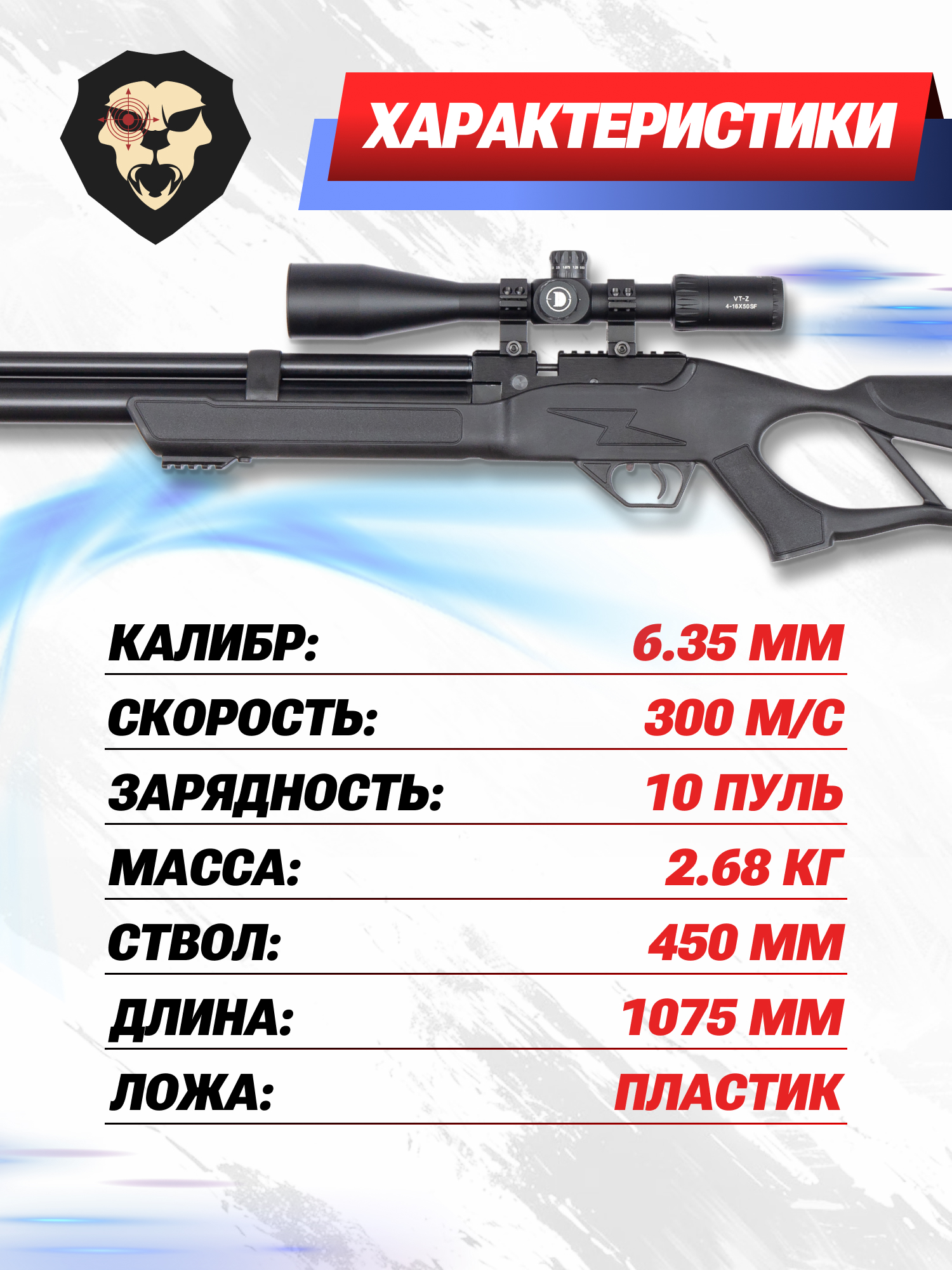 | Комплектация | Винтовка, 2 барабанных магазина, уплотнители, упаковка, заправочный штуцер, краткая документация, копия сертификата (по запросу покупателя) |