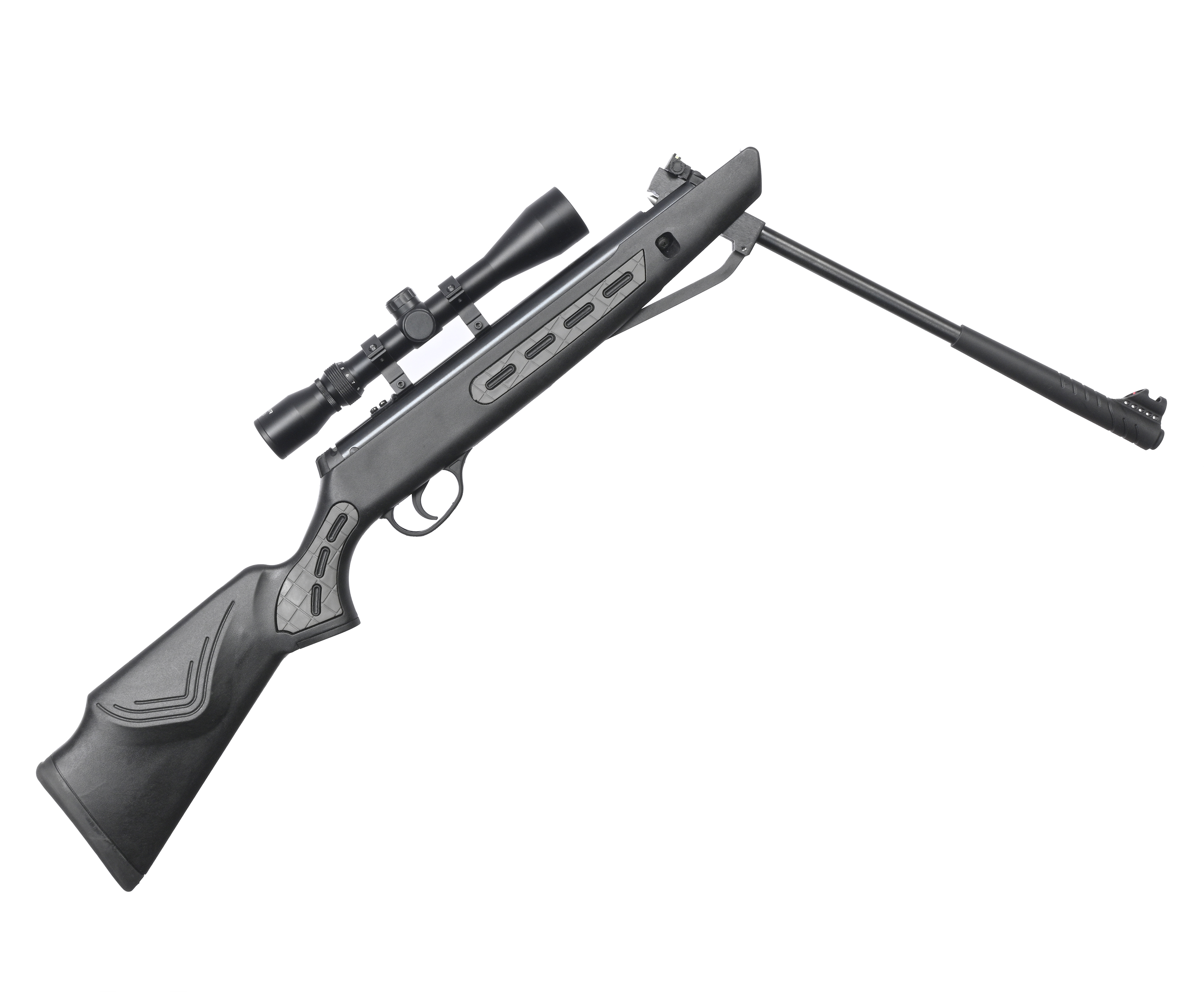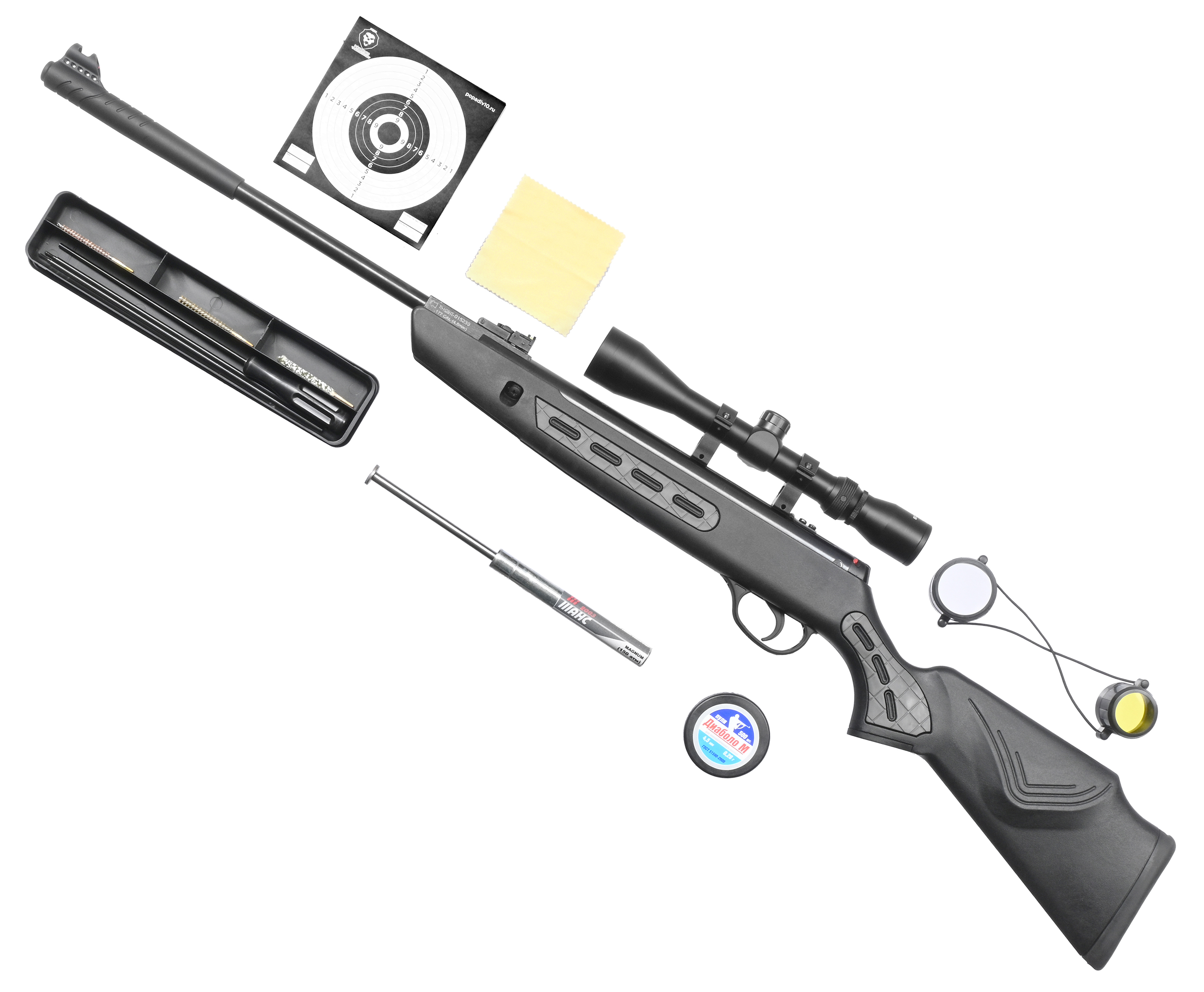 Рассматриваемый комплект основан на пружинно-поршневой винтовке от известного турецкого производителя Hatsan. Флагманскую модель 1000S снабдили нарезным бланком длиной 450 миллиметров, при этом с учетом внутреннего сечения подразумевается стрельба пулями «воланчиками» в калибре 4.5 мм. Подходящие боеприпасы вкупе с бумажными мишенями и чистящими принадлежностями поставляются совместно с пневматикой.
