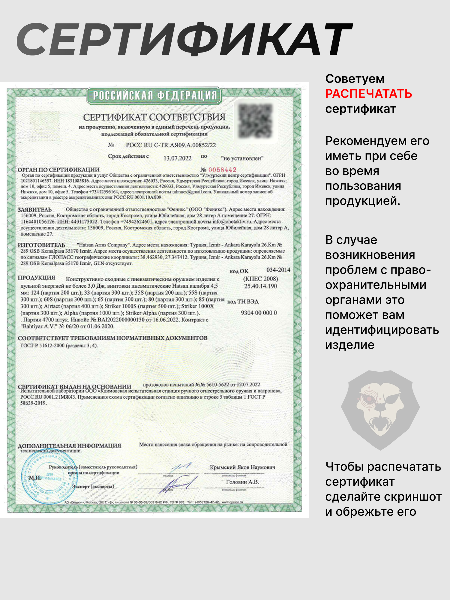 Артикул производителя 00235260 Пневматическая винтовка Hatsan Striker 1000S комплект Hunter №2 (прицел, кольца, газовая пружина, чехол, мишени, пули, набор для чистки, 3 Дж, 4.5 мм) по низкой цене 28490 руб. Модель со штрихкодом производителя Вы можете оплатить наложенным платежем с доставкой или в отделении транспортной компании (ПЭК, СДЭК, Boxberry). Ваш заказ со штрихкодом 2000000174341 забрать на почте с оплатой при получении в любой части Российской Федерации.