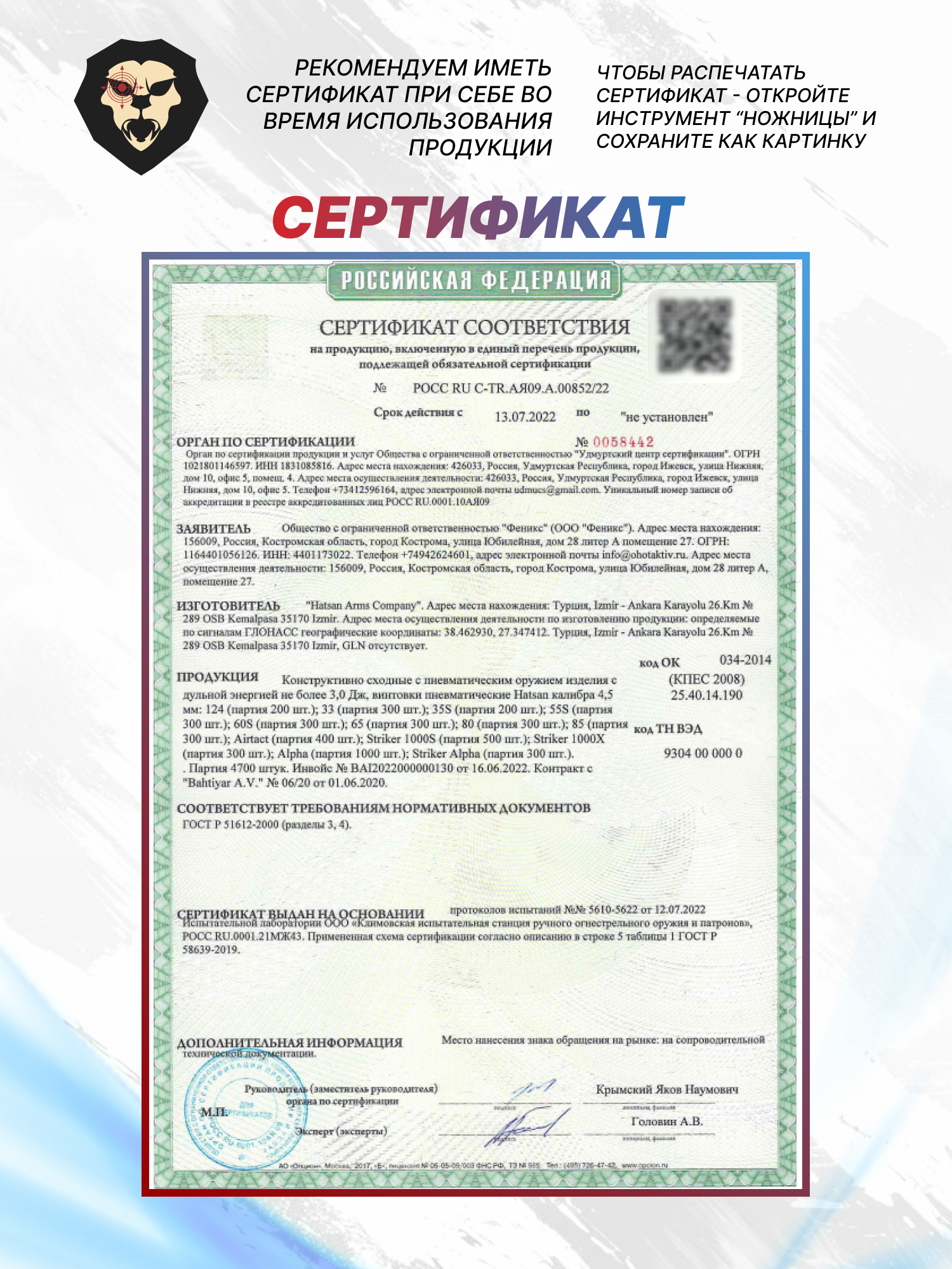 | Комплектация | Винтовка, упаковка, краткая документация, копия сертификата (по запросу покупателя) |